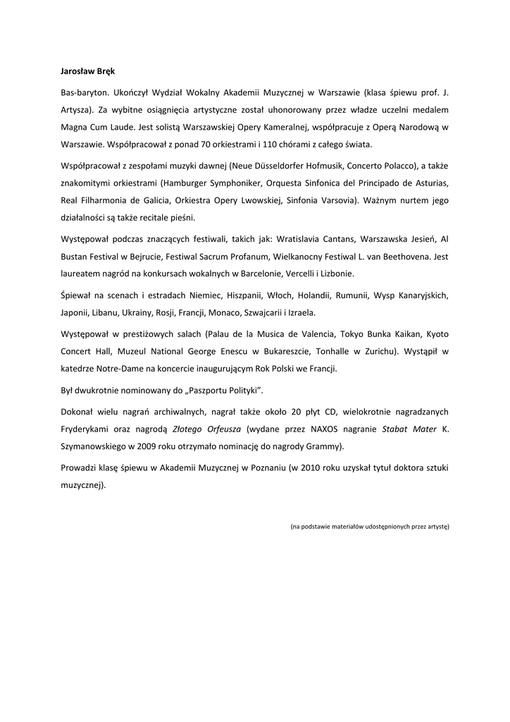 Jarosław Bręk Bas-baryton. Ukończył Wydział Wokalny Akademii Muzycznej w Warszawie (klasa śpiewu prof. J. Artysza). Za wybitne osiągnięcia artystyczne został uhonorowany przez władze uczelni medalem Magna Cum Laude. Jest solistą Warszawskiej Opery Kameralnej, współpracuje z Operą Narodową w Warszawie. Współpracował z ponad 70 orkiestrami i 110 chórami z całego świata. Współpracował z zespołami muzyki dawnej (Neue Düsseldorfer Hofmusik, Concerto Polacco), a także znakomitymi orkiestrami (Hamburger Symphoniker, Orquesta Sinfonica del Principado de Asturias, Real Filharmonia de Galicia, Orkiestra Opery Lwowskiej, Sinfonia Varsovia). Ważnym nurtem jego działalności są także recitale pieśni. Występował podczas znaczących festiwali, takich jak: Wratislavia Cantans, Warszawska Jesień, Al Bustan Festival w Bejrucie, Festiwal Sacrum Profanum, Wielkanocny Festiwal L. van Beethovena. Jest laureatem nagród na konkursach wokalnych w Barcelonie, Vercelli i Lizbonie. Śpiewał na scenach i estradach Niemiec, Hiszpanii, Włoch, Holandii, Rumunii, Wysp Kanaryjskich, Japonii, Libanu, Ukrainy, Rosji, Francji, Monaco, Szwajcarii i Izraela. Występował w prestiżowych salach (Palau de la Musica de Valencia, Tokyo Bunka Kaikan, Kyoto Concert Hall, Muzeul National George Enescu w Bukareszcie, Tonhalle w Zurichu). Wystąpił w katedrze Notre-Dame na koncercie inaugurującym Rok Polski we Francji. Był dwukrotnie nominowany do „Paszportu Polityki”. Dokonał wielu nagrań archiwalnych, nagrał także około 20 płyt CD, wielokrotnie nagradzanych Fryderykami oraz nagrodą Złotego Orfeusza (wydane przez NAXOS nagranie Stabat Mater K. Szymanowskiego w 2009 roku otrzymało nominację do nagrody Grammy). Prowadzi klasę śpiewu w Akademii Muzycznej w Poznaniu (w 2010 roku uzyskał tytuł doktora sztuki muzycznej). (na podstawie materiałów udostępnionych przez artystę)