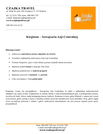 CZAJKA TRAVEL ul. Szlak 65, pok. 803 (8 piętro) 31-153 Kraków tel. 12 3121 795; kom. 506 965 755 e-mail: [email protected] www.czajkapodroze.pl NIP 685-216-22-22 Kirgistan – Szwajcaria Azji Centralnej Dlaczego warto? Zobaczysz największe jeziora alpejskie na świecie Zwiedzisz najbardziej malowniczy kraj Azji Centralnej Poznasz Kirgizów, zjesz z nimi obiad, poznasz techniki tkania dywanów Będziesz jeździł konno u stóp gór Tien Szan Będziesz podróżować w małych grupach Będziesz nocował w hotelach i w jurtach Cały czas będzie z Tobą polski pilot Kirgistan, zwany nie przypadkowo - Szwajcarią Azji Centralnej, to jeden z najbardziej malowniczych zakątków tej części świata. Znajdziemy tu zielone doliny u stóp monumentalnych gór, wysokogórskie jeziora, życzliwych ludzi, którzy nadal pielęgnują dawne tradycje. Kirgistan to kraj, gdzie bliskość z naturą jest czymś oczywistym, gdzie nocleg w jurcie u lokalnej rodziny pozwala zasmakować życia nomadów. Kraj, gdzie ciągle żywe są tradycje polowań z orłami i gdzie serdeczność mieszkańców nie jest jeszcze zepsuta przez przez przyjezdnych. kom. 506 965 755; tel. 12 3121 795 e-mail: [email protected] www.czajkapodroze.pl PROGRAM 1 dzień: Wylot z Warszawy (przesiadka w Moskwie, Stambule lub innym porcie lotniczym) do Biszkeku. 2 dzień: BISZKEK Przylot do Biszkeku w godzinach wczesnoporannych. Transfer do hotelu na nocleg. Po odpoczynku i śniadaniu, zwiedzanie stolicy Kirgistanu z lokalnym przewodnikiem, m.in. Plac Zwycięstwa, Park Dębowy, Plac Centralny Ala-Too, Muzeum Historyczne, Filharmonia. Na koniec udamy się na lokalny bazar, który jest świetnym przykładem azjatyckiego targu. Można tu dostać zawrotu głowy od kolorów, zapachów, rozmów sprzedawców. Po zakupach, tradycyjna kolacja. Nocleg w Biszkeku. 3 dzień: BISZKEK – CHON KEMIN Po śniadaniu przejazd do wąwozu Chon Kemin. Po drodze zatrzymamy się, aby zobaczyć piękny minaret z XIw. - zwany wieżą Burana, oraz skansen, gdzie zobaczymy tzw. kamienie wojowników. W wąwozie Chon Kemin zostaniemy ugoszczeni przez lokalną rodzinę, która przygotuje nam pyszny obiad. Po południu – coś specjalnego – wycieczka konna po wąwozie. Widoki i wrażenia – niezapomniane. Nocleg u rodziny. 4 dzień: CHON KEMIN – ISSYK KUL Po śniadaniu przejazd jeziora Issyk Kul, drugiego co do wielkości alpejskiego jeziora na świecie. Nie przypadkowo zbiornik nazwano Perłą Azji Centralnej. Przez ponad 1500 lat mieszkańcy uważali jezioro za święte. Miało to związek z właściwościami leczniczymi słonej wody. Nocleg w hotelu. 5 dzień: ISSYK KUL - KARAKOL Po śniadaniu ruszamy w drogę do miasteczka Karakol. Po drodze zatrzymamy się aby zobaczyć starożytne petroglify, liczące ponad 2000 lat. Napisy są pozostałością po praktykach szamańskich w tym regionie. Następnie kontynuujemy naszą podróż wzdłuż północnego brzegu jeziora do miasta Karakol. Zobaczymy tam meczet Dungan, zbudowany w stylu chińskim. Ciekawostką jest, że przy budowie meczetu nie użyto ani jednego gwoździa. Następnie zwiedzimy drewnianą Cerkiew Prawosławną. Nocleg w pensjonacie w Karakol. 6 dzień: KARAKOL – JETI OGUZ - KOCHKOR Po śniadaniu przejedziemy do wąwozu Jeti Oguz, zwanego wąwozem Siedmiu Byków. Miejsce to słynie z czerwonych skał. Zobaczymy formację skalną „Złamane serce”. Dla chętnych – około 30 minutowa wspinaczka na szczyt góry, skąd roztacza się niesamowity widok na całą okolicę. Następnie przejedziemy do miejscowości Bokonbaeva, gdzie poznamy łowcę-orła, czyli myśliwego, który poluje na zające i lisy z pomocą orła. Jest to tradycyjny sposób polowania nomadów. Po przyjeździe do miasteczka Kochkor, spotkamy się z rodziną, która pokaże techniki tkania filcowych dywanów. Nocleg w kwaterach prywatnych. 7 dzień: KOCHKOR – TASH RABAT Po śniadaniu zwiedzimy karawanseraj Tash Rabat – kamienna twierdza z XIV w. leżąca na Jedwabnym Szlaku. Budowla jest unikatowa, leży w sercu gór Tien Szan, wzniesiona z kamiennych bloków na wysokości 3200 m. n.p.m. Mieści się tam 31 komnat oraz podziemne więzienie. Po tradycyjnej kolacji, nocleg w jurtach. kom. 506 965 755; tel. 12 3121 795 e-mail: [email protected] www.czajkapodroze.pl 8 dzień: TASH RABAT – SON KUL Po śniadaniu ruszamy w drogę, aby zobaczyć drugie największe jezioro w Kirgistanie – Son Kul. Jezioro leży u stóp monumentalnych gór. Będzie czas na rozkoszowanie się krajobrazami. Nocleg w jurtach. 9 dzień: SON KUL – KYZYL OI Po śniadaniu będzie czas na relaks w okolicy jeziora. Dla chętnych możliwość wycieczki konnej. Będzie czas na poznanie życia koczowników zamieszkujących te tereny. Po popołudniu przejedziemy do miejscowości Kyzyl Oi. Droga do miasteczka jest jedną z najbardziej malowniczych w Kirgistanie. Nocleg w Kyzyl Oi w kwaterach prywatnych. 10 dzień: KYZYL OI - BISZKEK Po śniadaniu i spotkaniu z mieszkańcami Kyzyl Oi, ruszymy w drogę do Biszkeku. Droga wiedzie przez południe Kirgistanu, nie zabraknie nam więc niesamowitych widoków okolicznych gór i wąwozów. Na trasie będzie kilka przystanków, aby można było nacieszyć się widokami. Nocleg w hotelu w Biszkeku. 11 dzień: W zależności od lotów: wylot z Biszkeku w nocy/wczesnym rankiem. Przylot do Warszawy po południu. Kolejność zwiedzania może ulec zmianie. CENA OBEJMUJE: 10 noclegów zgodnie z programem (hotele 3*, 4*,pensjonaty, kwatery prywatne,jurty) Wyżywienie (śniadania i obiadokolacje) Bilety wstępu Transport zgodnie z programem: klimatyzowany bus Opiekę polskiego pilota Ubezpieczenie KL, NNW, bagażu CENA NIE OBEJMUE: Wydatków na pamiątki tel. 12 3121 795; kom. 506 965 755 e-mail: [email protected] www.czajkapodroze.pl TERMINY/CENY TERMIN CENA 01.08-11.08.2015 1770 PLN + 1270 USD + przelot 09.09-19.09.2015 1770 PLN + 1270 USD + przelot UWAGA: Część w PLN: zaliczka (500zł) płatna w biurze przed wyjazdem; pozosta