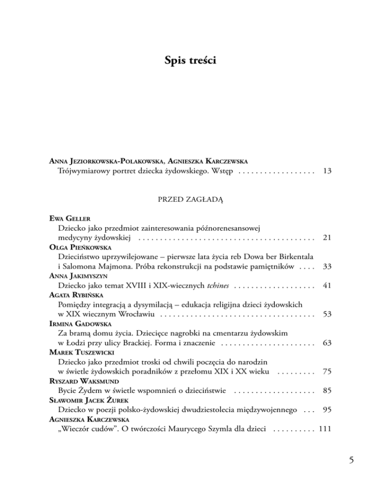 Spis treści ANNA JEZIORKOWSKA-POLAKOWSKA, AGNIESZKA KARCZEWSKA Trójwymiarowy portret dziecka żydowskiego. Wstęp . . . . . . . . . . . . . . . . . . 13 PRZED ZAGŁADĄ EWA GELLER Dziecko jako przedmiot zainteresowania późnorenesansowej medycyny żydowskiej . . . . . . . . . . . . . . . . . . . . . . . . . . . . . . . . . . . . . . . . . OLGA PIEŃKOWSKA Dzieciństwo uprzywilejowane – pierwsze lata życia reb Dowa ber Birkentala i Salomona Majmona. Próba rekonstrukcji na podstawie pamiętników . . . . ANNA JAKIMYSZYN Dziecko jako temat XVIII i XIX-wiecznych tchines . . . . . . . . . . . . . . . . . . . AGATA RYBIŃSKA Pomiędzy integracją a dysymilacją – edukacja religijna dzieci żydowskich w XIX wiecznym Wrocławiu . . . . . . . . . . . . . . . . . . . . . . . . . . . . . . . . . . . . IRMINA GADOWSKA Za bramą domu życia. Dziecięce nagrobki na cmentarzu żydowskim w Łodzi przy ulicy Brackiej. Forma i znaczenie . . . . . . . . . . . . . . . . . . . . . . MAREK TUSZEWICKI Dziecko jako przedmiot troski od chwili poczęcia do narodzin w świetle żydowskich poradników z przełomu XIX i XX wieku . . . . . . . . . RYSZARD WAKSMUND Bycie Żydem w świetle wspomnień o dzieciństwie . . . . . . . . . . . . . . . . . . . SŁAWOMIR JACEK ŻUREK Dziecko w poezji polsko-żydowskiej dwudziestolecia międzywojennego . . . AGNIESZKA KARCZEWSKA „Wieczór cudów”. O twórczości Maurycego Szymla dla dzieci . . . . . . . . . . 21 33 41 53 63 75 85 95 111 5 Spis treści ANNA JEZIORKOWSKA-POLAKOWSKA „Franiu, a te Duszki?...” – Franciszki Arnsztajnowej twórczość dla dzieci . . 127 MONIKA SZABŁOWSKA-ZAREMBA Dziecko – nasz obowiązek i radość. O walce o prawa dzieci na łamach „Naszego Przeglądu” (1923-1939) . . . . . . . . . . . . . . . . . . . . . . . 141 ANNA KRASOWSKA Obraz dziecka żydowskiego w wybranych tekstach szmoncesowych . . . . . . 159 ZAGŁADA MARTYNA GRĄDZKA Utracone dzieciństwo. Dziecko żydowskie w KL Płaszów . . . . . . . . . . . . . . WOJCIECH KUDYBA Gra i tożsamość. Dzieci żydowskie w Zakładzie dla Sierot Wojennych w Turkowicach . . . . . . . . . . . . . . . . . . . . . . . . . . . . . . . . . . . . . . . . . . . . . . JUSTYNA KOWALSKA-LEDER Dzienniki Dzieci Holokaustu – funkcje praktyki diarystycznej . . . . . . . . . . EWELINA KONOPCZYŃSKA-TOTA „Zasmucam się na widok masy czekającej na śmierć”. Zagłada w oczach Rutki Laskier . . . . . . . . . . . . . . . . . . . . . . . . . . . . . . . . . 171 183 191 201 PO ZAGŁADZIE KAROLINA MAKIEŁA Wpływ wojny na psychikę dzieci – analiza prozy Wilhelma Dichtera . . . . . MAREK SAWA Dwa literackie obrazy przestrzeni getta w narracjach Dzieci Holokaustu . . . ANNA DOBIEGAŁA Dzieci Holokaustu w prozie Hanny Krall . . . . . . . . . . . . . . . . . . . . . . . . . . MAŁGORZATA WÓJCIK-DUDEK Kiedy mały Srulek staje się bohaterem literackim – Holokaust w literaturze dla dzieci i młodzieży . . . . . . . . . . . . . . . . . . . . . . . . . . . . . . . MARIUSZ WIRSKI Sztuka jako wyzwolenie z wojennej traumy. Lista Schindlera i Dziewczynka w czerwonym płaszczyku . . . . . . . . . . . . . . . . . . . . . . . . . . . . WANDA DITTRICH Weiser Dawidek – odmieniec i święty? . . . . . . . . . . . . . . . . . . . . . . . . . . . . 6 213 223 233 245 257 265 Spis treści ANNA LATOCHA (Re)konstruowanie tożsamości żydowskiego dziecka w świadectwach emigrantów Marca ’68 . . . . . . . . . . . . . . . . . . . . . . . . . . . . . . . . . . . . . . . . 273 AGNIESZKA LENART Obserwacje wychowawcze Diny Rubinej – „żydowskiej matki na rosyjskim zakwasie” . . . . . . . . . . . . . . . . . . . . . . . . . . . . . . . . . . . . . . . . 285 MACIEJ KRZEMIŃSKI Dojrzewanie do ciała, cierpienia i winy w Odosobnieniu Georgesa-Arthura Goldschmidta . . . . . . . . . . . . . . . . . . . . . . . . . . . . . . . . . 295 Bibliografia . . . . . . . . . . . . . . . . . . . . . . . . . . . . . . . . . . . . . . . . . . . . . . . . . . . 307 Indeks osób . . . . . . . . . . . . . . . . . . . . . . . . . . . . . . . . . . . . . . . . . . . . . . . . . . . 319