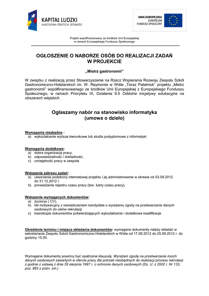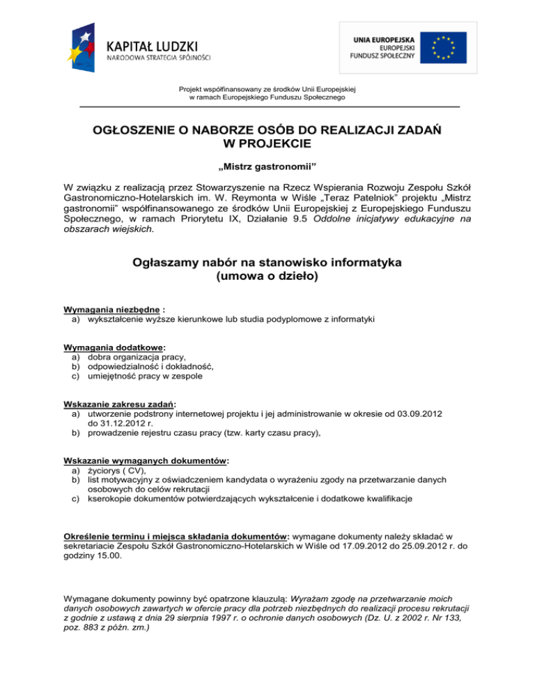 Projekt współfinansowany ze środków Unii Europejskiej w ramach Europejskiego Funduszu Społecznego OGŁOSZENIE O NABORZE OSÓB DO REALIZACJI ZADAŃ W PROJEKCIE „Mistrz gastronomii” W związku z realizacją przez Stowarzyszenie na Rzecz Wspierania Rozwoju Zespołu Szkół Gastronomiczno-Hotelarskich im. W. Reymonta w Wiśle „Teraz Patelniok” projektu „Mistrz gastronomii” współfinansowanego ze środków Unii Europejskiej z Europejskiego Funduszu Społecznego, w ramach Priorytetu IX, Działanie 9.5 Oddolne inicjatywy edukacyjne na obszarach wiejskich. Ogłaszamy nabór na stanowisko informatyka (umowa o dzieło) Wymagania niezbędne : a) wykształcenie wyższe kierunkowe lub studia podyplomowe z informatyki Wymagania dodatkowe: a) dobra organizacja pracy, b) odpowiedzialność i dokładność, c) umiejętność pracy w zespole Wskazanie zakresu zadań: a) utworzenie podstrony internetowej projektu i jej administrowanie w okresie od 03.09.2012 do 31.12.2012 r. b) prowadzenie rejestru czasu pracy (tzw. karty czasu pracy), Wskazanie wymaganych dokumentów: a) życiorys ( CV), b) list motywacyjny z oświadczeniem kandydata o wyrażeniu zgody na przetwarzanie danych osobowych do celów rekrutacji c) kserokopie dokumentów potwierdzających wykształcenie i dodatkowe kwalifikacje Określenie terminu i miejsca składania dokumentów: wymagane dokumenty należy składać w sekretariacie Zespołu Szkół Gastronomiczno-Hotelarskich w Wiśle od 17.09.2012 do 25.09.2012 r. do godziny 15.00. Wymagane dokumenty powinny być opatrzone klauzulą: Wyrażam zgodę na przetwarzanie moich danych osobowych zawartych w ofercie pracy dla potrzeb niezbędnych do realizacji procesu rekrutacji z godnie z ustawą z dnia 29 sierpnia 1997 r. o ochronie danych osobowych (Dz. U. z 2002 r. Nr 133, poz. 883 z późn. zm.)