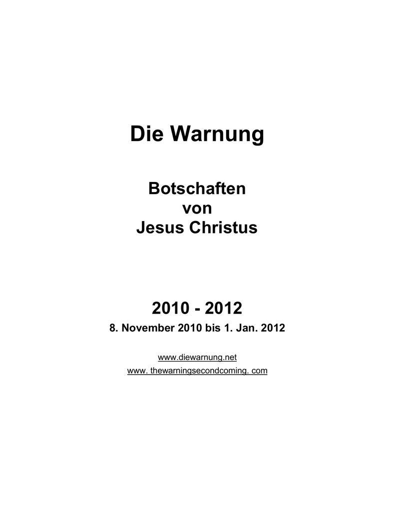 Die Warnung Botschaften von Jesus Christus 2010 - 2012 8. November 2010 bis 1. Jan. 2012 www.diewarnung.net www. thewarningsecondcoming. com Inhalt Einführung .............................................................................................................. 14 Erste Botschaft von der Jungfrau Maria, Montag, 8. November 2010, 15:30 Uhr nach dem Beten des Rosenkranzes zuhause ...................................................... 17 Erste Botschaft, empfangen von unserem Erlöser Jesus Christus, Donnerstag, 9. November 2010, 3:00 Uhr................................................................................... 19 Der Menschheit steht die endgültige Reinigung bevor, Donnerstag, 11. November 2010, 12:20 Uhr..................................................................................... 21 Zweite Botschaft der Jungfrau Maria, Donnerstag, 11. November 2010, 12:20 Uhr ........................................................................................................................... 21 Die Sünden brechen Mein Heiligstes Herz, Freitag, 12. November 2010, 3:00 Uhr ................................................................................................................................. 22 Dieses Buch wird Leben ändern, Seelen retten, Freitag, 12. November 2010, 3:00 Uhr ................................................................................................................... 23 Die Warnung vor der Hölle und die Verheißung des Paradieses, Samstag, 13. November 2010, 3:00 Uhr....................................................................................... 23 Das Zeichen vom Ende der Zeiten – Aber die Glorie wird zur Erde zurückkehren, Sonntag, 14. November 2010, 23:00 Uhr ..................................... 27 Das Zweite Kommen, Montag, 15. November 2010, 3:00 Uhr ............................. 29 Globale Macht, der Antichrist und das Zeichen des Tieres, Montag, 15. November 2010, 11Uhr........................................................................................... 31 Warnung an den Klerus, Donnerstag, 16. November 2010, 9:55 Uhr................. 35 Wirf alle Zweifel beiseite, Donnerstag, 16. November 2010, 23 Uhr ................... 38 Botschaft an Agnostiker und Atheisten, Donnerstag, 18. November 2010, 21 Uhr ........................................................................................................................... 40 Erhebung von satanischen Gruppen und die Weltkontrolle, Samstag, 20. November 2010, 7:20 Uhr....................................................................................... 41 Bekehrung, Sonntag, 21. November 2010, 1:00 Uhr............................................ 45 Aufruf an alle Kirchen und Konfessionen zur Einheit gegen das Böse, Sonntag, 21. November 2010, 15 Uhr .................................................................................... 48 Die Große Warnung – ein Geschenk der Barmherzigkeit, Montag, 22. November 2010, 2:00 Uhr ......................................................................................................... 49 Warnung vor dem Atomkrieg, Donnerstag, 23. November 2010, 3:00 Uhr ........ 52 Treppe zur spirituellen Vollkommenheit, Mittwoch, 24. November 2010, 2:30 Uhr ................................................................................................................................. 53 Globaler Plan zum Abbau der Weltbevölkerung und Sturz der Führer der Welt, Freitag, 26. November 2010, 3 Uhr ........................................................................ 54 Buch der Offenbarung Freitag, 26. November 2010, 0:00 Uhr, Mitternacht....... 58 Aufruf an die Gläubigen, verlorene Seelen zu bekehren, Freitag, 26. November 2010, 00:00 Uhr Mitternacht ................................................................................... 59 Verfolgung der wirklichen Visionäre, Montag, 29. November 2010; 12:48 Uhr . 61 Suche nach Wohlstand, Dienstag, 30. November 2010, 12 Uhr Mittag .............. 63 Die Warnung an die Menschheit, um die Wahrheit zu verstehen, Dienstag, 7. Dezember 2010, 3:15 Uhr ....................................................................................... 66 Das Nächste Leben, Samstag, 11. Dezember 2010, 9:15 Uhr ............................. 67 Aufruf, Mord / Abtreibung zu stoppen, Donnerstag, 16. Dezember 2010, 13:10 Uhr ........................................................................................................................... 70 Das Buch der Wahrheit, Samstag, 18. Dezember 2010, 9:40 Uhr ....................... 71 Die große Drangsal, Montag, 20. Dezember 2010, 10:00 Uhr.............................. 74 Dritte Botschaft der Jungfrau Maria Montag, 20. Dezember 2010 ...................... 76 Der Schmerz, den Jesus heute erleidet, Donnerstag, 22. Dezember 2010, 2:40 Uhr ........................................................................................................................... 77 2 Warum bin Ich Mensch geworden? Freitag, 24. Dezember 2010, 20:00 – 22:15 Uhr ........................................................................................................................... 77 Falsche Lehrer und Propheten, Dienstag, 25. Dezember 2010, 10:30 Uhr......... 79 Weihnachten feiern, Dienstag, 25. Dezember 2010, 13:30 Uhr ........................... 81 Warnung an die Gläubigen, echte Propheten nicht zu verwerfen, Donnerstag, 28. Dezember 2010, 11:00 Uhr ............................................................................... 82 Zensuren der Medien und andere Zensuren kommen, Samstag, 1. Januar 2011, 2 Uhr morgens ........................................................................................................ 85 Wie die Warnung ein Geschenk für die Menschheit ist, Sonntag, 2. Januar 2011, 21:45 Uhr ................................................................................................................. 88 2011, Jahr der Läuterung, 11. und 12. Januar 2011, 