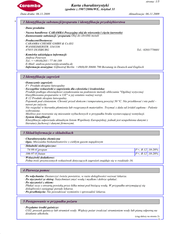 DR strona: 1/5 Karta charakterystyki zgodnie z 1907/2006/WE, Artykuł 31 Data druku: 06.11.2009 * Aktualizacja: 06.11.2009 1 Identyfikacja substancji/preparatu i identyfikacja przedsiębiorstwa · Dane produktu · Nazwa handlowa: CARAMBA Precyzyjny olej do wiercenia i cięcia (aerosole) · Zastosowanie substancji / preparatu Olej do obróbki metali · Producent/Dostawca: CARAMBA CHEMIE GMBH & Co.KG WANHEIMERSTR. 334/336 47055 DUISBURG Tel.: 0203/778601 · Komórka udzielająca informacji: Andrea Petersen Tel.:++49/(0)203 / 77 86 189 E-Mail: [email protected] · Informacja awaryjna: Giftnotruf Berlin +49(0)30 30686 790 Beratung in Deutsch und Englisch 2 Identyfikacja zagrożeń · Oznaczenie zagrożeń: F+ Produkt skrajnie łatwopalny · Szczególne wskazówki o zagrożeniu dla człowieka i środowiska: Produkt podlega obowiązkowi oznakowania na podstawie metody obliczania "Ogólnej wytycznej klasyfikowania preparatów w UE" w jej ostatnio ważnej wersji. R 12 Produkt skrajnie łatwopalny. Pojemnik pod ciśnieniem. Chronić przed słońcem i temperaturą powyżej 50 °C. Nie przekłuwać i nie palić nawet po zużyciu. Nie rozpylać w kierunku płomienia lub rozgrzanych materiałów. Trzymać z dala od źródeł zapłonu - Palenie wzbronione. Możliwe jest tworzenie się mieszanin wybuchowych w przypadku braku wystarczającej wentylacji. · System klasyfikacji: Klasyfikacja odpowiada aktualnym listom Wspólnoty Europejskiej, jednak jest uzupełniona danymi z literatury fachowej i danymi firmowymi. 3 Skład/informacja o składnikach · Charakterystyka chemiczna · Opis: Mieszanka biokatalizatorów z ciekłym gazem napędowym · Składniki niebezpieczne: 74-98-6 propan F+; R 12 10-20% 106-97-8 butan F+; R 12 10-20% · Wskazówki dodatkowe: Pełna treść przytoczonych wskazówek dotyczących zagrożeń znajduje się w rozdziale 16. 4 Pierwsza pomoc · Po wdychaniu: Dostarczyć świeże powietrze, w razie dolegliwości wezwać lekarza. · Po styczności ze skórą: Natychmiast zmyć wodą i mydłem i dobrze spłukać. · Po styczności z okiem: Płukać oczy z otwartą powieką przez kilka minut pod bieżącą wodą. W przypadku utrzymującej się dolegliwości zasięgnąć porady lekarza. · Po przełknięciu: Nie powodować wymiotów i sprowadzić lekarza. 5 Postępowanie w przypadku pożaru · Przydatne środki gaśnicze: CO2, proszek gaśniczy lub strumień wody. Większy pożar zwalczać strumieniem wody lub pianą odporną na działanie alkoholu. (ciąg dalszy na stronie 2) PL DR strona: 2/5 Karta charakterystyki zgodnie z 1907/2006/WE, Artykuł 31 Data druku: 06.11.2009 Aktualizacja: 06.11.2009 Nazwa handlowa: CARAMBA Precyzyjny olej do wiercenia i cięcia (aerosole) (ciąg dalszy od strony 1) · Środki gaśnicze nieprzydatne ze względów bezpieczeństwa: Woda pełnym strumieniem · Szczególne zagrożenie ze strony materiału, produktów jego spalania lub powstających gazów: Może tworzyć eksplozywne mieszaniny gaz-powietrze. · Specjalne wyposażenie ochronne: Środki specjalne nie są konieczne. 6 Postępowanie w przypadku niezamierzonego uwolnienia do środowiska · Środki ostrożności dostosowane do danej osoby: Nosić ubranie ochronne. Osoby nie zabezpieczone przenieść w bezpieczne miejsce. · Środki ochrony środowiska: Szczególne środki nie są konieczne. · Metoda oczyszczania/ wchłaniania: Zadbać o wystarczające przewietrzenie. 7 Postępowanie z substancją/preparatem i jej/jego magazynowanie · Sposób obchodzenia się: · Wskazówki dla bezpiecznego użytkowania: Zadbać o dobry nawiew /odsysanie w miejscu pracy. · Wskazówki dla ochrony przeciwpożarowej i przeciwwybuchowej: Mieć w pogotowiu przyrządy do ochrony dróg oddechowych. · Składowanie: · Wymagania w stosunku do pomieszczeń składowych i zbiorników: Przechowywać tylko w ogrzewanych zbiornikach. · Wskazówki odnośnie wspólnego składowania: Nie konieczne. · Dalsze wskazówki odnośnie warunków składowania: Składować w dobrze zamkniętych beczkach w chłodnym i suchym miejscu. Chronić przed gorącem i bezpośrednim promieniowaniem słonecznym. 8 Kontrola narażenia i środki ochrony indywidualnej · Dodatkowe wskazówki dla wykonania urządzeń technicznych: Brak dalszych danych, patrz punkt 7. · Składniki wraz z kontrolowanymi wartościami granicznymi zależnymi od miejsca pracy: 74-98-6 propan NDS (PL) 1800 mg/m3 106-97-8 butan NDS (PL) NDSCh: 3000 mg/m3 NDS: 1900 mg/m3 · Wskazówki dodatkowe: Podstawą były aktualnie obowiązujące wykazy. · Osobiste wyposażenie ochronne: · Ogólne środki ochrony i higieny: Należy przestrzegać zwyczajne środki ostrożności przy obchodzeniu się z chemikaliami. Nie wdychać gazów/ par / aerozoli. · Ochrona dróg oddechowych: Przy niewystarczającej wentylacji ochrona dróg oddechowych. · Ochrona rąk: Rękawice- olejoodporne · Materiał, z którego wykonane są rękawice Rękawice z PCW · Czas penetracji dla materiału, z którego wykonane są rękawice Wartość przenikania: poziom ≥ 480 · Ochrona oczu: Okulary ochronne 9 Właściwości fizyczne i chemiczne · Ogólne dane Forma: Kolor: Aerozol Žółty (ciąg dalszy na stronie 3) PL DR strona: 3/5 Karta charakterystyki zgodnie z 1907/2006/WE, Artykuł 31 Data druku: 06.11.2009 Aktualizacja: 06.11.2009 Nazwa handlowa: CARAMBA Precyzyjny olej do wiercenia i cięcia (aerosole) (ciąg dalszy od strony 2) Zapach: Charakterystyczny · Zmiana stanu Punkt topnienia/ Zakres topnienia: Nie jest określony. -44°C Punkt wrzenia/ Zakres wrzenia: · Punkt zapłonu: -97°C (DIN 53 213) · Temperatura palenia się: 365°C · Samozapłon: Produkt nie jest samozapalny. · Niebezpieczeństwo wybuchu: Podczas stosowania mogą powstawać łatwopalne lub wybuchowe mieszaniny par z powietrzem. · Gęstość w 20°C: 0,9 g/cm3 (DIN 51 757) · Rozpuszczalność w/ mieszalność z Woda: Nie lub mało mieszalny. 10 Stabilność i reaktywność · Rozkład termiczny/ warunki których należy unikać: 