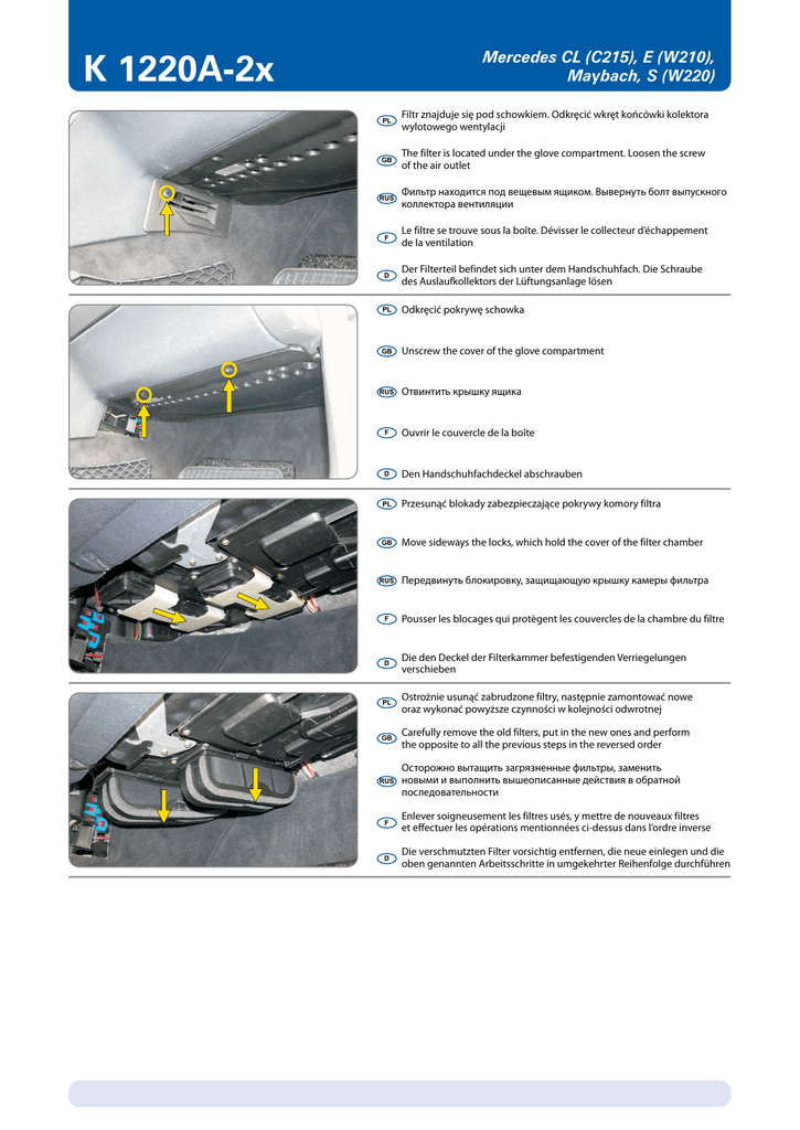 K 1220A-2x Mercedes CL (C215), E (W210), Maybach, S (W220) PL Filtr znajduje się pod schowkiem. Odkręcić wkręt końcówki kolektora wylotowego wentylacji GB The filter is located under the glove compartment. Loosen the screw of the air outlet RUS Фильтр находится под вещевым ящиком. Вывернуть болт выпускного коллектора вентиляции F Le filtre se trouve sous la boîte. Dévisser le collecteur d’échappement de la ventilation D Der Filterteil befindet sich unter dem Handschuhfach. Die Schraube des Auslaufkollektors der Lüftungsanlage lösen PL Odkręcić pokrywę schowka GB Unscrew the cover of the glove compartment RUS Отвинтить крышку ящика F Ouvrir le couvercle de la boîte D Den Handschuhfachdeckel abschrauben PL Przesunąć blokady zabezpieczające pokrywy komory filtra GB Move sideways the locks, which hold the cover of the filter chamber RUS Передвинуть блокировку, защищающую крышку камеры фильтра F Pousser les blocages qui protègent les couvercles de la chambre du filtre D Die den Deckel der Filterkammer befestigenden Verriegelungen verschieben PL Ostrożnie usunąć zabrudzone filtry, następnie zamontować nowe oraz wykonać powyższe czynności w kolejności odwrotnej GB Carefully remove the old filters, put in the new ones and perform the opposite to all the previous steps in the reversed order RUS Осторожно вытащить загрязненные фильтры, заменить новыми и выполнить вышеописанные действия в обратной последовательности F Enlever soigneusement les filtres usés, y mettre de nouveaux filtres et effectuer les opérations mentionnées ci-dessus dans l’ordre inverse D Die verschmutzten Filter vorsichtig entfernen, die neue einlegen und die oben genannten Arbeitsschritte in umgekehrter Reihenfolge durchführen