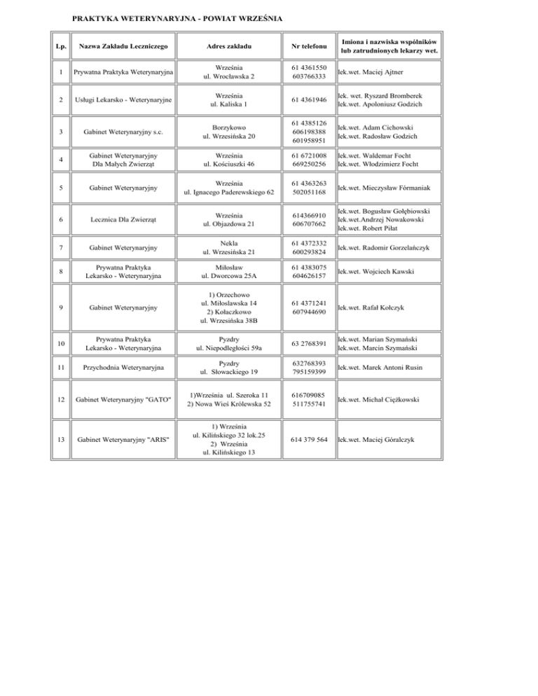 PRAKTYKA WETERYNARYJNA - POWIAT WRZEŚNIA Imiona i nazwiska wspólników lub zatrudnionych lekarzy wet. Lp. Nazwa Zakładu Leczniczego Adres zakładu Nr telefonu 1 Prywatna Praktyka Weterynaryjna Września ul. Wrocławska 2 61 4361550 603766333 lek.wet. Maciej Ajtner 2 Usługi Lekarsko - Weterynaryjne Września ul. Kaliska 1 61 4361946 lek. wet. Ryszard Bromberek lek.wet. Apoloniusz Godzich 3 Gabinet Weterynaryjny s.c. Borzykowo ul. Wrzesińska 20 61 4385126 606198388 601958951 lek.wet. Adam Cichowski lek.wet. Radosław Godzich 4 Gabinet Weterynaryjny Dla Małych Zwierząt Września ul. Kościuszki 46 61 6721008 669250256 lek.wet. Waldemar Focht lek.wet. Włodzimierz Focht 5 Gabinet Weterynaryjny Września ul. Ignacego Paderewskiego 62 61 4363263 502051168 lek.wet. Mieczysław Fórmaniak 6 Lecznica Dla Zwierząt Września ul. Objazdowa 21 614366910 606707662 lek.wet. Bogusław Gołębiowski lek.wet.Andrzej Nowakowski lek.wet. Robert Piłat 7 Gabinet Weterynaryjny Nekla ul. Wrzesińska 21 61 4372332 600293824 lek.wet. Radomir Gorzelańczyk 8 Prywatna Praktyka Lekarsko - Weterynaryjna Miłosław ul. Dworcowa 25A 61 4383075 604626157 lek.wet. Wojciech Kawski 9 Gabinet Weterynaryjny 1) Orzechowo ul. Miłoslawska 14 2) Kołaczkowo ul. Wrzesińska 38B 61 4371241 607944690 lek.wet. Rafał Kołczyk 10 Prywatna Praktyka Lekarsko - Weterynaryjna Pyzdry ul. Niepodległości 59a 63 2768391 lek.wet. Marian Szymański lek.wet. Marcin Szymański 11 Przychodnia Weterynaryjna Pyzdry ul. Słowackiego 19 632768393 795159399 lek.wet. Marek Antoni Rusin 12 Gabinet Weterynaryjny "GATO" 1)Września ul. Szeroka 11 2) Nowa Wieś Królewska 52 616709085 511755741 lek.wet. Michał Ciężkowski Gabinet Weterynaryjny "ARIS" 1) Września ul. Kilińskiego 32 lok.25 2) Września ul. Kilińskiego 13 614 379 564 lek.wet. Maciej Góralczyk 13
