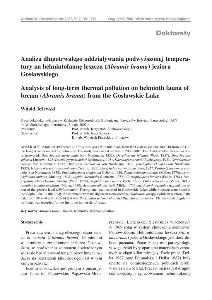 Wiadomoœci Parazytologiczne 2007, 53(4), 351–353 Copyright© 2007 Polskie Towarzystwo Parazytologiczne Doktoraty Analiza długotrwałego oddziaływania podwyższonej tempera− tury na helmintofaunę leszcza (Abramis brama) jeziora Gosławskiego Analysis of long−term thermal pollution on helminth fauna of bream (Abramis brama) from the Gosławskie Lake Witold Jeżewski Praca doktorska wykonana w Zakładzie Różnorodności Biologicznej Pasożytów Instytutu Parazytologii PAN im W. Stefańskiego i obroniona 15 maja 2007 r. Promotor: Prof. dr hab. Krzysztofa Zdzitowieckiego Recenzenci: Prof. dr hab. Jerzy Rokicki Dr hab. Wojciech Piasecki, prof. nadzw. ABSTRACT. A total of 490 bream (Abramis brama) (250 individuals from the Gosławskie lake and 240 from the Go− pło lake) were examined for helminths. The study was carried out within 2000−2002. Twenty−two helminth species we− re recovered: Dactylogyrus auriculatus (von Nordmann, 1832), Dactylogyrus falcatus (Wedl, 1857), Dactylogyrus sphyrna Linstow, 1878, Dactylogyrus wunderi Bychowsky, 1931, Dactylogyrus zandti Bychowsky, 1933, Gyrodactylus elegans von Nordmann, 1832, Diplozoon paradoxum von Nordmann, 1832, Tylodelphys clavata (von Nordmann, 1832), Ichthyocotylurus platycephalus (Creplin, 1825), Bucephalus polymorphus Baer, 1827, Posthodiplostomum cuti− cola (von Nordmann, 1832), Phyllodistomum elongatum Nybelin, 1926, Sphaerostomum bramae (Müller, 1776), Asym− phylodora imitans (Mühling, 1898), Ligula intestinalis (Linnaeus, 1758), Caryophyllaeus laticeps (Pallas, 1781), Neo− gryporhynchus cheilancristrotus (Wedl, 1855), Raphidascaris acus (Bloch, 1779), Philometra ovata (Zeder, 1803), Acanthocephalus anguillae (Müller, 1780), Acanthocephalus lucii (Müller, 1776) and Acanthocephalus sp., and one ta− xon of the generic level (Diplostomum). Twenty−one taxa occurred in Gosławskie Lake, while nineteen were noted in the Gopło Lake. In this study the dominant were the digenean matacercariae (Diplostomum spp.) while in relation to the data from 1972−74 and 1982−84 that was Bucephalus polymorphus and Dactylogyrus wunderi. Plerocercoids Ligula in− testinalis was recorded for the first time in muscle of bream. Key words: Abramis brama, bream, helminths, thermal pollution. Streszczenie Praca zawiera analizę obecnego stanu zara− żenia leszcza (Abramis brama) helmintami w termicznie zmienionym jeziorze Gosław− skim, w porównaniu ze stanem stwierdzonym w czasie badań prowadzonych przez innych ba− daczy na przestrzeni kilkudziesięciu lat w tym samym jeziorze. Jezioro Gosławskie jest jednym z pięciu je− zior (inne to; Pątnowskie, Wąsowsko−Miko− rzyńskie, Licheńskie, Ślesińskie) włączonych w 1969 roku w system chłodzenia elektrowni Pątnów−Konin. Helmintofauna leszcza (Abra− mis brama) jeziora Gosławskiego jest dość do− brze poznana. Prace z zakresu parazytologii w większości były oparte na materiałach zebra− nych w ciągu kilku miesięcy. Dwie prace (Dzi− ka 1987 oraz Pojmańska i Dzika 1987) były oparte na comiesięcznych poborach prób, w okresie dwóch lat. Praca niniejsza jest drugim comiesięcznym opracowaniem helmintofauny 352 leszcza w tym zbiorniku. W celach porównaw− czych, równolegle przeprowadzono badania le− szcza w jeziorze Gopło, którego wody nie są sztucznie podgrzewane. Badania prowadzono od grudnia 2000 do końca 2002 roku. Miesięcznie badano próbę po dziesięć leszczy z każdego jeziora. Zarażenie przez Monogenea badano w ciągu jednego ro− ku, zaś przez pozostałe helminty w ciągu dwóch lat. Przebadano 490 osobników leszcza (Abra− mis brama), 250 z jeziora Gosławskiego i 240 z jeziora Gopło. W badanych jeziorach stwier− dzono 22 gatunki pasożytów, rekrutujące się spośród Monogenea, Digenea, Cestoda, Nema− toda i Acanthocephala oraz jedną grupę zbior− czą obejmującą przedstawicieli rodzaju Diplo− stomum. W jeziorze Gosławskim zebrano prawie dwukrotnie większą liczbę pasożytów (35742 osobniki) niż w jeziorze Gopło (18302). Hel− mintofauna jeziora Gosławskiego w porówna− niu z jeziorem Gopło jest bogatsza o 3 gatunki pasożytów, rekrutujące się spośród: Digenea (Bucephalus polymorphus); Cestoda (Ligula in− testinalis) oraz Acanthocephala (Acanthoce− phalus lucii). Tylko w Gople stwierdzono jeden gatunek kolcogłowa, Acanthocephalus sp. W strukturze helmintofauny leszcza (Abra− mis brama) zaznaczyła się większość typów zmian, które obserwowano w jeziorze Gosław− skim w poprzednich okresach badawczych, w porównaniu z zarażeniem leszcza w jeziorze Gopło, o naturalnej termice wody (Pojmańska i in. 1980; Pojmańska i Dzika 1987; Dzika 1987). Obecnie struktura dominacji jest inna niż w latach 1972–74 i 1982–1984. Dominują Di− genea z rodzaju Diplostomum. W latach 1972–74 najliczniejsze były także Digenea, ale z gatunku Bucephalus polymorphus, w okre− sie1982−1984 dominowały Monogenea z gatun− ku Dactylogyrus wunderi. W jeziorze Gosławskim, na przestrzeni trzy− dziestu lat obserwujemy wzrost liczebności po− pulacji tasiemca Caryophyllaeus laticeps. Eks− tensywność zarażenia tym gatunkiem w chwili W. Je¿ewski obecnej wynosi 55,2%, w latach 80. było to 33,2%, zaś w okresie najwcześniejszych bada− niach 26%. Wskazuje to na dobre warunki do rozwoju żywicieli pośrednich tego tasiemca. Spadek liczebności pasożytów widoczny jest na przykładzie przywr z gatunku Bucephalus poly− morphus. Ekstensywność zarażenia tym gatun− kiem w chwili obecnej wynosi tylko 2%, w la− tach 80. było to 31,7%, zaś w okresie najwcze− śniejszych badaniach (lata 70.) przywra ta była gatunkiem dominującym w parazytofaunie le− szcza jeziora Gosławskiego (eks. 84%), jak i je− ziora Gopło (eks. 77%). W obecnych bada− niach, nie odnotowano występowania tej przy− wry w jeziorze Gopło, podobnie jak w jeziorach Pojezierza Mazurskiego (Dzika 2003). Jest 
