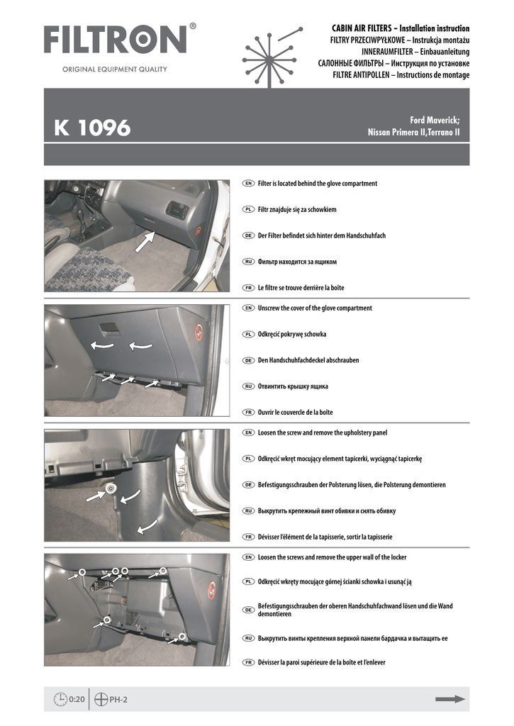 CABIN AIR FILTERS – Installation instruction FILTRY PRZECIWPYŁKOWE – Instrukcja montażu INNERAUMFILTER – Einbauanleitung САЛОННЫЕ ФИЛЬТРЫ – Инструкция по установке FILTRE ANTIPOLLEN – Instructions de montage K 1096 Ford Maverick; Nissan Primera II,Terrano II Filter is located behind the glove compartment Filtr znajduje się za schowkiem Der Filter befindet sich hinter dem Handschuhfach Фильтр находится за ящиком Le filtre se trouve derrière la boîte Unscrew the cover of the glove compartment Odkręcić pokrywę schowka Den Handschuhfachdeckel abschrauben Отвинтить крышку ящика Ouvrir le couvercle de la boîte Loosen the screw and remove the upholstery panel Odkręcić wkręt mocujący element tapicerki, wyciągnąć tapicerkę Befestigungsschrauben der Polsterung lösen, die Polsterung demontieren Выкрутить крепежный винт обивки и снять обивку Dévisser l’élément de la tapisserie, sortir la tapisserie Loosen the screws and remove the upper wall of the locker Odkręcić wkręty mocujące górnej ścianki schowka i usunąć ją Befestigungsschrauben der oberen Handschuhfachwand lösen und die Wand demontieren Выкрутить винты крепления верхной панели бардачка и вытащить ее Dévisser la paroi supérieure de la boîte et l’enlever 0:20 PH-2 CABIN AIR FILTERS – Installation instruction FILTRY PRZECIWPYŁKOWE – Instrukcja montażu · INNERAUMFILTER – Einbauanleitung · САЛОННЫЕ ФИЛЬТРЫ – Инструкция по установке · FILTRE ANTIPOLLEN – Instructions de montage K 1096 1165-2x K 1165A-2x Remove the cover from the filter chamber Zdemontować osłonę komory filtra Die Filterteilabdeckung demontieren Демонтировать кожух камеры фильтра Démonter le capot de la chambre du filtre Loosen the screws of the filter housing. Remove the housing Odkręcić śrubę mocującą pokrywy filtra. Usunąć pokrywę filtra Die Befestigungsschrauben der Filterabdeckung lösen. Die Filterabdeckung entfernen Отвинтить шуруп, крепящий крышку фильтра. Вытащить крышку фильтра Dévisser les couvercles du filtre. Enlever le couvercle du filtre Gently remove the old filter, put in the new one and carry out the opposite to all the previously mentioned operations in the reversed order Ostrożnie usunąć zabrudzony filtr, następnie zamontować nowy oraz wykonać powyższe czynności w kolejności odwrotnej Das verschmutzte Filter vorsichtig abnehmen, das neue einlegen und die oben genannten Arbeitsschritte in umgekehrter Reihenfolge durchführen Осторожно удалить загрязненный фильтр, затем вмонтировать новый и выполнить те же действия в обратной последовательности Enlever soigneusement le filtre usé, en installer un nouveau et réaliser les opérations mentionnées ci-dessus dans l’ordre inverse WIX-FILTRON SP. Z O.O. UL. WROCŁAWSKA 145, 63-800 GOSTYŃ, POLAND TEL.:+48 65 572 89 00 FAX: +48 65 572 89 22 www.filtron.eu e-mail: [email protected]