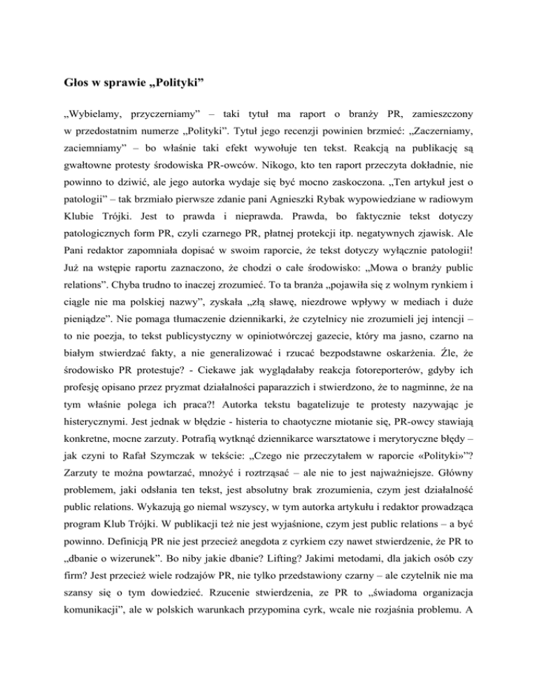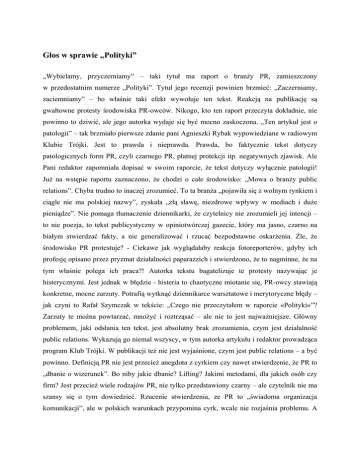 Głos w sprawie „Polityki” „Wybielamy, przyczerniamy” – taki tytuł ma raport o branży PR, zamieszczony w przedostatnim numerze „Polityki”. Tytuł jego recenzji powinien brzmieć: „Zaczerniamy, zaciemniamy” – bo właśnie taki efekt wywołuje ten tekst. Reakcją na publikację są gwałtowne protesty środowiska PR-owców. Nikogo, kto ten raport przeczyta dokładnie, nie powinno to dziwić, ale jego autorka wydaje się być mocno zaskoczona. „Ten artykuł jest o patologii” – tak brzmiało pierwsze zdanie pani Agnieszki Rybak wypowiedziane w radiowym Klubie Trójki. Jest to prawda i nieprawda. Prawda, bo faktycznie tekst dotyczy patologicznych form PR, czyli czarnego PR, płatnej protekcji itp. negatywnych zjawisk. Ale Pani redaktor zapomniała dopisać w swoim raporcie, że tekst dotyczy wyłącznie patologii! Już na wstępie raportu zaznaczono, że chodzi o całe środowisko: „Mowa o branży public relations”. Chyba trudno to inaczej zrozumieć. To ta branża „pojawiła się z wolnym rynkiem i ciągle nie ma polskiej nazwy”, zyskała „złą sławę, niezdrowe wpływy w mediach i duże pieniądze”. Nie pomaga tłumaczenie dziennikarki, że czytelnicy nie zrozumieli jej intencji – to nie poezja, to tekst publicystyczny w opiniotwórczej gazecie, który ma jasno, czarno na białym stwierdzać fakty, a nie generalizować i rzucać bezpodstawne oskarżenia. Źle, że środowisko PR protestuje? - Ciekawe jak wyglądałaby reakcja fotoreporterów, gdyby ich profesję opisano przez pryzmat działalności paparazzich i stwierdzono, że to nagminne, że na tym właśnie polega ich praca?! Autorka tekstu bagatelizuje te protesty nazywając je histerycznymi. Jest jednak w błędzie - histeria to chaotyczne miotanie się, PR-owcy stawiają konkretne, mocne zarzuty. Potrafią wytknąć dziennikarce warsztatowe i merytoryczne błędy – jak czyni to Rafał Szymczak w tekście: „Czego nie przeczytałem w raporcie «Polityki»”? Zarzuty te można powtarzać, mnożyć i roztrząsać – ale nie to jest najważniejsze. Główny problemem, jaki odsłania ten tekst, jest absolutny brak zrozumienia, czym jest działalność public relations. Wykazują go niemal wszyscy, w tym autorka artykułu i redaktor prowadząca program Klub Trójki. W publikacji też nie jest wyjaśnione, czym jest public relations – a być powinno. Definicją PR nie jest przecież anegdota z cyrkiem czy nawet stwierdzenie, że PR to „dbanie o wizerunek”. Bo niby jakie dbanie? Lifting? Jakimi metodami, dla jakich osób czy firm? Jest przecież wiele rodzajów PR, nie tylko przedstawiony czarny – ale czytelnik nie ma szansy się o tym dowiedzieć. Rzucenie stwierdzenia, ze PR to „świadoma organizacja komunikacji”, ale w polskich warunkach przypomina cyrk, wcale nie rozjaśnia problemu. A jeśli tak naprawdę nie wiemy, czym jest PR, to nie możemy go krytykować, wytykać błędów i pokazywać, czym jest jego patologia. Szkodą dla branży jest więc to, że z kolejnego tekstu o public relations, tym razem zamieszczonego w wyjątkowo opiniotwórczym piśmie, nikt się niczego nie dowie o prawdziwym PR. Podobnie nie można czerpać informacji z radiowej Trójki, bo do debaty nad tekstem z „Polityki” nie zaproszono żadnego PR-owca. Smutne, bo wiedza o PR w Polsce jest znikoma, a wizerunek polskiego PR – o ile w ogóle można mówić o czymś takim – jest zdecydowanie negatywny. W obecnym świetle PR to coś nowego, niepoznanego do końca, więc pewnie niezbyt dobrego, a PR-owiec to osoba od uciszania i manipulowania. O tym piszą media, bo to zawsze jakaś sensacja. A gdzie teksty o tych, którzy są pracują rzetelnie, którzy tworzą kampanie społeczne, pomagają wyjaśniać sytuacje kryzysowe (bo na tym polega ich rozwiązywanie – nie na prowadzeniu firmy tak, by „prześlizgiwała się przez media”), projektują akcje związane z CSR. Czy ktoś w ogóle wie (poza nimi), co to jest CSR? To jest mało interesujące?… Autorka tekstu w zakończeniu każe PR-owcom dorosnąć do przestrzegania swoich kodeksów etycznych i zgodnie z nimi postępować. Ja życzę pani Rybak dziennikarskiej dojrzałości do przedstawienia prawdziwego, niepowierzchownego i pełnego, oblicza polskiej branży PR. Oblicza, na którym czarne PR i inne nieetyczne praktyki są skazą, ale na pewno nie stanowią jego całości. A co z raportem w „Polityce”? Pewnie protesty PSPR, ZFPR i całego środowiska nie pomogą zbyt wiele, choć przydałaby się spora dyskusja. Być może pojawi się małe sprostowanie, jakaś polemika. Nic jednak nie zmieni pierwszego wrażenia, jakie wywołał tekst i świadomy czytelnik „Polityki” pozostanie z niesmakiem na zawsze. Agata Szybieniecka
