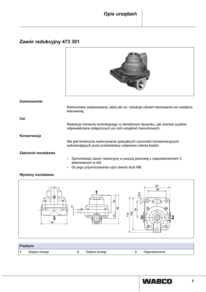 Opis urządzeń Zawór redukcyjny 473 301 Zastosowanie Różnorodne zastosowania, takie jak np. redukcja ciśnień hamowania osi nadążnokierowanej. Cel Redukcja ciśnienia wchodzącego w określonym stosunku, jak również szybkie odpowietrzanie dołączonych po nich urządzeń hamulcowych. Konserwacja Nie jest konieczne wykonywanie specjalnych czynności konserwacyjnych wykraczających poza przewidziany ustawowo zakres badań. Zalecenie montażowe – Zamontować zawór redukcyjny w pozycji pionowej z odpowietrzeniem 3 skierowanym w dół. – Do jego przymocowania użyć dwóch śrub M8. Wymiary montażowe Przyłącza 1 Dopływ energii 2 Odpływ energii 3 Odpowietrzenie 1 Opis urządzeń Dane techniczne Numer katalogowy 473 301 000 0 473 301 001 0 473 301 002 0 473 301 003 0 2:1 1,5:1 1,35:1 1,15:1 Stosunek redukcji ciśnienia Przyłącze gwintowane M 22x1,5 - 15 głęboki Maks. ciśnienie robocze 10 bar Dopuszczalne medium powietrze Zakres temperatur -40 °C do +80 °C Ciężar 0,9 kg Wykres ciśnienia Legenda p1 Ciśnienie wysterowane p2 Ciśnienie wchodzące Zasada działania Sprężone powietrze wpływa przez przyłącze 1 do przestrzeni A i przesuwa tłoczek stopniowy (d) w dół w kierunku przeciwnym do kierunku działania siły sprężyny 2 Opis urządzeń naciskowej (a). Zawór wylotowy (b) zostaje zamknięty, a zawór wlotowy (c) otwarty. Sprężone powietrze przepływa przez przyłącze 2 do podłączonych po zaworze urządzeń hamujących. Jednocześnie w przestrzeni B wzrasta ciśnienie, które działa na dolną część tłoczka (d). Jeżeli zostanie osiągnięte zrównanie siły na dolnej części i mniejszej, górnej części tłoczka stopniowego (d), to nastąpi podniesienie tłoczka i zamknięcie zaworu wlotowego (c). Stosunek ciśnień odpowiada stosunkowi obydwu powierzchni tłoczka stopniowego. Jeżeli ciśnienie przy przyłączu 1 obniży się, to wyższe ciśnienie w przestrzeni B spowoduje podniesienie tłoczka stopniowego (d). Zawór wylotowy (b) otwiera się i przez odpowietrzenie 3 następuje częściowe lub całkowite odpowietrzenie podłączonych za zaworem urządzeń hamulcowych, które odpowiada ciśnieniu sterującemu. Także w stanie bezciśnieniowym tłoczek stopniowy jest utrzymywany przez sprężynę naciskową (a) zawsze w swoim górnym położeniu końcowym. 3
