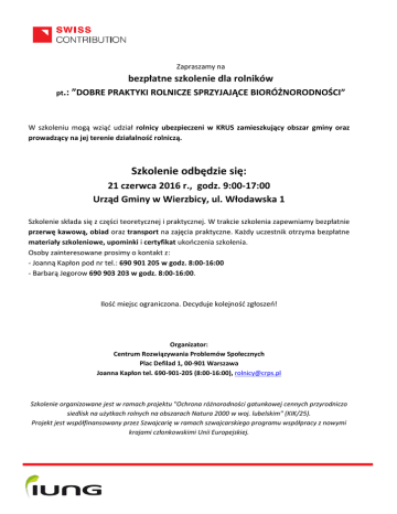 Zapraszamy na bezpłatne szkolenie dla rolników pt.: ”DOBRE PRAKTYKI ROLNICZE SPRZYJAJĄCE BIORÓŻNORODNOŚCI” W szkoleniu mogą wziąd udział rolnicy ubezpieczeni w KRUS zamieszkujący obszar gminy oraz prowadzący na jej terenie działalnośd rolniczą. Szkolenie odbędzie się: 21 czerwca 2016 r., godz. 9:00-17:00 Urząd Gminy w Wierzbicy, ul. Włodawska 1 Szkolenie składa się z części teoretycznej i praktycznej. W trakcie szkolenia zapewniamy bezpłatnie przerwę kawową, obiad oraz transport na zajęcia praktyczne. Każdy uczestnik otrzyma bezpłatne materiały szkoleniowe, upominki i certyfikat ukooczenia szkolenia. Osoby zainteresowane prosimy o kontakt z: - Joanną Kapłon pod nr tel.: 690 901 205 w godz. 8:00-16:00 - Barbarą Jegorow 690 903 203 w godz. 8:00-16:00. Ilośd miejsc ograniczona. Decyduje kolejnośd zgłoszeo! Organizator: Centrum Rozwiązywania Problemów Społecznych Plac Defilad 1, 00-901 Warszawa Joanna Kapłon tel. 690-901-205 (8:00-16:00), [email protected] Szkolenie organizowane jest w ramach projektu "Ochrona różnorodności gatunkowej cennych przyrodniczo siedlisk na użytkach rolnych na obszarach Natura 2000 w woj. lubelskim" (KIK/25). Projekt jest współfinansowany przez Szwajcarię w ramach szwajcarskiego programu współpracy z nowymi krajami członkowskimi Unii Europejskiej. Agenda szkolenia dla rolników pt.: ”DOBRE PRAKTYKI ROLNICZE SPRZYJAJĄCE BIORÓŻNORODNOŚCI” organizowanego w ramach projektu "Ochrona różnorodności gatunkowej cennych przyrodniczo siedlisk na użytkach rolnych na obszarach Natura 2000 w woj. lubelskim"(KIK/25) 09.00 – 09.15 Powitanie. Krótka informacja o projekcie KIK/25 09.15 – 10.45 Bogactwo fauny i flory w służbie rolnika – rodzaje i znaczenie dla rolnictwa usług ekosystemowych świadczonych przez bioróżnorodnośd (biologiczna ochrona roślin, zapylanie, ochrona gleb) (2x45 min); 10.45 - 11.00 Przerwa kawowa 11.00 – 12.30 Program rolno-środowiskowo-klimatyczny oraz rolnictwo ekologiczne jako narzędzia ochrony różnorodności biologicznej na użytkach rolnych. Wspólnotowe wdrażanie PRŚK (2x45 min); 12.30 – 13.15 Obiad 13.15 – 16.30 Wizytacja terenowa cennych przyrodniczo łąk w gminie (3 x 45 min zajęcia terenowe + 60 min na dojazd); 16.30 - 17.00 Przeprowadzenie oceny szkolenia, wręczenie certyfikatów, zakooczenie szkolenia. Projekt współfinansowany jest przez Szwajcarię w ramach szwajcarskiego programu współpracy z nowymi krajami członkowskimi Unii Europejskiej.