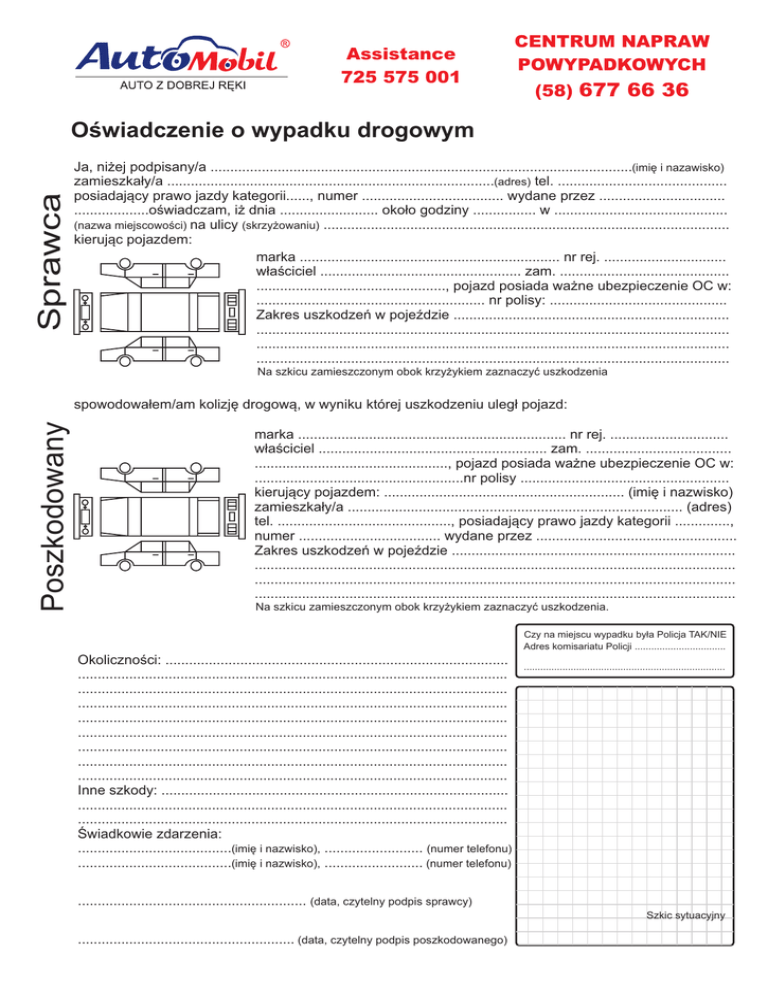 Assistance 725 575 001 CENTRUM NAPRAW POWYPADKOWYCH (58) 677 66 36 Sprawca Oœwiadczenie o wypadku drogowym Ja, ni¿ej podpisany/a ...........................................................................................................(imiê i nazawisko) zamieszka³y/a ...................................................................................(adres) tel. ........................................... posiadaj¹cy prawo jazdy kategorii......, numer .................................... wydane przez ................................ ...................oœwiadczam, i¿ dnia ......................... oko³o godziny ................ w ............................................ (nazwa miejscowoœci) na ulicy (skrzy¿owaniu) ....................................................................................................... kieruj¹c pojazdem: marka .................................................................. nr rej. ............................... w³aœciciel ................................................... zam. ........................................... ................................................, pojazd posiada wa¿ne ubezpieczenie OC w: .......................................................... nr polisy: ............................................. Zakres uszkodzeñ w pojeŸdzie ...................................................................... ........................................................................................................................ ........................................................................................................................ ........................................................................................................................ Na szkicu zamieszczonym obok krzy¿ykiem zaznaczyæ uszkodzenia Poszkodowany spowodowa³em/am kolizjê drogow¹, w wyniku której uszkodzeniu uleg³ pojazd: marka .................................................................... nr rej. .............................. w³aœciciel .......................................................... zam. ..................................... ................................................., pojazd posiada wa¿ne ubezpieczenie OC w: .....................................................nr polisy ..................................................... kieruj¹cy pojazdem: ............................................................. (imiê i nazwisko) zamieszka³y/a ..................................................................................... (adres) tel. ............................................, posiadaj¹cy prawo jazdy kategorii .............., numer .................................... wydane przez ................................................... Zakres uszkodzeñ w pojeŸdzie ........................................................................ .......................................................................................................................... .......................................................................................................................... .......................................................................................................................... Na szkicu zamieszczonym obok krzy¿ykiem zaznaczyæ uszkodzenia. Czy na miejscu wypadku by³a Policja TAK/NIE Adres komisariatu Policji ................................. Okolicznoœci: ....................................................................................... ............................................................................................................. ............................................................................................................. ............................................................................................................. ............................................................................................................. ............................................................................................................. ............................................................................................................. ............................................................................................................. ............................................................................................................. Inne szkody: ........................................................................................ ............................................................................................................. ............................................................................................................. Œwiadkowie zdarzenia: .......................................(imiê i nazwisko), ......................... (numer telefonu) .......................................(imiê i nazwisko), ......................... (numer telefonu) ......................................................................... .......................................................... (data, czytelny podpis sprawcy) Szkic sytuacyjny ....................................................... (data, czytelny podpis poszkodowanego) Assistance 725 575 001 CENTRUM NAPRAW POWYPADKOWYCH (58) 677 66 36 Uwaga - wypadek, st³uczka pamiêtaj o: 1 Bezpieczeñstwie swoim oraz osób podró¿uj¹cych uwa¿aj, aby inni uczestnicy ruchu nie staranowali Ciebie, odprowadŸ podró¿nych w bezpieczne miejsce. 2 Zabezpieczeniu miejsca kolizji: wy³¹cz silnik, za³ó¿ kamizelkê odblaskow¹, w³¹cz œwiat³a awaryjne, ustaw trójk¹t ostrzegawczy. Je¿eli s¹ ranni w wypadku wezwij pogotowie nr tel. 112. 3 Udzieleniu pierwszej pomocy ofiarom wypadku do momentu przybycia pogotowia lub stra¿y. 4 Jeœli nie mo¿emy jednoznacznie okreœliæ sprawcy wypadku lub sprawca nie chce przyznaæ sie do winy, ma nieaktualne dokumenty lub jest pod wp³ywem alkoholu - wezwij policjê nr tel. 112. 5 Jeœli w wypadku nie