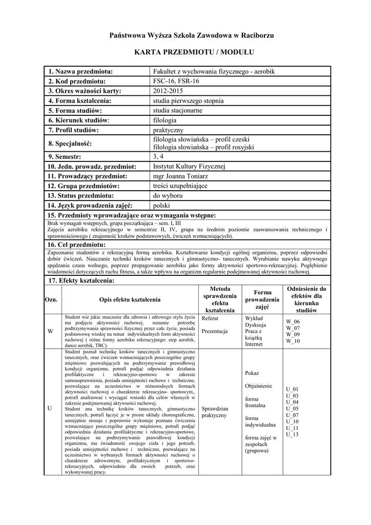 Państwowa Wyższa Szkoła Zawodowa w Raciborzu KARTA PRZEDMIOTU / MODUŁU Fakultet z wychowania fizycznego - aerobik FSC-16, FSR-16 2012-2015 studia pierwszego stopnia studia stacjonarne filologia praktyczny filologia słowiańska – profil czeski 8. Specjalność: filologia słowiańska – profil rosyjski 3, 4 9. Semestr: Instytut Kultury Fizycznej 10. Jedn. prowadz. przedmiot: mgr Joanna Toniarz 11. Prowadzący przedmiot: treści uzupełniające 12. Grupa przedmiotów: 13. Status przedmiotu: do wyboru 14. Język prowadzenia zajęć: polski 15. Przedmioty wprowadzające oraz wymagania wstępne: 1. Nazwa przedmiotu: 2. Kod przedmiotu: 3. Okres ważności karty: 4. Forma kształcenia: 5. Forma studiów: 6. Kierunek studiów: 7. Profil studiów: Brak wymagań wstępnych, grupa początkująca – sem. I, III Zajęcia aerobiku rekreacyjnego w semestrze II, IV, grupa na średnim poziomie zaawansowania technicznego i sprawnościowego ( znajomość kroków podstawowych, ćwiczeń wzmacniających). 16. Cel przedmiotu: Zapoznanie studentów z rekreacyjną formą aerobiku. Kształtowanie kondycji ogólnej organizmu, poprzez odpowiedni dobór ćwiczeń. Nauczanie techniki kroków tanecznych i gimnastyczno- tanecznych. Wyrabianie nawyku aktywnego spędzania czasu wolnego, poprzez propagowanie aerobiku jako formy aktywności sportowo-rekreacyjnej. Pogłębienie wiadomości dotyczących ruchu fitness, a także wpływu na organizm regularnie podejmowanej aktywności ruchowej. 17. Efekty kształcenia: Ozn. W U Opis efektu kształcenia Student wie jakie znaczenie dla zdrowia i zdrowego stylu życia ma podjęcie aktywności ruchowej, rozumie potrzebę podtrzymywania sprawności fizycznej przez całe życie, posiada podstawową wiedzę na temat indywidualnych form aktywności ruchowej ( różne formy aerobiku rekreacyjnego: step aerobik, dance aerobik, TBC). Student poznał technikę kroków tanecznych i gimnastyczno tanecznych, oraz ćwiczeń wzmacniających poszczególne grupy mięśniowe pozwalających na podtrzymywanie prawidłowej kondycji organizmu, potrafi podjąć odpowiednia działania profilaktyczne i rekreacyjno-sportowe w zakresie samousprawnienia, posiada umiejętności ruchowe i techniczne, pozwalające na uczestnictwo w różnorodnych formach aktywności ruchowej o charakterze rekreacyjno- sportowym,, potrafi analizować i wyciągać wnioski dla celów własnych w zakresie podejmowanej aktywności ruchowej. Student zna technikę kroków tanecznych, gimnastyczno tanecznych, potrafi łączyć je w proste układy choreograficzne, umiejętnie stosuje i poprawnie wykonuje poznane ćwiczenia wzmacniające poszczególne grupy mięśniowe, potrafi podjąć odpowiednia działania profilaktyczne i rekreacyjno-sportowe, pozwalające na podtrzymywanie prawidłowej kondycji organizmu, ma świadomość swojego ciała i jego potrzeb, posiada umiejętności ruchowe i techniczne, pozwalające na uczestnictwo w wybranych formach aktywności ruchowej o charakterze zdrowotnym, profilaktycznym i sportoworekreacyjnych, odpowiednio dla swoich potrzeb, oraz wykonywanej pracy. Metoda sprawdzenia efektu kształcenia Referat Prezentacja Forma prowadzenia zajęć Odniesienie do efektów dla kierunku studiów Wykład Dyskusja Praca z książką Internet W_06 W_07 W_09 W_10 Pokaz Objaśnienie Sprawdzian praktyczny forma frontalna forma indywidualna forma zajęć w zespołach (grupowa) U_01 U_03 U_04 U_05 U_07 U_10 U_11 U_13 Student ma świadomość potrzeby ruchu, wie jak należy nad sobą pracować i doskonalić nabyte umiejętności, posiada przekonanie o wartości zdobytej wiedzy poruszanej podczas zajęć, potrafi współpracować i współdziałać w grupie, a także w środowisku społecznym szerząc zachowania prozdrowotne, potrafi odnieść zdobytą wiedzę w projektowaniu dalszych zadań prozdrowotnych w życiu zawodowym i prywatnym. Student ma świadomość potrzeby systematycznej pracy nad sobą i ciągłego samousprawniania, wie jak należy nad sobą pracować, ma świadomość znaczenia nabytych umiejętności i wiadomości poruszanych podczas zajęć. K 18. Formy i wymiar zajęć: 19. Treści kształcenia: Pogadanka Ocena podsumowująca Praca z książką Internet K_01 K_02 K_03 K_04 K_05 Dyskusja Ćwiczenia, 30 godzin na sem. Nauczanie kroków podstawowych w aerobiku i step aerobiku i ich proste modyfikacje. Poznanie zasad budowania prostych choreografii w aerobiku i step aerobiku. Zapoznanie z różnymi forami aerobiku rekreacyjnego, zajęcia: kondycyjne, wzmacniające i mieszane. Zapoznanie studentów z walorami zdrowotnymi i terapeutycznymi aerobiku rekreacyjnego. Umiejętny dobór i zastosowanie ćwiczeń wzmacniających poszczególne grupy mięśniowe. Doskonalenie poznanych kroków podstawowych w aerobiku i step aerobiku, oraz ich modyfikacje. Poznanie zasad konstruowania prostych choreografii w aerobiku i step aerobiku. Zapoznanie z różnymi forami aerobiku rekreacyjnego, zajęcia: kondycyjne, wzmacniające i mieszane. Zapoznanie studentów z walorami zdrowotnymi i terapeutycznymi aerobiku rekreacyjnego, oraz wskazanie konieczności systematycznej pracy nad sobą w celu podtrzymywania kondycji organizmu. Umiejętny dobór i właściwe zastosowanie ćwiczeń wzmacniających poszczególne grupy mięśniowe. 20. Egzamin: 21. Literatura podstawowa: 1. 2. 3. 4. z/o Kuba L., Paruzel- Dyja M.: Fitness- nowoczesne formy gimnastyki, podstawy teoretyczne, Katowice 2010 Grodzka-Kubiak E.: Aerobik czy fitness, Poznań 2002 D.Olex- Zarychta: Fitness- teoretyczne i metodyczne podstawy prowadzenia zajęć. Katowice 2005 Fidusiewicz H.: Aerobic, Warszawa 1997 22. Literatura uzupełniająca: 1. 2. 3. Kuźmińska O.:Taniec w teorii i praktyce; AWF w Poznaniu 2002 Listkowski M.: Stretching- sprawność i zdrowie, Wydawnictwo Łódź 1994 Koziełło D.: Taniec i psychoterapia; Instytut Historii UAM, Poznań 1999 23. Nakład pracy studenta potrzebny do osiągnięcia efektów kształcenia: Liczba godzin Lp. Forma zaj