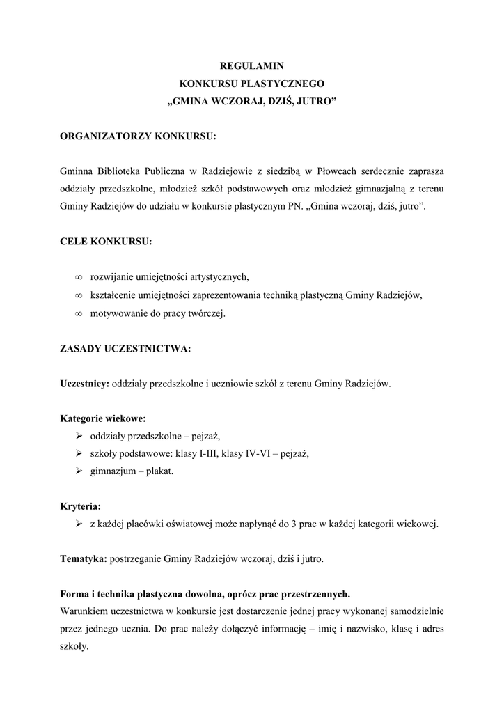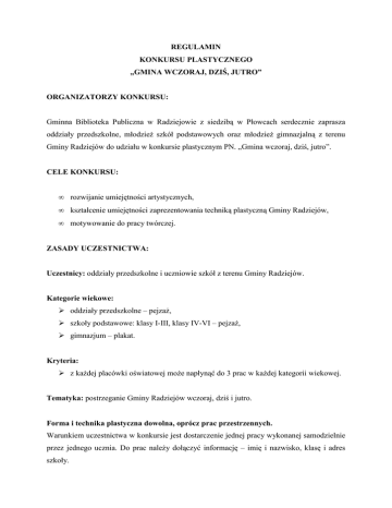 REGULAMIN KONKURSU PLASTYCZNEGO „GMINA WCZORAJ, DZIŚ, JUTRO” ORGANIZATORZY KONKURSU: Gminna Biblioteka Publiczna w Radziejowie z siedzibą w Płowcach serdecznie zaprasza oddziały przedszkolne, młodzieŜ szkół podstawowych oraz młodzieŜ gimnazjalną z terenu Gminy Radziejów do udziału w konkursie plastycznym PN. „Gmina wczoraj, dziś, jutro”. CELE KONKURSU: • rozwijanie umiejętności artystycznych, • kształcenie umiejętności zaprezentowania techniką plastyczną Gminy Radziejów, • motywowanie do pracy twórczej. ZASADY UCZESTNICTWA: Uczestnicy: oddziały przedszkolne i uczniowie szkół z terenu Gminy Radziejów. Kategorie wiekowe: oddziały przedszkolne – pejzaŜ, szkoły podstawowe: klasy I-III, klasy IV-VI – pejzaŜ, gimnazjum – plakat. Kryteria: z kaŜdej placówki oświatowej moŜe napłynąć do 3 prac w kaŜdej kategorii wiekowej. Tematyka: postrzeganie Gminy Radziejów wczoraj, dziś i jutro. Forma i technika plastyczna dowolna, oprócz prac przestrzennych. Warunkiem uczestnictwa w konkursie jest dostarczenie jednej pracy wykonanej samodzielnie przez jednego ucznia. Do prac naleŜy dołączyć informację – imię i nazwisko, klasę i adres szkoły. Wielkość prac: do formatu A3 prace muszą być zabezpieczone przed ewentualnym uszkodzeniem, prosimy nie rolować prac. KRYTERIA OCENY PRAC KONKURSOWYCH: A: OD STRONY TECHNICZNEJ • oryginalne wykonanie, • zgodność z tematyką. PRZEBIEG KONKURSU: 1. Prace naleŜy składać do 20 czerwca 2012 roku na adres: Gminna Biblioteka Publiczna w Płowcach Płowce 85 88-200 Radziejów z dopiskiem konkurs plastyczny 2. Prace zostaną ocenione przez komisję konkursową powołaną przez organizatora. 3. Regulamin, przebieg konkursu oraz wyniki popularyzowane będą na stronie internetowej Urzędu Gminy -www.ugradziejow.pl i biblioteki w Płowcach -www.gbpplowce.pl 4. Wręczenie nagród odbędzie się 9 września 2012 roku podczas DoŜynek Gminnych w Szostce.