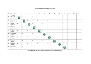Mistrzostwa Sekcji Tenisowej 2015 Grupa C l.p Nazwisko i Imię 1. Skorupski Dominik 2. Kropidłowski Dawid 3. Laufer Mateusz 4. Staszczuk Marek 5. Wojtczak Tomasz 6. Kukurowski Bartosz 7. Kędzierski Dariusz 8. Ratajczak Jędrzej 9. Biegański Krzysztof 10. Machońko 1. 2. 3. g 4. 5. G g g g g g g g g g g g g g g g g g g g g g g g g g g g g g 10. g g G 9. g g g 8. g g g 7. g G g 6. g g Adam g- gospodarz, zawodnik odpowiedzialny za organizację spotkanie Punkty Sety Miejsce 1.Skorupski Damian 2.Kropidłowski Dawid 3.Laufer Mateusz 4.Staszczuk Marek 5.Wojtczak Tomasz 6.Kukurowski Bartosz 7.Kędzierski Dariusz 8.Ratajczak Jędrzej 9.Biegański Krzysztof 10.Machońko Adam 796 097 287 663 304012 606 843 912 790 833 962 [email protected] [email protected] [email protected] [email protected] 600 947 701 500 064 001 504 045 890 662 625 807 691 222 499 [email protected] [email protected] [email protected] [email protected] [email protected] 1. System rozgrywek ligowych: We wszystkie meczach obowiązuje następująca formuła rozegrania meczu: - w secie 1 i 2 przy stanie 6:6 obowiązuje tie-break do 7 punktów - w secie 3 obowiązuje rozegranie super tie-break do 10 punktów 2. Punktacja: -za mecz wygrany 2:0 w setach - 3 punkty -za mecz wygrany 2:1 w setach - 2 punkty -za mecz przegrany 1:2 w setach - 1 punkt -za mecz przegrany 0:2 w setach oraz przez walkower - 0 punktów 3.Obowiązują przepisy gry w tenisa oraz kodeks etyki postępowania zawodnika PZT. Szczegółowy regulamin rozgrywek http://kswarta.pl/tenis 4.Rezerwację i wynik przekazujemy organizatorowi -602 258 573 5.Piłka: sugerowana marka – wilson, tretorn, dunlop, head, prince, babolat W okresie 01.05-30.08.2015 opłata za wynajęcie kortu na mecz - 0zł (bez limitu czasowego spotkania) Powodzenia … Pozdrawiam Jacek Gąsiorek