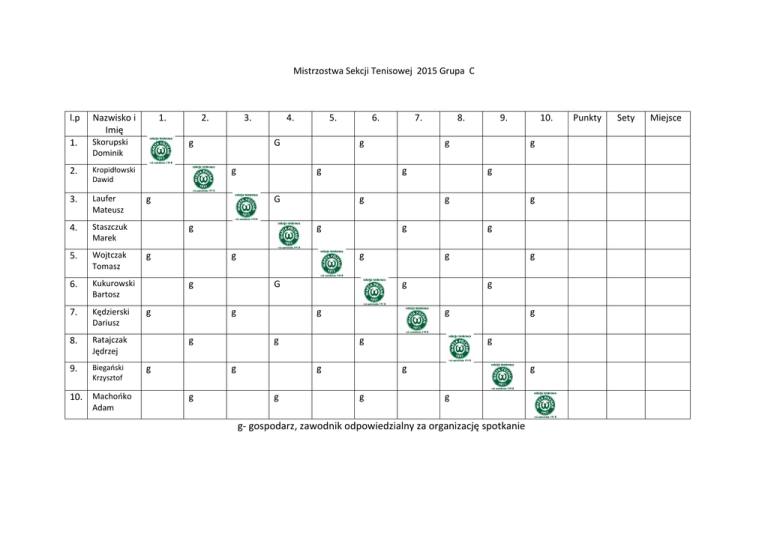 g- gospodarz, zawodnik odpowiedzialny za organizację spotkanie