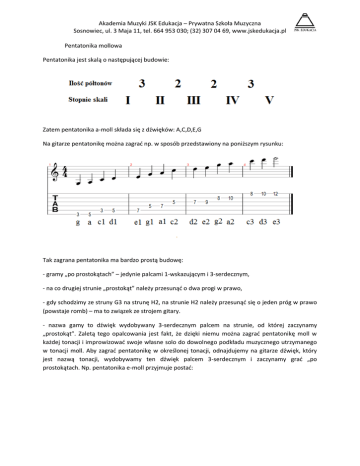 Akademia Muzyki JSK Edukacja – Prywatna Szkoła Muzyczna Sosnowiec, ul. 3 Maja 11, tel. 664 953 030; (32) 307 04 69, www.jskedukacja.pl Pentatonika mollowa Pentatonika jest skalą o następującej budowie: Zatem pentatonika a-moll składa się z dźwięków: A,C,D,E,G Na gitarze pentatonikę można zagrać np. w sposób przedstawiony na poniższym rysunku: Tak zagrana pentatonika ma bardzo prostą budowę: - gramy „po prostokątach” – jedynie palcami 1-wskazującym i 3-serdecznym, - na co drugiej strunie „prostokąt” należy przesunąć o dwa progi w prawo, - gdy schodzimy ze struny G3 na strunę H2, na strunie H2 należy przesunąć się o jeden próg w prawo (powstaje romb) – ma to związek ze strojem gitary. - nazwa gamy to dźwięk wydobywany 3-serdecznym palcem na strunie, od której zaczynamy „prostokąt”. Zaletą tego opalcowania jest fakt, że dzięki niemu można zagrać pentatonikę moll w każdej tonacji i improwizować swoje własne solo do dowolnego podkładu muzycznego utrzymanego w tonacji moll. Aby zagrać pentatonikę w określonej tonacji, odnajdujemy na gitarze dźwięk, który jest nazwą tonacji, wydobywamy ten dźwięk palcem 3-serdecznym i zaczynamy grać „po prostokątach. Np. pentatonika e-moll przyjmuje postać: Akademia Muzyki JSK Edukacja – Prywatna Szkoła Muzyczna Sosnowiec, ul. 3 Maja 11, tel. 664 953 030; (32) 307 04 69, www.jskedukacja.pl