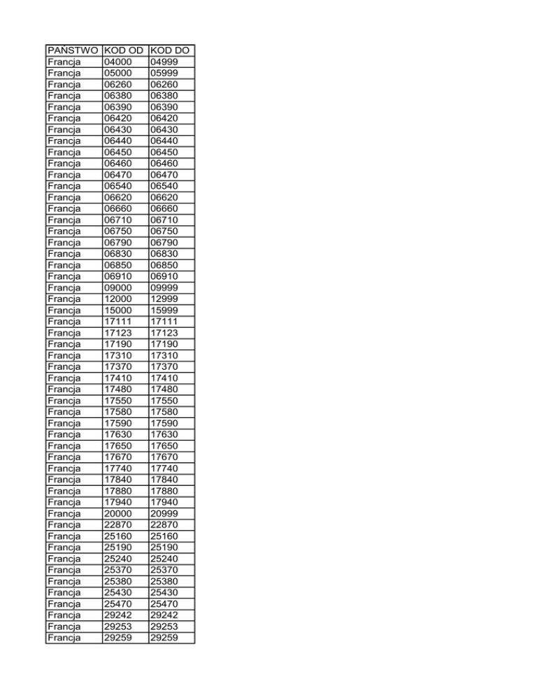 PAŃSTWO Francja Francja Francja Francja Francja Francja Francja Francja Francja Francja Francja Francja Francja Francja Francja Francja Francja Francja Francja Francja Francja Francja Francja Francja Francja Francja Francja Francja Francja Francja Francja Francja Francja Francja Francja Francja Francja Francja Francja Francja Francja Francja Francja Francja Francja Francja Francja Francja Francja Francja Francja Francja KOD OD 04000 05000 06260 06380 06390 06420 06430 06440 06450 06460 06470 06540 06620 06660 06710 06750 06790 06830 06850 06910 09000 12000 15000 17111 17123 17190 17310 17370 17410 17480 17550 17580 17590 17630 17650 17670 17740 17840 17880 17940 20000 22870 25160 25190 25240 25370 25380 25430 25470 29242 29253 29259 KOD DO 04999 05999 06260 06380 06390 06420 06430 06440 06450 06460 06470 06540 06620 06660 06710 06750 06790 06830 06850 06910 09999 12999 15999 17111 17123 17190 17310 17370 17410 17480 17550 17580 17590 17630 17650 17670 17740 17840 17880 17940 20999 22870 25160 25190 25240 25370 25380 25430 25470 29242 29253 29259 Francja Francja Francja Francja Francja Francja Francja Francja Francja Francja Francja Francja Francja Francja Francja Francja Francja Francja Francja Francja Francja Francja Francja Francja Francja Francja Francja Francja Francja Francja Francja Francja Francja Francja Francja Francja Francja Francja Francja Francja Francja Francja Francja Francja Francja Francja Francja Francja Francja Francja Francja Francja Francja 29980 29990 38112 38114 38142 38250 38520 38580 38650 38710 38720 38740 38750 38860 38880 38930 38970 39220 39310 39400 48000 56360 56590 56780 56840 63113 63240 63610 63680 63850 65001 65101 65421 73120 73150 73270 73320 73340 73350 73440 73450 73480 73500 73530 73550 73590 73620 73630 73710 73870 74110 74120 74170 29980 29990 38112 38114 38142 38250 38520 38580 38650 38710 38720 38740 38750 38860 38880 38930 38970 39220 39310 39400 48999 56360 56590 56780 56840 63113 63240 63610 63680 63850 65099 65419 65999 73120 73150 73270 73320 73340 73350 73440 73450 73480 73500 73530 73550 73590 73620 73630 73710 73870 74110 74120 74170 Francja Francja Francja Francja Francja Francja Francja Francja Francja Francja Francja Francja Francja Francja Francja Francja Francja Francja Francja Francja Francja Francja 74190 74220 74260 74310 74340 74360 74390 74400 74420 74430 74440 74450 74470 74480 74490 74660 74920 85330 85630 85680 85740 88340 74190 74220 74260 74310 74340 74360 74390 74400 74420 74430 74440 74450 74470 74480 74490 74660 74920 85330 85630 85680 85740 88340