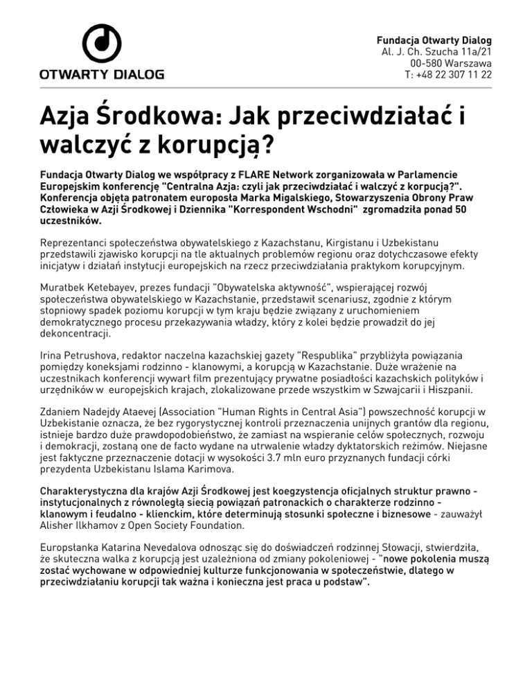 Fundacja Otwarty Dialog Al. J. Ch. Szucha 11a/21 00-580 Warszawa T: +48 22 307 11 22 Azja Środkowa: Jak przeciwdziałać i walczyć z korupcją? Fundacja Otwarty Dialog we współpracy z FLARE Network zorganizowała w Parlamencie Europejskim konferencję "Centralna Azja: czyli jak przeciwdziałać i walczyć z korpucją?". Konferencja objęta patronatem europosła Marka Migalskiego, Stowarzyszenia Obrony Praw Człowieka w Azji Środkowej i Dziennika "Korrespondent Wschodni" zgromadziła ponad 50 uczestników. Reprezentanci społeczeństwa obywatelskiego z Kazachstanu, Kirgistanu i Uzbekistanu przedstawili zjawisko korupcji na tle aktualnych problemów regionu oraz dotychczasowe efekty inicjatyw i działań instytucji europejskich na rzecz przeciwdziałania praktykom korupcyjnym. Muratbek Ketebayev, prezes fundacji "Obywatelska aktywność", wspierającej rozwój społeczeństwa obywatelskiego w Kazachstanie, przedstawił scenariusz, zgodnie z którym stopniowy spadek poziomu korupcji w tym kraju będzie związany z uruchomieniem demokratycznego procesu przekazywania władzy, który z kolei będzie prowadził do jej dekoncentracji. Irina Petrushova, redaktor naczelna kazachskiej gazety "Respublika" przybliżyła powiązania pomiędzy koneksjami rodzinno - klanowymi, a korupcją w Kazachstanie. Duże wrażenie na uczestnikach konferencji wywarł film prezentujący prywatne posiadłości kazachskich polityków i urzędników w europejskich krajach, zlokalizowane przede wszystkim w Szwajcarii i Hiszpanii. Zdaniem Nadejdy Ataevej (Association "Human Rights in Central Asia") powszechność korupcji w Uzbekistanie oznacza, że bez rygorystycznej kontroli przeznaczenia unijnych grantów dla regionu, istnieje bardzo duże prawdopodobieństwo, że zamiast na wspieranie celów społecznych, rozwoju i demokracji, zostaną one de facto wydane na utrwalenie władzy dyktatorskich reżimów. Niejasne jest faktyczne przeznaczenie dotacji w wysokości 3.7 mln euro przyznanych fundacji córki prezydenta Uzbekistanu Islama Karimova. Charakterystyczna dla krajów Azji Środkowej jest koegzystencja oficjalnych struktur prawno instytucjonalnych z równoległą siecią powiązań patronackich o charakterze rodzinno klanowym i feudalno - klienckim, które determinują stosunki społeczne i biznesowe - zauważył Alisher Ilkhamov z Open Society Foundation. Europsłanka Katarina Nevedalova odnosząc się do doświadczeń rodzinnej Słowacji, stwierdziła, że skuteczna walka z korupcją jest uzależniona od zmiany pokoleniowej - "nowe pokolenia muszą zostać wychowane w odpowiedniej kulturze funkcjonowania w społeczeństwie, dlatego w przeciwdziałaniu korupcji tak ważna i konieczna jest praca u podstaw". MEP Paul Murphy przywołując przykład aktualnych strajków pracowników sektora naftowego w Kazachstanie, wskazał, że korupcja na wszelkich szczeblach władzy może prowadzić pośrednio do największych indywidualnych tragedii ludzkich. MEP Sonia Alfano wyraziła przekonanie, że sukces walki z korupcją na całym świecie, zarówno we Włoszech, jak i Kazachstanie, zależy w dużym stopniu od woli politycznej sprawujących władzę. Jaqueline Hale z Open Society Foundation zwróciła uwagę na rolę obowiązujących regulacji w systemach ustawodawczych poszczególnych krajów, które mogą przeciwdziałać, bądź - w praktyce Azji Środkowej - sprzyjać korupcji. Tom Mayne, analityk organizacji Global Witness podkreślił fakt zaangażowania europejskich banków (jak Deutsche Bank) i pozostałych instytucji finansowych (jak London Stock Exchange) w działania korupcyjne, w których często stają się one miejscem lokowania i legalizowania środkowo-azjatyckich aktywów korupcyjnych. Szczególnym zainteresowaniem spotkały się zaprezentowane przez profesor Alinę MungiuPippidi wyniki badań ukazujące formy i rozmiary korupcji w regionie na przestrzeni ostatnich lat, które unaoczniły potrzebę nowych, międzynarodowych, skutecznych inicjatyw na rzecz przeciwdziałania i walki z korupcją. Wskazała ponadto na różnice pomiędzy korupcją w Europie, a w Azji Środkowej, gdzie korupcja ma charaktery systemowy, głęboko przenikający zarówno poszczególnych funkcjonariuszy aparatu państwa, jak też otoczenie prawno - instytucjonalne i kulturowe. Zdaniem Cezarego Bardzińskiego (Eastern Policy Team Permanent Representation of the Republic of Poland to the EU) trudno jest reformować kraj na odległość (stąd niewielka skuteczność programów UE dla regionu) - źródłem reform musi być przede wszystkim społeczeństwo wywierające wpływ na władze. Zaangażowanie UE będzie rosnąć, ale będzie uzależnione od znaczenia gospodarczego Azji Środkowej dla Europy. Wywołana prelekcjami dyskusja z udziałem europejskich polityków, działaczy organizacji pozarządowych i mediów zaowocowała przyjęciem wielostronnej deklaracji podjęcia wspólnych działań opierających się na stale prowadzonym monitoringu sytuacji, skali i głównych przypadków korupcji w Azji Środkowej. Ufamy, że te słowa staną się ciałem. facebook.com/OpenDialogFoundation | [email protected] | www.odfoundation.eu