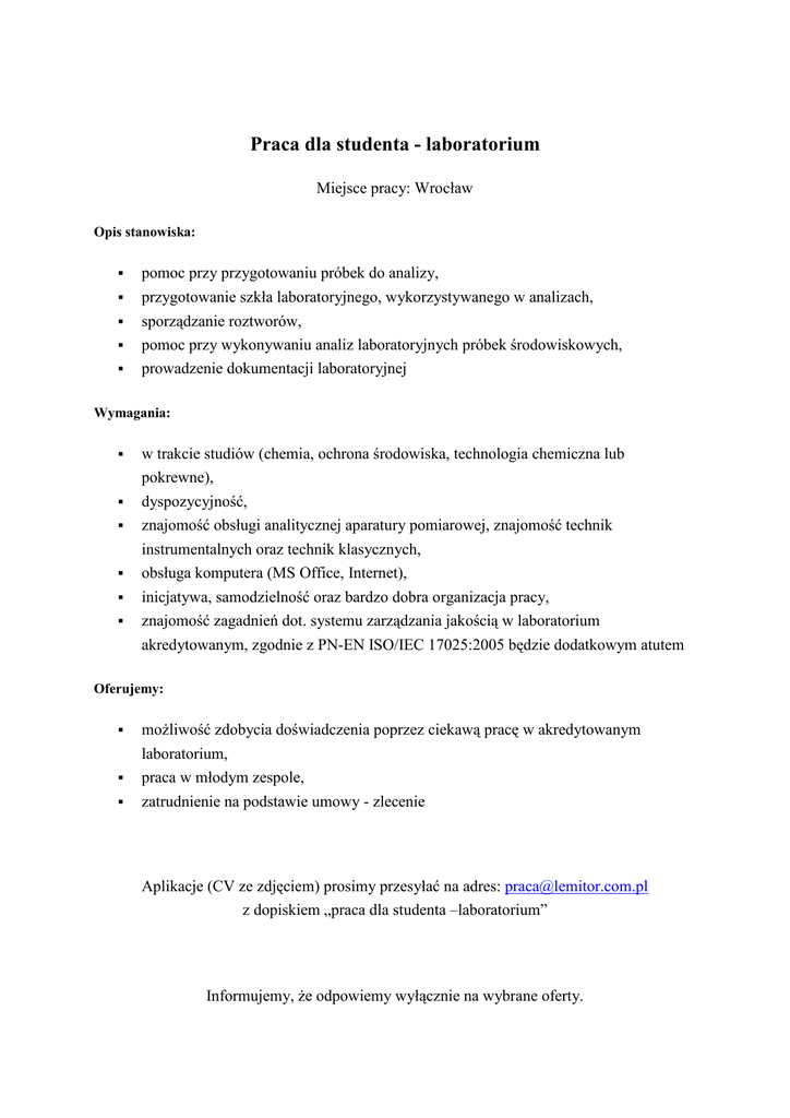 Praca dla studenta - laboratorium Miejsce pracy: Wrocław Opis stanowiska: pomoc przy przygotowaniu próbek do analizy, przygotowanie szkła laboratoryjnego, wykorzystywanego w analizach, sporządzanie roztworów, pomoc przy wykonywaniu analiz laboratoryjnych próbek środowiskowych, prowadzenie dokumentacji laboratoryjnej Wymagania: w trakcie studiów (chemia, ochrona środowiska, technologia chemiczna lub pokrewne), dyspozycyjność, znajomość obsługi analitycznej aparatury pomiarowej, znajomość technik instrumentalnych oraz technik klasycznych, obsługa komputera (MS Office, Internet), inicjatywa, samodzielność oraz bardzo dobra organizacja pracy, znajomość zagadnień dot. systemu zarządzania jakością w laboratorium akredytowanym, zgodnie z PN-EN ISO/IEC 17025:2005 będzie dodatkowym atutem Oferujemy: moŜliwość zdobycia doświadczenia poprzez ciekawą pracę w akredytowanym laboratorium, praca w młodym zespole, zatrudnienie na podstawie umowy - zlecenie Aplikacje (CV ze zdjęciem) prosimy przesyłać na adres: [email protected] z dopiskiem „praca dla studenta –laboratorium” Informujemy, Ŝe odpowiemy wyłącznie na wybrane oferty.