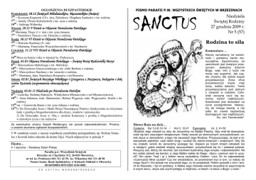OGŁOSZENIA DUSZPASTERSKIE Poniedziałek 28.12 Świętych Młodzianków, Męczenników (święto) 700 + Krystynę Kasperek (10 r. śm), Zdzisława i Bogdana Szałasów z int. rodziny 730 + Anielę i Piotra Kobyłeckich z int. syna z rodziną 1000 + Jadwigę Widurską Wtorek 29.12 V Dzień w Oktawie Narodzenia Pańskiego 700 Mariannę Tkacz (1 r. śm) z int. syna Janusza 730 + Stanisława Tkacza z int. Henryka z rodziną Środa 30.12 VI Dzień w Oktawie Narodzenia Pańskiego 700 + Henryka Stachurę (3r. śm) 730 + Mariannę, Franciszka Wojciechowskich z int. Stachurów Czwartek 31.12 VII Dzień w Oktawie Narodzenia Pańskiego 700 1600 Msza na koniec roku w intencji ks. Proboszcza Piątek 01.01 Oktawa Narodzenia Pańskiego – Świętej Bożej Rodzicielki Maryi 800 + Mieczysława Malickiego z int. Malickiej 1000 + Mieczysława Gruszczyńskiego z int. córki Barbary z rodziną 1200 + Mieczysława Stachurę z int. wnuczki z rodziną 1530 + Mariannę, Jana, Stanisława Rozparów z int Brzozów Sobota 02.01 Świętych Bazylego Wielkiego i Grzegorza z Nazjanzu, biskupó biskupów w i dokdok- PISMO PARAFII P.W. WSZYSTKICH ŚWIĘTYCH W BRZEZINACH SANC SANCTUS Rodzina to siła Komentarz… Nieraz narzekamy na samotność i jesteśmy bardo nieszczęśliwi. Zapominamy, że samotność jest świętym przeżyciem. Jesteśmy dziećmi Boga, więc nikt z ludzi nie może nas wypełnić. Jak często chcemy dla siebie kogoś przywłaszczyć. Żona chce przywłaszczyć męża, mąż żonę, matka dziecko. Takie przywłaszczenie jest jednym z cierpień w rodzinie. Człowiek zaczyna czuć się samotny wśród najbliższych. Samotność jest dowodem na życie pozagrobowe. Należymy do innego świata, a nie tylko do nawet najbardziej kochających nas najbliższych. /ks. Jan Twardowski/ torów Kościoła (wspomnienie obowiązkowe) 700 Niedziela 03.01 II Niedziela po Narodzeniu Pańskim 800 + Ludwika, Stefanię Rakiejów, Władysława Młynarczyka z int Młynarczykowej 1000 + Annę Salamon, rodz. Salamonów, Helenę Węgrzyn, rodz. Węgrzynów, Józefa z int. rodziny 1200 im. + Genowefę Baran z int. syna Juliana z rodziną 15301) Do Dzieciątka Jezus i Matki Bożej Nieustającej Pomocy dziękczynna za otrzymane łaski z prośbą o błogosławieństwo dla dzieci, wnuków i prawnuczka 2) Do Dzieciątka Jezus w 18tą r. urodzin Katarzyny z prośbą o błogosławieństwo w dorosłym życiu z int rodziców Za ewentualne zmiany Zespół Redakcyjny nie ponosi odpowiedzialności. Prosimy o uważne słuchanie ogłoszeń duszpasterskich. † W ostatnim czasie z naszej wspólnoty parafialnej pożegnaliśmy śp. Helenę Szmalec z Kowali która odeszła do domu Ojca. Niech odpoczywa w pokoju † Ekstra… × 1 stycznia – Światowy Dzień Pokoju Parafia p.w. Wszystkich Świętych Brzeziny ul. Chęcińska 312, 26-026 Morawica, nr tel. ks. Proboszcz 041 311 42 59, ks. Wikariusz 041 311 48 98 Numer konta: Bank Spółdzielczy w Kielcach Oddział w Morawicy 08 84930004 0070 0205 4104 0001 D O U Ż Y T K U W E W E N Ę T R Z N E G O Niedziela Świętej Rodziny 27 grudnia 2009 r. Nr 5 (57) Słowo Boże na dziś… Czytania: Syr 3,2-6.12-14 / Kol 3, 12-21 Ewangelia: Łk 2, 41-52 „Rodzice Jego chodzili co roku do Jerozolimy na Święto Paschy. Gdy miał lat dwanaście, udali się tam zwyczajem świątecznym. Kiedy wracali po skończonych uroczystościach, został Jezus w Jerozolimie, a tego nie zauważyli Jego Rodzice. Przypuszczając, że jest w towarzystwie pątników, uszli dzień drogi i szukali Go wśród krewnych i znajomych. Gdy Go nie znaleźli, wrócili do Jerozolimy szukając Go. Dopiero po trzech dniach odnaleźli Go w świątyni, gdzie siedział między nauczycielami, przysłuchiwał się im i zadawał pytania. Wszyscy zaś, którzy Go słuchali, byli zdumieni bystrością Jego umysłu i odpowiedziami. Na ten widok zdziwili się bardzo, a Jego Matka rzekła do Niego: «Synu, czemuś nam to uczynił? Oto ojciec Twój i ja z bólem serca szukaliśmy Ciebie». Lecz On im odpowiedział: «Czemuście Mnie szukali? Czy nie wiedzieliście, że powinienem być w tym, co należy do mego Ojca?» Oni jednak nie zrozumieli tego, co im powiedział. Potem poszedł z nimi i wrócił do Nazaretu; i był im poddany. A Matka Jego chowała wiernie wszystkie te wspomnienia w swym sercu. Jezus zaś czynił postępy w mądrości, w latach i w łasce u Boga i u ludzi.” A w parafii… Boży człowiek… - św. Tomasz Becket (29 grudnia) ▪ Dzięki życzliwości ks. Wiesława Kaczora i pomocy Kamila Pawluska Redakcja SANCTUS otrzymała własne ksero, za pomocą którego wydruk naszego pisma będzie dużo łatwiejszy. Bóg zapłać! ▪ 20 grudnia harcerze z Kowali przynieśli do naszego kościoła światło betlejemskie zapalone w grocie narodzin Chrystusa. Po mszach św. każdy mógł zabrać ze sobą ten płomień do domu. ▪ Jak co roku dekorację świąteczną wraz z Szopką Betlejemską w kościele przygotowała młodzież z naszej parafii. Niechaj Nowonarodzony Jezus odwdzięczy się im i wszystkim tym, którzy pomogli w tym dziele za trud i poświęcony czas. ▪ W wigilijną noc zgodnie z tradycją odprawiona została uroczysta Pasterka. Homilię wygłosił ks. dr Tadeusz Wojda. Po Mszy Św. jak co roku Schola Parafialna kolędowała przy żłóbku Zbawiciela. „Do szopy, do szopy wszyscy, kto ogrzać pragnie ręce…” ▪ Przypominamy, że dziś upływa termin składania bloczków z kuponami z krzyżówek. Rozstrzygnięcie Konkursu Adwentowo-Bożonarodzeniowego w następnym numerze Sanctusa. ▪ Intencja różańcowa na styczeń: Ogólna - Aby młodzież umiała posługiwać się nowoczesnymi środkami społecznego przekazu z korzyścią dla własnego rozwoju osobistego oraz lepszego przygotowania się do służby społeczeństwu; Misyjna - Aby każdy wierzący w Chrystusa uświadomił sobie, że jedność wszystkich chrześcijan stanowi konieczny warunek skuteczniejszego głoszenia Ewangelii. Tomasz urodził się w Londynie w r