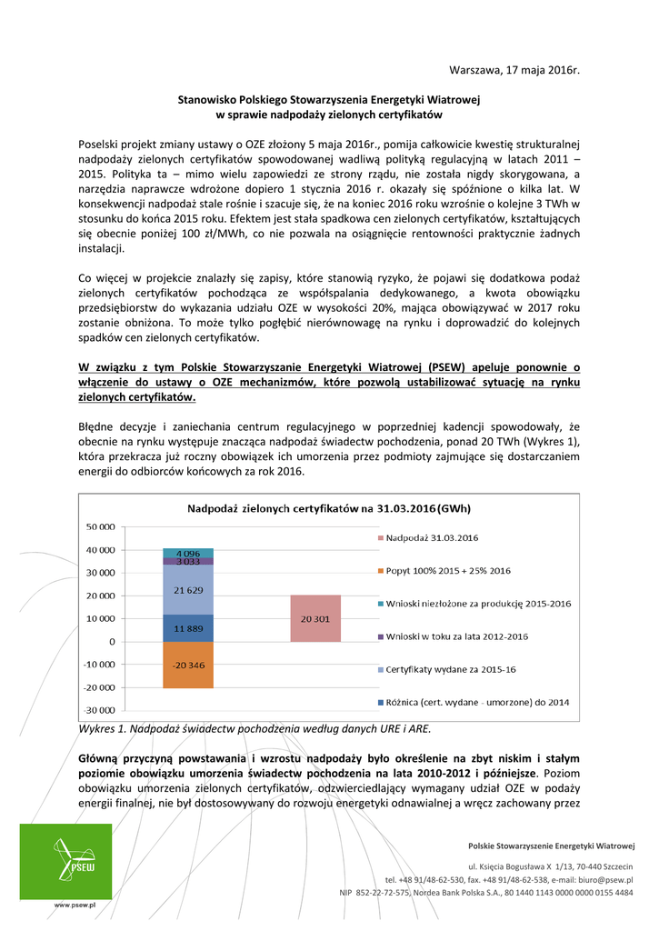 Warszawa, 17 maja 2016r. Stanowisko Polskiego Stowarzyszenia Energetyki Wiatrowej w sprawie nadpodaży zielonych certyfikatów Poselski projekt zmiany ustawy o OZE złożony 5 maja 2016r., pomija całkowicie kwestię strukturalnej nadpodaży zielonych certyfikatów spowodowanej wadliwą polityką regulacyjną w latach 2011 – 2015. Polityka ta – mimo wielu zapowiedzi ze strony rządu, nie została nigdy skorygowana, a narzędzia naprawcze wdrożone dopiero 1 stycznia 2016 r. okazały się spóźnione o kilka lat. W konsekwencji nadpodaż stale rośnie i szacuje się, że na koniec 2016 roku wzrośnie o kolejne 3 TWh w stosunku do końca 2015 roku. Efektem jest stała spadkowa cen zielonych certyfikatów, kształtujących się obecnie poniżej 100 zł/MWh, co nie pozwala na osiągnięcie rentowności praktycznie żadnych instalacji. Co więcej w projekcie znalazły się zapisy, które stanowią ryzyko, że pojawi się dodatkowa podaż zielonych certyfikatów pochodząca ze współspalania dedykowanego, a kwota obowiązku przedsiębiorstw do wykazania udziału OZE w wysokości 20%, mająca obowiązywać w 2017 roku zostanie obniżona. To może tylko pogłębić nierównowagę na rynku i doprowadzić do kolejnych spadków cen zielonych certyfikatów. W związku z tym Polskie Stowarzyszanie Energetyki Wiatrowej (PSEW) apeluje ponownie o włączenie do ustawy o OZE mechanizmów, które pozwolą ustabilizować sytuację na rynku zielonych certyfikatów. Błędne decyzje i zaniechania centrum regulacyjnego w poprzedniej kadencji spowodowały, że obecnie na rynku występuje znacząca nadpodaż świadectw pochodzenia, ponad 20 TWh (Wykres 1), która przekracza już roczny obowiązek ich umorzenia przez podmioty zajmujące się dostarczaniem energii do odbiorców końcowych za rok 2016. Wykres 1. Nadpodaż świadectw pochodzenia według danych URE i ARE. Główną przyczyną powstawania i wzrostu nadpodaży było określenie na zbyt niskim i stałym poziomie obowiązku umorzenia świadectw pochodzenia na lata 2010-2012 i późniejsze. Poziom obowiązku umorzenia zielonych certyfikatów, odzwierciedlający wymagany udział OZE w podaży energii finalnej, nie był dostosowywany do rozwoju energetyki odnawialnej a wręcz zachowany przez Polskie Stowarzyszenie Energetyki Wiatrowej ul. Księcia Bogusława X 1/13, 70-440 Szczecin tel. +48 91/48-62-530, fax. +48 91/48-62-538, e-mail: [email protected] NIP 852-22-72-575, Nordea Bank Polska S.A., 80 1440 1143 0000 0000 0155 4484 okres trzech lat (2010-2012) na stałym poziomie, pomimo, że właśnie w tych trzech latach, obok szybkiego rozwoju sektora wiatrowego, nastąpił gwałtowny i nieplanowany pierwotnie wzrost współspalania, co doprowadziło do narastania nadpodaży i załamania cen zielonych certyfikatów w 2013 roku. Dokonano wprawdzie niewielkiej korekty zwiększającej poziom tego obowiązku od 2013 r. (rozporządzenie Ministra Gospodarki z dnia 18 października 2012r.), ale zwiększenie kwoty obowiązku było równe zaledwie połowie wielkości nadpodaży odnotowanej na koniec 2012 roku. Jednocześnie zmniejszano podstawę (wyłączenie przemysłu energochłonnego), od której oblicza się ten obowiązek, co skutkowało zmniejszeniem popytu w następnych latach o ok. 4 TWh. Od 2012 roku nie zmieniono wielkości kwoty obowiązku, pomimo wielokrotnych deklaracji ze strony rządu o konieczności rozwiązania problemu nadpodaży, która wzrosła w tym czasie z 3,4 TWh (2012) do ponad 20 TWh (marzec 2016). Obecnie stan rynku zielonych certyfikatów stawia w dramatycznej sytuacji wszystkich inwestorów OZE. Założeniem systemu wsparcia wprowadzonego w Polsce w 2005 roku było zagwarantowanie wieloletniej stabilności tego systemu, w tym zapewnienie minimalnych gwarantowanych przychodów ograniczających ryzyko inwestycyjne. Potwierdzono to oficjalnie w dokumencie przyjętym przez Radę Ministrów RP – Krajowym Planie Działania w zakresie energii OZE w dniu 7 grudnia 2010 r. Jednym z mechanizmów mających gwarantować odpowiednią wartość certyfikatów miało być ustalanie przez rząd obowiązku udziału OZE w podaży energii finalnej na poziomie lekko wyprzedzającym skalę realizowanych inwestycji. Taka polityka trwała do 2010 roku. Po tym roku pomimo, że stało się jasne, iż sektor OZE rozwija się dynamicznie, zarzucono pierwotne założenia polityki, doprowadzając do pojawienia się nadpodaży, która wzrastała z każdym rokiem do obecnej liczby równej niemal rocznej produkcji energii z OZE. Także wprowadzone w ustawie o OZE z 20 lutego 2015 r. mechanizmy, mające na celu ograniczenie nadpodaży świadectw pochodzenia, nie poprawią sytuacji przed rokiem 2020, bowiem zostały wprowadzone zbyt późno. W trakcie prac nad ustawą utrzymano na lata 2015 i 2016 wielkości kwoty obowiązku na poziomie ustalonym w październiku 2012 roku, mimo, że problem nadpodaży był już zdiagnozowany i było wiadome, że kwoty obowiązku były dalece niewystarczające w stosunku do powstałego potencjału wytwórczego OZE. Co więcej, ustawa wprowadziła kolejne zwolnienia dla energochłonnych branż gospodarki, które dodatkowo ograniczyły popyt na zielone certyfikaty, a korekty kwoty obowiązku z tego powodu nie uwzględniono. Uchwalenie ustawy o OZE nie zahamowało więc negatywnych trendów na rynku zielonych certyfikatów, jakkolwiek utrzymanie zawartego w niej zapisu o 20% obowiązku w 2017 roku i dalszych latach pozwoliłoby przynajmniej na redukcję około 30% nadmiaru świadectw pochodzenia na rynku, a tym samym w perspektywie średnioterminowej doprowadziłoby do przywrócenia równowagi podażowo-popytowej, poprawiając kondycję finansową niezależnych producentów energii elektrycznej z OZE (Wykres 3). Polskie Stowarzyszenie Energetyki Wiatrowej ul. Księcia Bogusława X 1/13, 70-440 Szczecin tel. +48 91/48-62-530, fax. +48 91/48-62-538, e-mail: [email protected] NIP 852-22-72-575, Nordea Bank Polska S.A., 80 1440 1143 0000 0