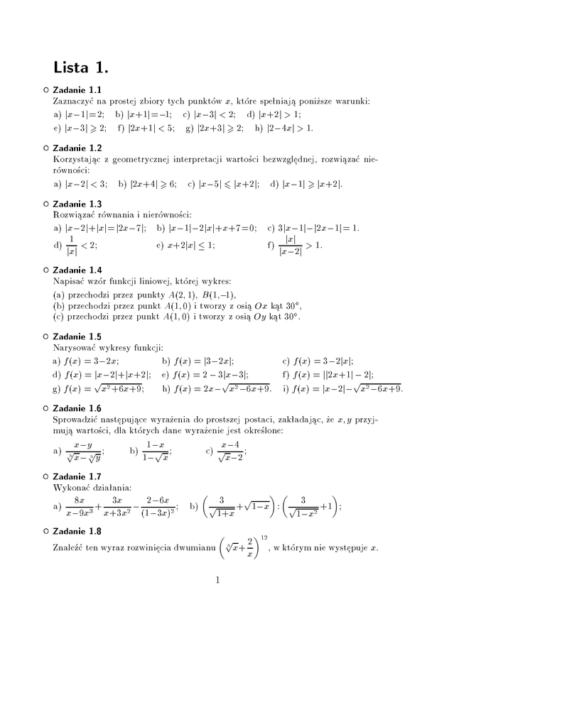 Lista 1. Zadanie 1.1 Zaznaczy na prostej zbiory tych punktw x, ktre speniaj ponisze warunki: a) jx ; 1j =2 b) jx+1j = ;1 c) jx ; 3j < 2 d) jx+2j > 1 e) jx ; 3j 2 f) j2x+1j < 5 g) j2x+3j 2 h) j2 ; 4xj > 1: Zadanie 1.2 Korzystajc z geometrycznej interpretacji wartoci bezwzgldnej, rozwiza nierwnoci: a) jx ; 2j < 3 b) j2x+4j 6 c) jx ; 5j jx+2j d) jx ; 1j jx+2j: Zadanie 1.3 Rozwiza rwnania i nierwnoci: a) jx ; 2j + jxj = j2x ; 7j b) jx ; 1j; 2jxj +x+7=0 c) 3jx ; 1j;j2x ; 1j = 1: e) x+2jxj 1 f) jxj;xj2j > 1. d) jx1 j < 2 Zadanie 1.4 Napisa wzr funkcji liniowej, ktrej wykres: (a) przechodzi przez punkty A(2 1) B(1;1), (b) przechodzi przez punkt A(1 0) i tworzy z osi Ox kt 30 , (c) przechodzi przez punkt A(1 0) i tworzy z osi Oy kt 30 . Zadanie 1.5 Narysowa wykresy funkcji: a) f(x) = 3 ; 2x b) f(x) = j3 ; 2xj c) f(x) = 3 ; 2jxj d) f(x) = p jx ; 2j + jx+2j e) f(x) = 2 ; 3pjx ; 3j f) f(x) = jj2x+1j ; 2j p 2 2 g) f(x) = x +6x+9 h) f(x) = 2x ; x ; 6x+9. i) f(x) = jx ; 2j; x2 ; 6x+9. Zadanie 1.6 Sprowadzi nastpujce wyraenia do prostszej postaci, zakadajc, e x y przyjmuj wartoci, dla ktrych dane wyraenie jest okrelone: 1 ;px x;4 y p b) c) a) p3 xx ; p 3 ; y 1; x x;2 Zadanie 1.7 Wykona dziaania: 3x ; 2 ; 6x b) p 3 + p1 ; x : p 3 +1 a) x ;8x9x3 + x+3x 2 (1 ; 3x)2 1+x 1 ; x2 Zadanie 1.8 p 2 12 Znale ten wyraz rozwinicia dwumianu 3 x+ x , w ktrym nie wystpuje x. 1 Zadanie 1.9 p p 24 Znale wyrazy rozwinicia dwumianu 5 3+ 7 2 , ktre s liczbami naturalnymi. Zadanie 1.10 Wykorzystujc wzr Newtona obliczy: n n n n n a) 0 + 1 + 2 + + n ; 1 + n n n n n n n n ;1 n ;2 b) 0 2 + 1 2 + 2 2 + + n ; 1 2+ n c) n0 ; n1 + n2 ; + n ;n 1 +(;1)n nn n n n : d) n0 2n ; n1 2n;1 + n2 2n;2 ; +(;1)n;1 n ; 2+( ; 1) 1 n Zadanie 1.11 Znale trjmian kwadratowy y = ax2+bx+c , wiedzc, e do jego wykresu naley punkt A(3 0) i e dla x=1 przyjmuje on warto maksymaln rwn 12. Zadanie 1.12 Dla jakiej wartoci parametru m kade z rwna: (i) mx2 ; 3x+m = 0 , (ii) (4m+1)x2 ; (4m ; 1)x+m ; 1 = 0 , (iii) x2 +mx ; m2 ; m ; 2 = 0 ma: a) tylko jedno rozwizanie, b) dwa rozwizania rnych znakw, c) dwa rozwizania dodatnie, d) dwa rozwizania, ktre s sinusem i kosinusem tego samego kta? Zadanie 1.13 Okreli ilo rozwiza rwnania w zalenoci od parametru m: a) jx2 ; x ; 6j = m b) j3x2 ; 1j +2x ; m = 0 c) jx2 +2x ; 3j =m+1: Lista 2. Zadanie 2.1 a) Wyznaczy wspczynniki a i b wielomianu W(x) = x4 ; 3x3 +x2 +ax+b tak, aby przy dzieleniu go przez wielomian Q(x) = x2 ; 2x+2 reszta bya rwna: 0 1 x. b) Nie wykonujc dzielenia, wyznaczy reszt z dzielenia: (i) wielomianu W(x) = 2x2001 ; 3x117 +5x+2 przez wielomian Q(x) = x2 ; 1 (ii) wielomianu W(x) = 2x21 ;32x11 ;8x;2 przez wielomian Q(x) = x2 ;x;2: 2 Zadanie 2.2 Rozwiza rwnania i nierwnoci: a) x4 ; 1=0 b) x3 ; 2x2 +2x ; 1=0 c) 9x4 ; 10x2 +1=0 4 2 d) x ; 12x +32 < 0 e) x4 ; 12x2 +36 0 f) jx4 ; 1j < 3x2 +3. Zadanie 2.3 Rozwiza rwnania i nierwnoci: p p p p a) x+ 10x+6=9 b) 2x+1+ x ; 3=2 x c) p2 2 = x1 x+ px ; x p p 1 d) x < x e) x ; 6 ; 10 ; x 1 f) x < x2 +x ; 2. Zadanie 2.4 Naszkicowa wykresy funkcji: a) f(x)=2 ; 3x b) f(x)=2 ; 3jxj c) f(x)= j2 ; 3x j d) f(x)=2 ; 3x;1 . Zadanie 2.5 Rozwiza rwnania i nierwnoci: p a) x; 34 = 81 b) x; 23 = 42 e) x;1 x;2 f) x2 x;2 . Zadanie 2.6 Rozwiza rwnania i nierwnoci: q p q p x 3x x ;2 x +1 x x x a) 2 7 = 4 b) 8 +18 ; 2 27 = 0 c) ( 2 ; 3) +( 2+ 3)x = 4. d) 22x+4 ; 4x > 15 e) 0 < 3x2;x;6 1 f) 2x1; 1 > 1 ;12x;1 : Zadanie 2.7 Obliczy: a) log2p2 18 b) log9 tg 3 c) log2 3 log3 4 log127 128 d) 22 logp2 3 . Zadanie 2.8 Nie korzystajc z tablic logarytmw, uporzdkowa wedug wielkoci podane liczby: log3 6 log4 8 log3 5. Zadanie 2.9 Sporzdzi wykresy funkcji: a) f(x) = log (x ; 3) b) f(x) = 2 ; log (x ; 3) c) f(x) = j log(x ; 3) ; 2j Zadanie 2.10 Rozwiza p rwnania p i nierwnoci: a) log x ; 5+log 2x+3+1 = log 30 b) log4 (log2 x)+log2 (log4 x) = 2 d) log 51 (log4 (x2 ; 5)) > 0 c) log 12 jx ; 1j < 2 3 Lista 3. Zadanie 3.1 Wyznaczy okres podstawowy funkcji: f(x) = sin x3 f(x) = sin x f(x) = cos 23x f(x) = tg x3 f(x) = sin x f(x) = ctg x3 : Zadanie 3.2 Narysowa wykresy i okreli zbir wartoci funkcji: c) f(x) = 2 sin x2 ; 1 a) f(x) = cos (x+ 3 ) b) f(x) = sin 2x d) f(x)=sin jxj e) f(x)= j sin x+cos xj f) f(x)= j sin xj + j cos xj g) f(x)=sin x ;j sin xj. Zadanie 3.3 Obliczy bez uycia tablic: a) sin 12 cos 18 +sin 18 cos 12 b) (sin 15 +sin 75)(cos 75 ; cos 15 ) Zadanie 3.4 Udowodni tosamoci: a) sin 2x ; tg x=cos2x tg x b) 4 sin4 x+sin2 2x=4 sin2 x x+ctg x =1+sin x d) 1 c) cos ctg x 1+tg x tg 2x =cos 2x: Zadanie 3.5 Rozwiza rwnania: p 2 3(x)=ctg(x) a) 2 cos2(x)=3 cos(x)+2 b) ctg c) 2 p p p p 3 sin (x)=cos x d) sin(x)+ 3 cos(x)= 3 e) sin(x)+ 3cos(x)=0 f) 3 sin(x) ; cos(x)=2. Zadanie 3.6 Rozwiza nierwnoci: p p a) 3tg x ; 1 < 0 b) j cos x ; 12 j < 1 c) sin x ; 3 cos x > 1 p 2 d) j sin xj > 22 e) 1 ; tg3 x 0 f) sin xj sin xj 12 . Zadanie 3.7 Obliczy: p ! p 1 3 a) arcsin ; 2 b) arcsin 2 c) arccos ; 23 d) arccos sin 5 3 p e) arc tg ; p1 f) arc tg ; 3 g) sin(arcsin 1) h) sin(arccos 1) 3 17 i) sin(arccos 0) j) arcsin sin 3 k) arccos sin 3 l) arc tg ctg 3 . 4 Zadanie 3.8 Okreli dziedziny naturalne i zbiory wartoci podanych funkcji: p p a) f(x) = sin x b) g(x) = 1 + 1cos x c) h(x) = 1 + cos x 3 d) f(x) = xx ;;11 e) q(x) = (log3 (1 + jxj)) f) q(x) = (log3(1 ; x));1 . Lista 4. Zadanie 4.1 Uzasadni, e: (i) rodki bokw dowolnego czworokta s wierzchokami rwnolegoboku (ii) ze rodkowych trjkta mona utworzy trjkt. Zadanie 4.2 Sprawdzi, e punkty A(-2,1)B(-1,-4)C(2,-1)D(1,4) s wierzchokami rwnolegoboku. Znale wsprzdne punktu przecicia przektnych. Zadanie 4.3 ;! Wektory ;! a b ;! c o dugoci 1 speniaj warunek ;! a + ;! b + ;! c = ;! 0 . Obliczy ; ! ; ! ;! ; ! ; ! ; ! a b + b c + a c. Zadanie 4.4 ;! Wektory ;! a b tworz kt 23 oraz j;! b j = j2;! a j. Dla jakiej staej c wektory ;! a +c;! b ; ! ; ! oraz a ; b s prostopade. Zadanie 4.5 ;! Wektory ;! a b s prostopade i maj dugo 1. Znale kt midzy wektorami ;! ; ! u = 6 a + 4;! b i;! w = 2;! a + 10;! b. Zadanie 4.6 Znale kt midzy wektorami: (i);! a = 2 ;2] oraz;! b = 3 3] ; ! (ii) a = ;4 3] oraz ;