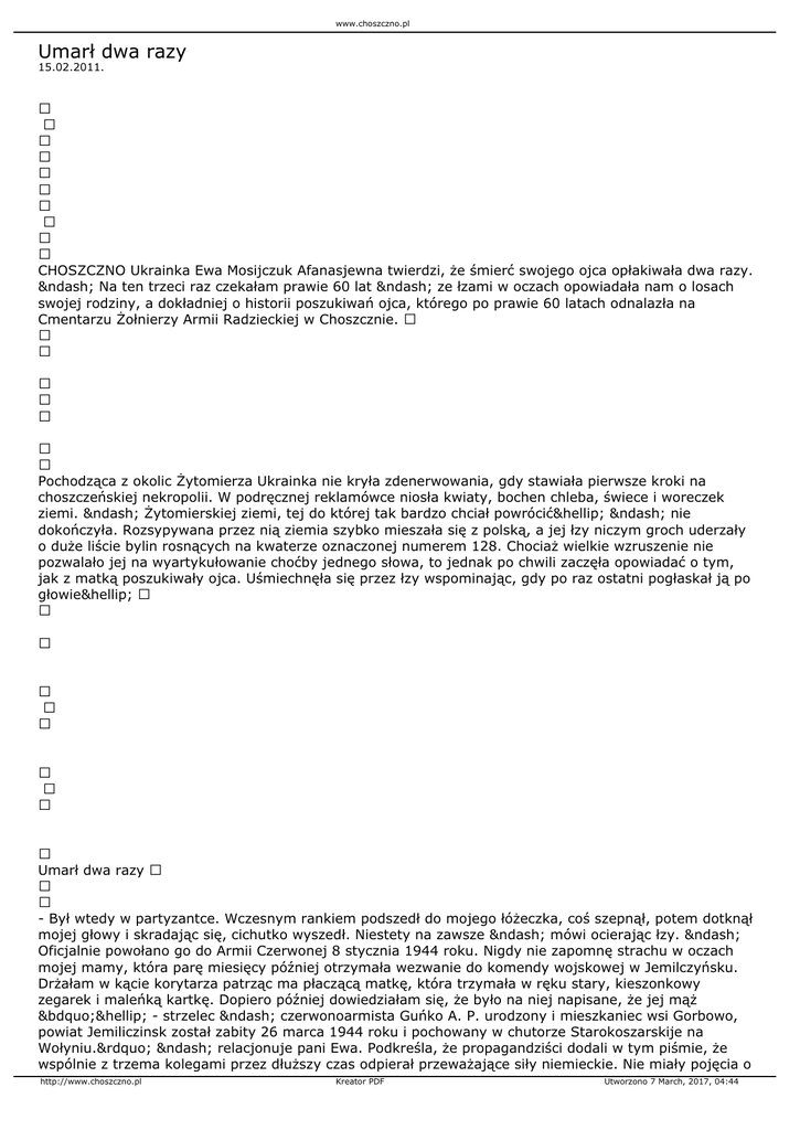 www.choszczno.pl Umarł dwa razy 15.02.2011. CHOSZCZNO Ukrainka Ewa Mosijczuk Afanasjewna twierdzi, że śmierć swojego ojca opłakiwała dwa razy. – Na ten trzeci raz czekałam prawie 60 lat – ze łzami w oczach opowiadała nam o losach swojej rodziny, a dokładniej o historii poszukiwań ojca, którego po prawie 60 latach odnalazła na Cmentarzu Żołnierzy Armii Radzieckiej w Choszcznie. Pochodząca z okolic Żytomierza Ukrainka nie kryła zdenerwowania, gdy stawiała pierwsze kroki na choszczeńskiej nekropolii. W podręcznej reklamówce niosła kwiaty, bochen chleba, świece i woreczek ziemi. – Żytomierskiej ziemi, tej do której tak bardzo chciał powrócić… – nie dokończyła. Rozsypywana przez nią ziemia szybko mieszała się z polską, a jej łzy niczym groch uderzały o duże liście bylin rosnących na kwaterze oznaczonej numerem 128. Chociaż wielkie wzruszenie nie pozwalało jej na wyartykułowanie choćby jednego słowa, to jednak po chwili zaczęła opowiadać o tym, jak z matką poszukiwały ojca. Uśmiechnęła się przez łzy wspominając, gdy po raz ostatni pogłaskał ją po głowie… Umarł dwa razy - Był wtedy w partyzantce. Wczesnym rankiem podszedł do mojego łóżeczka, coś szepnął, potem dotknął mojej głowy i skradając się, cichutko wyszedł. Niestety na zawsze – mówi ocierając łzy. – Oficjalnie powołano go do Armii Czerwonej 8 stycznia 1944 roku. Nigdy nie zapomnę strachu w oczach mojej mamy, która parę miesięcy później otrzymała wezwanie do komendy wojskowej w Jemilczyńsku. Drżałam w kącie korytarza patrząc ma płaczącą matkę, która trzymała w ręku stary, kieszonkowy zegarek i maleńką kartkę. Dopiero później dowiedziałam się, że było na niej napisane, że jej mąż „… - strzelec – czerwonoarmista Guńko A. P. urodzony i mieszkaniec wsi Gorbowo, powiat Jemiliczinsk został zabity 26 marca 1944 roku i pochowany w chutorze Starokoszarskije na Wołyniu.” – relacjonuje pani Ewa. Podkreśla, że propagandziści dodali w tym piśmie, że wspólnie z trzema kolegami przez dłuższy czas odpierał przeważające siły niemieckie. Nie miały pojęcia o http://www.choszczno.pl Kreator PDF Utworzono 7 March, 2017, 04:44 www.choszczno.pl tym, że to była jedna z wojennych pomyłek, a ich ojciec nadal maszerował na Berlin z Armią Czerwoną. Po zakończeniu wojny matka rozpoczęła poszukiwanie jego mogiły i tu rodzina przeżyła kolejny szok. Okazuje się, że w 1946 roku otrzymują oficjalną informację, że „…czerwonoarmista Guńko Afanasij Pietrowicz zmarł od ran 15 lutego 1945 roku i został pochowany w miejscowości Szternberg.” Kilkudziesięcioletnie poszukiwania - Chociaż wszechwiedzący towarzysze z KGB nie pozwalali nam na zbyt wiele, twierdząc, że „tam gdzie ojciec leży jest mu dobrze”, to jednak moja matka była bardzo konsekwentna, a raczej uparta. Umierając w 1984 roku zobowiązała mnie i moich czterech braci do dalszego poszukiwania – kontynuuje E. Mosijczuk. - W latach osiemdziesiątych mój najmłodszy syn Dymitr służył w wojsku na terenie byłej NRD i jego przełożony Kuzniecow O.B. pomógł stwierdzić, iż w Szternbergu nie ma cmentarzy wojskowych, natomiast w pobliskich Szwerin i Gistrow nie widnieje nazwisko Guńko. Wskazał też na fakt, że Armia Radziecka zaczęła forsować Odrę w kwietniu 1945 roku, więc mogiły ojca należałoby poszukiwać na terenie obecnej Polski. Przychodziły kolejne, negatywne odpowiedzi z Czerwonego Krzyża i Czerwonego Półksiężyca, komend, sztabów, archiwów, muzeów, zmarli moi bracia, ale ja byłam nadal uparta, aż w końcu dopięłam swego – pokazuje nam najważniejszy dokument. Słutowo kiedyś Steinberg W 2000 roku z kijowskiego Czerwonego Krzyża przyszło powiadomienie, że Guńko A. P. zmarł 15 lutego 1945 roku i został pochowany w Słutowie (obecnie gmina Recz, kiedyś Steinberg a nie jak sugerowano Szternberg), a później przeniesiony do zbiorowej mogiły numer 128 na Cmentarzu Żołnierzy Armii Radzieckiej w Choszcznie. Podkreśla, że nie stać jej było na przyjazd do Choszczna i trafiła tu głównie dzięki ukraińskiej telewizji Inter, która postanowiła nakręcić reportaż z tego wydarzenia. - Maładiec Ewa, tak pewnie tata by powiedział – podsumowała kładąc na mogile chleb i częstując wszystkich kieliszkiem ukraińskiej wódki. Odjeżdżając z Choszczna zdradziła nam, że marzy o tym, by jeszcze raz tu wrócić, ale ze swoimi synami, czyli wnukami Guńko A. P. TADEUSZ KRAWIEC http://www.choszczno.pl Kreator PDF Utworzono 7 March, 2017, 04:44 www.choszczno.pl PS. Wówczas wielkiej radości pani Ewy Mosijczuk nie przyćmił nawet fakt, że w kilka godzin po jej pierwszej wizycie na cmentarzu z mogiły ojca zniknęły kwiaty, świece i chleb, który przywiozła z Ukrainy. Dziś pani Ewa tego nie wie, ale co roku, w ukraińskie święto zmarłych (tydzień po naszej Wielkanocy), a także 15 lutego, na kwaterze w której spoczywa jej ojciec, ktoś kładzie kwiaty i zapala znicz. Jutro też zapłonie… Niedawno Rosjanie odkryli wojenne archiwa. Dzisiaj każdy i to dosłownie w kilka minut może odnaleźć poszukiwaną osobę. Pani Ewa, jej matka i bracia potrzebowali na to ponad 60 lat. Poniżej prezentujemy zdjęcie z księgi medycznej wojskowego szpitala w którym zmarł Guńko Afanasij Pietrowicz. Zwróćmy uwagę na fakt, że na tej stronie widnieje jeszcze sześć innych nazwisk żołnierzy, którzy zostali pochowani w opisywanym Słutowie… Tadeusz Krawiec http://www.choszczno.pl Kreator PDF Utworzono 7 March, 2017, 04:44