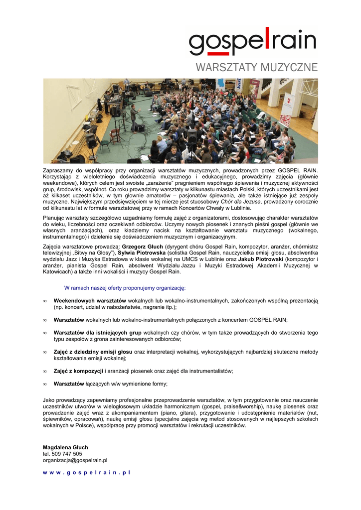 WARSZTATY MUZYCZNE Zapraszamy do współpracy przy organizacji warsztatów muzycznych, prowadzonych przez GOSPEL RAIN. Korzystając z wieloletniego doświadczenia muzycznego i edukacyjnego, prowadzimy zajęcia (głównie weekendowe), których celem jest swoiste „zaraŜenie” pragnieniem wspólnego śpiewania i muzycznej aktywności grup, środowisk, wspólnot. Co roku prowadzimy warsztaty w kilkunastu miastach Polski, których uczestnikami jest aŜ kilkaset uczestników, w tym głownie amatorów – pasjonatów śpiewania, ale takŜe istniejące juŜ zespoły muzyczne. Największym przedsięwzięciem w tej mierze jest stuosobowy Chór dla Jezusa, prowadzony corocznie od kilkunastu lat w formule warsztatowej przy w ramach Koncertów Chwały w Lublinie. Planując warsztaty szczegółowo uzgadniamy formułę zajęć z organizatorami, dostosowując charakter warsztatów do wieku, liczebności oraz oczekiwań odbiorców. Uczymy nowych piosenek i znanych pieśni gospel (głównie we własnych aranŜacjach), oraz kładziemy nacisk na kształtowanie warsztatu muzycznego (wokalnego, instrumentalnego) i dzielenie się doświadczeniem muzycznym i organizacyjnym. Zajęcia warsztatowe prowadzą: Grzegorz Głuch (dyrygent chóru Gospel Rain, kompozytor, aranŜer, chórmistrz telewizyjnej „Bitwy na Głosy”), Sylwia Piotrowska (solistka Gospel Rain, nauczycielka emisji głosu, absolwentka wydziału Jazz i Muzyka Estradowa w klasie wokalnej na UMCS w Lublinie oraz Jakub Piotrowski (kompozytor i aranŜer, pianista Gospel Rain, absolwent Wydziału Jazzu i Muzyki Estradowej Akademii Muzycznej w Katowicach) a takŜe inni wokaliści i muzycy Gospel Rain. W ramach naszej oferty proponujemy organizację: • Weekendowych warsztatów wokalnych lub wokalno-instrumentalnych, zakończonych wspólną prezentacją (np. koncert, udział w naboŜeństwie, nagranie itp.); • Warsztatów wokalnych lub wokalno-instrumentalnych połączonych z koncertem GOSPEL RAIN; • Warsztatów dla istniejących grup wokalnych czy chórów, w tym takŜe prowadzących do stworzenia tego typu zespołów z grona zainteresowanych odbiorców; • Zajęć z dziedziny emisji głosu oraz interpretacji wokalnej, wykorzystujących najbardziej skuteczne metody kształtowania emisji wokalnej; • Zajęć z kompozycji i aranŜacji piosenek oraz zajęć dla instrumentalistów; • Warsztatów łączących w/w wymienione formy; Jako prowadzący zapewniamy profesjonalne przeprowadzenie warsztatów, w tym przygotowanie oraz nauczenie uczestników utworów w wielogłosowym układzie harmonicznym (gospel, praise&worship), naukę piosenek oraz prowadzenie zajęć wraz z akompaniamentem (piano, gitara), przygotowanie i udostępnienie materiałów (nut, śpiewników, opracowań), naukę emisji głosu (specjalne zajęcia wg metod stosowanych w najlepszych szkołach wokalnych w Polsce), współpracę przy promocji warsztatów i rekrutacji uczestników. Magdalena Głuch tel. 509 747 505 [email protected] w w w . g o s p e l r a i n . p l
