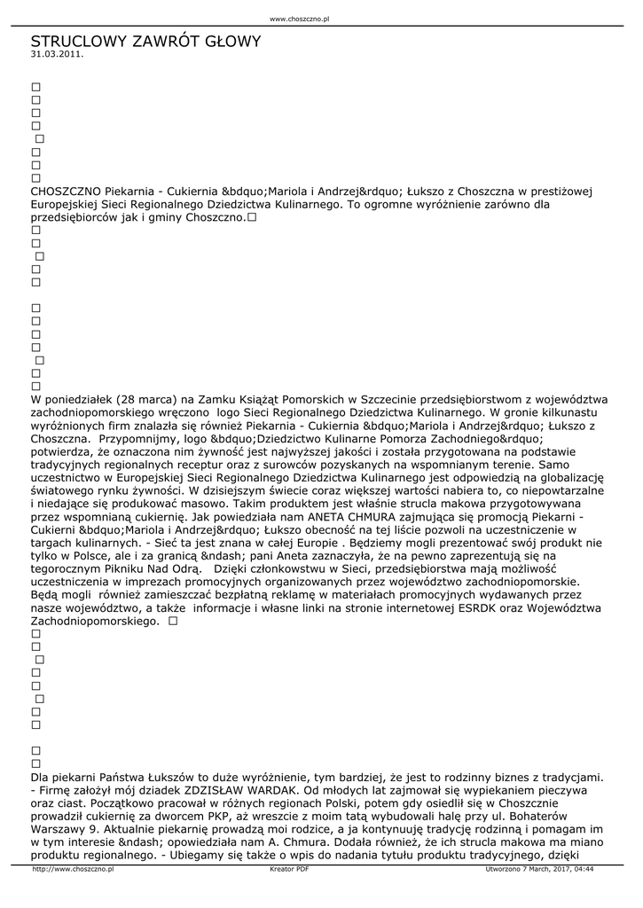 www.choszczno.pl STRUCLOWY ZAWRÓT GŁOWY 31.03.2011. CHOSZCZNO Piekarnia - Cukiernia „Mariola i Andrzej” Łukszo z Choszczna w prestiżowej Europejskiej Sieci Regionalnego Dziedzictwa Kulinarnego. To ogromne wyróżnienie zarówno dla przedsiębiorców jak i gminy Choszczno. W poniedziałek (28 marca) na Zamku Książąt Pomorskich w Szczecinie przedsiębiorstwom z województwa zachodniopomorskiego wręczono logo Sieci Regionalnego Dziedzictwa Kulinarnego. W gronie kilkunastu wyróżnionych firm znalazła się również Piekarnia - Cukiernia „Mariola i Andrzej” Łukszo z Choszczna. Przypomnijmy, logo „Dziedzictwo Kulinarne Pomorza Zachodniego” potwierdza, że oznaczona nim żywność jest najwyższej jakości i została przygotowana na podstawie tradycyjnych regionalnych receptur oraz z surowców pozyskanych na wspomnianym terenie. Samo uczestnictwo w Europejskiej Sieci Regionalnego Dziedzictwa Kulinarnego jest odpowiedzią na globalizację światowego rynku żywności. W dzisiejszym świecie coraz większej wartości nabiera to, co niepowtarzalne i niedające się produkować masowo. Takim produktem jest właśnie strucla makowa przygotowywana przez wspomnianą cukiernię. Jak powiedziała nam ANETA CHMURA zajmująca się promocją Piekarni Cukierni „Mariola i Andrzej” Łukszo obecność na tej liście pozwoli na uczestniczenie w targach kulinarnych. - Sieć ta jest znana w całej Europie . Będziemy mogli prezentować swój produkt nie tylko w Polsce, ale i za granicą – pani Aneta zaznaczyła, że na pewno zaprezentują się na tegorocznym Pikniku Nad Odrą. Dzięki członkowstwu w Sieci, przedsiębiorstwa mają możliwość uczestniczenia w imprezach promocyjnych organizowanych przez województwo zachodniopomorskie. Będą mogli również zamieszczać bezpłatną reklamę w materiałach promocyjnych wydawanych przez nasze województwo, a także informacje i własne linki na stronie internetowej ESRDK oraz Województwa Zachodniopomorskiego. Dla piekarni Państwa Łukszów to duże wyróżnienie, tym bardziej, że jest to rodzinny biznes z tradycjami. - Firmę założył mój dziadek ZDZISŁAW WARDAK. Od młodych lat zajmował się wypiekaniem pieczywa oraz ciast. Początkowo pracował w różnych regionach Polski, potem gdy osiedlił się w Choszcznie prowadził cukiernię za dworcem PKP, aż wreszcie z moim tatą wybudowali halę przy ul. Bohaterów Warszawy 9. Aktualnie piekarnię prowadzą moi rodzice, a ja kontynuuję tradycję rodzinną i pomagam im w tym interesie – opowiedziała nam A. Chmura. Dodała również, że ich strucla makowa ma miano produktu regionalnego. - Ubiegamy się także o wpis do nadania tytułu produktu tradycyjnego, dzięki http://www.choszczno.pl Kreator PDF Utworzono 7 March, 2017, 04:44 www.choszczno.pl czemu strucla będzie rozreklamowana i rozpoznawalna w świecie kulinarnym oraz kojarzona z Choszcznem – powiedziała pani Aneta. Choszcznianie znają już smak strucli makowej, a poniedziałkowa uroczystość odbiła się w regionie szerokim echem. – Mnie także ten sukces ogromnie ucieszył. Cieszy też to, że firma państwa Łukszów stała się nie tylko wizytówką naszej gminy, ale także województwa zachodniopomorskiego – mówi burmistrz ROBERT ADAMCZYK. Dzisiaj, w ramach tzw. „Dnia przedsiębiorczości” goszczą w naszym biurze promocji dziewczęta z Zespołu Szkół Nr 1 w Choszcznie. Poczęstowaliśmy je struclą, którą można kupić w sklepie naprzeciwko magistratu. – Przepyszne – stwierdziły zgodnie Agata, Natalia i Paulina. Ich zdaniem powinniśmy być dumni z faktu, że mamy w Choszcznie taki kulinarny rodzynek i proponują byśmy częstowali tym wypiekiem gości, którzy przyjeżdżają do nas np. na uroczystości rodzinne. Dodajmy też, że przepis na opisywaną struclę jest znany i przekazywany w rodzinie z pokolenia na pokolenie od ponad 80 lat, a w samych Choszcznie zajadamy się nią od ponad 40 lat. Katarzyna Jezierska http://www.choszczno.pl Kreator PDF Utworzono 7 March, 2017, 04:44
