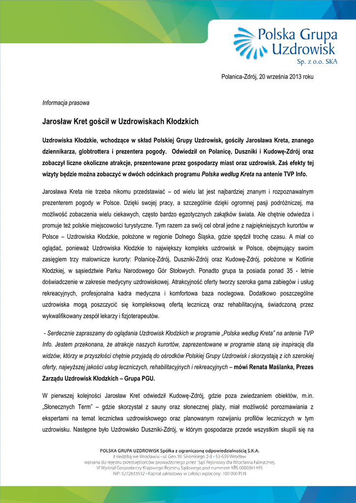 Polanica-Zdrój, 20 września 2013 roku Informacja prasowa Jarosław Kret gościł w Uzdrowiskach Kłodzkich Uzdrowiska Kłodzkie, wchodzące w skład Polskiej Grupy Uzdrowisk, gościły Jarosława Kreta, znanego dziennikarza, globtrottera i prezentera pogody. Odwiedził on Polanicę, Duszniki i Kudowę-Zdrój oraz zobaczył liczne okoliczne atrakcje, prezentowane przez gospodarzy miast oraz uzdrowisk. Zaś efekty tej wizyty będzie można zobaczyć w dwóch odcinkach programu Polska według Kreta na antenie TVP Info. Jarosława Kreta nie trzeba nikomu przedstawiać – od wielu lat jest najbardziej znanym i rozpoznawalnym prezenterem pogody w Polsce. Dzięki swojej pracy, a szczególnie dzięki ogromnej pasji podróżniczej, ma możliwość zobaczenia wielu ciekawych, często bardzo egzotycznych zakątków świata. Ale chętnie odwiedza i promuje też polskie miejscowości turystyczne. Tym razem za swój cel obrał jedne z najpiękniejszych kurortów w Polsce – Uzdrowiska Kłodzkie, położone w regionie Dolnego Śląska, gdzie spędził trochę czasu. A miał co oglądać, ponieważ Uzdrowiska Kłodzkie to największy kompleks uzdrowisk w Polsce, obejmujący swoim zasięgiem trzy malownicze kurorty: Polanicę-Zdrój, Duszniki-Zdrój oraz Kudowę-Zdrój, położone w Kotlinie Kłodzkiej, w sąsiedztwie Parku Narodowego Gór Stołowych. Ponadto grupa ta posiada ponad 35 - letnie doświadczenie w zakresie medycyny uzdrowiskowej. Atrakcyjność oferty tworzy szeroka gama zabiegów i usług rekreacyjnych, profesjonalna kadra medyczna i komfortowa baza noclegowa. Dodatkowo poszczególne uzdrowiska mogą poszczycić się kompleksową ofertą leczniczą oraz rehabilitacyjną, świadczoną przez wykwalifikowany zespół lekarzy i fizjoterapeutów. - Serdecznie zapraszamy do oglądania Uzdrowisk Kłodzkich w programie „Polska według Kreta” na antenie TVP Info. Jestem przekonana, że atrakcje naszych kurortów, zaprezentowane w programie staną się inspiracją dla widzów, którzy w przyszłości chętnie przyjadą do ośrodków Polskiej Grupy Uzdrowisk i skorzystają z ich szerokiej oferty, najwyższej jakości usług leczniczych, rehabilitacyjnych i rekreacyjnych – mówi Renata Maślanka, Prezes Zarządu Uzdrowisk Kłodzkich – Grupa PGU. W pierwszej kolejności Jarosław Kret odwiedził Kudowę-Zdrój, gdzie poza zwiedzaniem obiektów, m.in. „Słonecznych Term” – gdzie skorzystał z sauny oraz słonecznej plaży, miał możliwość porozmawiania z ekspertami na temat lecznictwa uzdrowiskowego oraz planowanym rozwijaniu profilów leczniczych w tym uzdrowisku. Następne było Uzdrowisko Duszniki-Zdrój, w którym gospodarze przede wszystkim skupili się na zaprezentowaniu zabiegów borowinowych oraz kąpieli igliwiowych, z których słynie ośrodek. Dziennikarz odwiedził również stację na Jamrozowej Polanie, słynącej z zawodów letniego biathlonu. Ostatnim punktem dziennikarskiej wizyty była Polanica-Zdrój, gdzie odbyło się spotkanie w pijalni wód mineralnych. Jarosław Kret mógł usłyszeć jak powstaje woda mineralna, skąd spływa i gdzie znajduje się źródło wód, produkowanych przez Uzdrowiska Kłodzkie. Gość odwiedził uzdrowiskowy basen, poznał zalety kriosauny, a na koniec zjechał torem saneczkowym w towarzystwie burmistrza Polanicy-Zdroju. Przez cały dzień prezenterowi towarzyszyła kamera, dzięki czemu już w najbliższe niedziele, 22 września oraz 29 września br., o godzinie 14:00, na antenie TVP Info w programie Polska według Kreta, widzowie będą mieli okazję poznać – Uzdrowiska Kłodzkie, popularne kurorty z wieloletnią tradycją w regionie Dolnego Śląska, do których bardzo chętnie przyjeżdżają nie tylko polscy turyści, ale także zagraniczni sąsiedzi. *** Polska Grupa Uzdrowisk (PGU), została powołana do życia w 2011 roku. Obecnie jest największą, bo składająca się z sześciu kurortów, siecią uzdrowisk w całej Polsce, w składzie: Uzdrowiska Kłodzkie, a wraz z nim Uzdrowiska: Polanica, Duszniki i Kudowa, a także Uzdrowisko Cieplice, Uzdrowisko Połczyn oraz Uzdrowisko Świeradów - Czerniawa. Kurorty te posiadają najszerszą ofertą lecznictwa i turystyki uzdrowiskowej, w oparciu o unikatowe na skalę kraju i Europy surowce lecznicze, takie jak wody mineralne, borowina, świerk, czy solanka. To jedne z najlepiej rozpoznawalnych polskich zdrojów, które mogą się pochwalić nie tylko całoroczną ofertą i wysoką jakością usług leczniczych i rehabilitacyjnych, ale także wielowiekową tradycją w lecznictwie uzdrowiskowym. Polska Grupa Uzdrowisk to dzisiaj nie tylko tradycyjne lecznictwo i rehabilitacja oparta o naturalne produkty lecznicze i wyjątkowe warunki klimatyczne, ale także najwyższej jakości usługi rekreacyjne, regeneracyjne oraz kosmetyczne. Poprzez szeroką i różnorodną ofertę pobytów leczniczych, wypoczynkowych oraz SPA&wellness, Polska Grupa Uzdrowisk kreuje modę na wyjazdy do uzdrowisk, dzięki którym każdy z gości ma szansę na odpoczynek pod fachowym okiem lekarzy i specjalistów rehabilitacji. Dzięki temu propagowany jest zdrowy i aktywny styl życia. Ponadto, o komplementarności usług świadczy dostępność naturalnych produktów kosmetycznych oraz szerokiej gamy wód mineralnych, sygnowanych marką Staropolanka i Wielka Pieniawa, które są atutem każdego kurortu Polskiej Grupy Uzdrowisk.