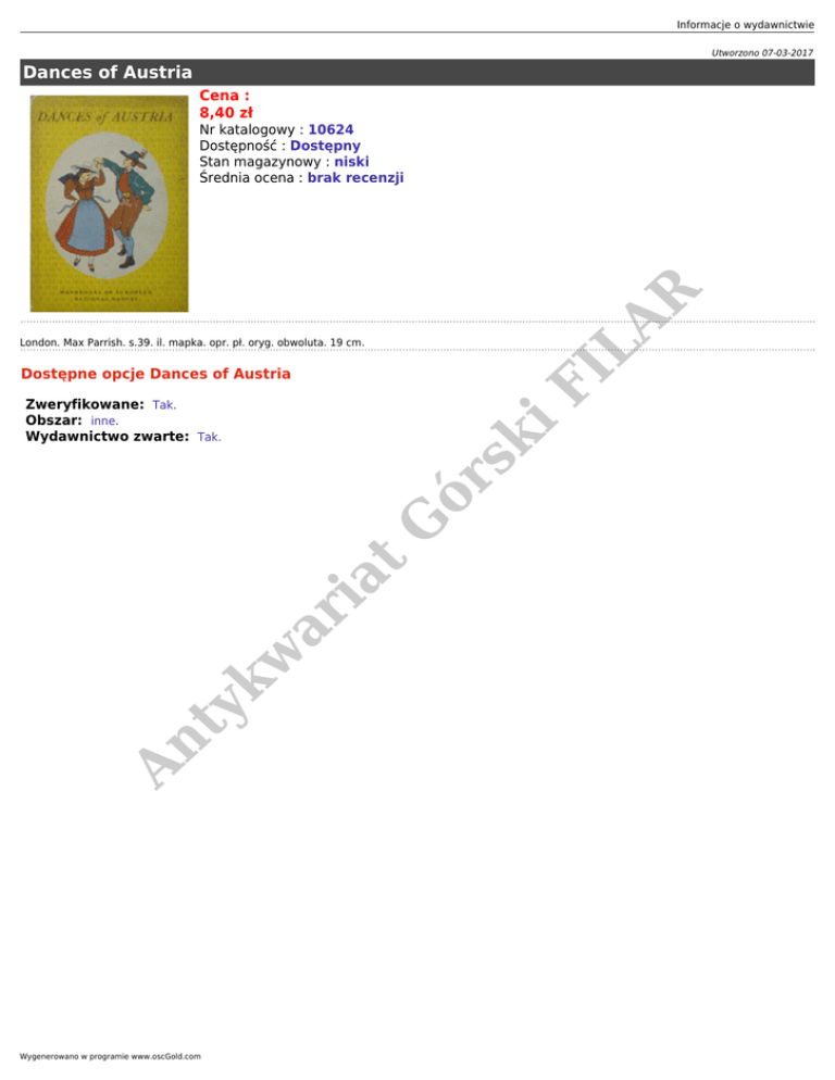 Informacje o wydawnictwie Utworzono 07-03-2017 Dances of Austria Cena : 8,40 zł LA R Nr katalogowy : 10624 Dostępność : Dostępny Stan magazynowy : niski Średnia ocena : brak recenzji London. Max Parrish. s.39. il. mapka. opr. pł. oryg. obwoluta. 19 cm. FI Dostępne opcje Dances of Austria An ty k w ar ia t G ór sk i Zweryfikowane: Tak. Obszar: inne. Wydawnictwo zwarte: Tak. Wygenerowano w programie www.oscGold.com