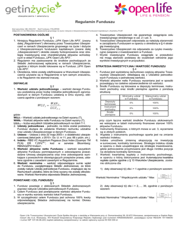 Regulamin Funduszu Kod warunków: GB_OGIJ101 Kod Funduszu: FOLAP006 Załącznik nr 2 do Warunków Ubezpieczenia grupowego na życie i dożycie z Ubezpieczeniowym funduszem kapitałowym „Kwartalny Profit” POSTANOWIENIA OGÓLNE §1 1. Niniejszy Regulamin Funduszu „UFK Open Life AP3”, (zwany dalej „Regulaminem”) oferowany przez Towarzystwo Ubezpieczeń w ramach Ubezpieczenia grupowego na życie i dożycie z Ubezpieczeniowym funduszem kapitałowym (zwane dalej „Ubezpieczeniem”) określa zasady funkcjonowania oraz strategię inwestycyjną oraz charakterystykę aktywów wchodzących w skład Funduszu „UFK Open Life AP3”. 2. Regulamin ma zastosowanie do środków pochodzących ze Składki Jednorazowej wpłacanej w ramach Ubezpieczenia, zgodnie z którym środki lokowane są w Fundusz „UFK Open Life AP3”. 3. Określenia, które zostały zdefiniowane w Warunkach Ubezpieczenia używane są w Regulaminie w tym samym znaczeniu, o ile Regulamin nie stanowi inaczej. DEFINICJE §2 1. Wartość udziału jednostkowego – wartość danego Funduszu podzieloną przez liczbę Udziałów jednostkowych zgromadzonych w danym Funduszu ustalaną w Dniu wyceny, obliczana zgodnie z poniższym wzorem: 4. Towarzystwo Ubezpieczeń nie gwarantuje osiągnięcia celu inwestycyjnego określonego w ust. 2 i ust. 3. 5. Towarzystwo Ubezpieczeń odpowiada za należytą staranność w zarządzaniu Funduszem w oparciu o określoną w § 4 strategię inwestycyjną. 6. Towarzystwo Ubezpieczeń nie odpowiada za ryzyko inwestycyjne związane z inwestowaniem w Fundusz. 7. Wyniki inwestycyjne Funduszu osiągnięte w przeszłości nie mogą stanowić podstawy do oczekiwań odnośnie jego wyników inwestycyjnych w przyszłości. STRATEGIA INWESTYCYJNA I WARTOŚĆ FUNDUSZU §4 1. Fundusz jest wydzieloną rachunkowo częścią aktywów Towarzystwa Ubezpieczeń, składającą się z Udziałów jednostkowych Funduszu o jednakowej wartości. 2. Wartość aktywów netto Funduszu wyceniana jest w sposób pozwalający na rzetelne odzwierciedlenie ich wartości. 3. Środki Funduszu są lokowane w depozyty terminowe, instrument pochodny oraz środki pieniężne zgodnie z poniższą strukturą: Depozyty terminowe Instrument pochodny Środki pieniężne WAN T WUJ T = LUJ T −1 gdzie: WUJT – Wartość udziału jednostkowego na Dzień wyceny (T), WANT – Wartość aktywów netto Funduszu na Dzień wyceny (T), LUJT-1 – liczba wszystkich Udziałów jednostkowych na dzień T-1. 2. Udziały jednostkowe - jednostki, na które został podzielony Fundusz służące do ustalenia Wartości rachunku udziałów oraz udziału Ubezpieczonego w danym Funduszu. 3. Ustawa – Ustawa z dnia 22 maja 2003 r. o działalności ubezpieczeniowej (tekst jedn. z 2010 r. Dz. U. nr 11, poz. 66 z późn. zm.). 4. Indeks - RBS VC Aquantum Pegasus Zeus Index (Quampo TM PLN) ER 7,25%(lic.), kod w serwisie Bloomberg: RBSAQZP2<Index>. 5. Wartość aktywów netto Funduszu – wartość wszystkich aktywów Funduszu pomniejszonych o zobowiązania przewidziane Umową ubezpieczenia oraz inne zobowiązania wynikające z powszechnie obowiązujących przepisów prawa, ustalana zgodnie z zasadami zawartymi w Regulaminie. 6. Wartość nominalna – wartość odpowiadająca sumie wpłat do Funduszu, uwzględniająca Składki Jednorazowe, za które zostały nabyte Udziały jednostkowe Funduszu, znajdujące się na Rachunkach udziałów, które do Dnia wyceny nie zostały zlikwidowane. Wartość Nominalna odpowiada Składce Jednorazowej. 4. 5. 6. 7. Minimalny udział w Funduszu Maksymalny udział w Funduszu 0% 100% 0% 100% 0% 100% przy czym łączna wartość środków Funduszu alokowanych we wskazane w tabeli instrumenty finansowe stanowi 100% aktywów Funduszu. Instrumenty finansowe, o których mowa w ust. 3, wyceniane są w złotych polskich. Wypłata z instrumentu pochodnego oparta jest na zmianie wartości Indeksu. Indeks umożliwia zmienną ekspozycję na inwestycję w surowcowe, kontrakty terminowe. Strategia Indeksu działa w oparciu o dwie uzupełniające się strategie inwestowania, gdzie jednocześnie przyjmowana jest długa i krótka pozycja na określone kontrakty terminowe. Wartość kwartalnej wypłaty z instrumentu pochodnego, w oparciu o którą dokonywana jest Automatyczna kwartalna wypłata zysków zgodnie z § 13 Warunków Ubezpieczenia, zostanie obliczona dla 1) daty obserwacji t(i) dla i = 1 zgodnie z poniższym wzorem: Wartość Nominalna * Współczynnik udziału * Max POWSTANIE I CEL FUNDUSZU §3 1. Fundusz powstaje z alokowanych Składek Jednorazowych poprzez nabycie Udziałów jednostkowych Funduszu. 2. Celem Funduszu jest powiększanie wartości aktywów Funduszu w wyniku wzrostu wartości lokat Funduszu. 3. W szczególności celem Funduszu jest ochrona 100% kwoty odpowiadającej Składce Jednorazowej na koniec Okresu ubezpieczenia. Index t ( i ) − 1 1%; Index start i 2) daty obserwacji t(i) dla i = 2,…, 39, zgodnie z poniższym wzorem: Wartość Nominalna * Współczynnik udziału * Max Index t ( i ) − 1 0 ; Index start i Open Life Towarzystwo Ubezpieczeń Życie Spółka Akcyjna z siedzibą w Warszawie przy ul. Domaniewskiej 39, 02-672 Warszawa, zarejestrowana w Sądzie Rejonowym dla m.st. Warszawy, XIII Wydział Gospodarczy Krajowego Rejestru Sądowego pod numerem KRS0000292551, posiadająca numer REGON 141186640 i numer NIP 107-00-08-220, kapitał zakładowy zarejestrowany i w całości opłacony wynosi 50 500 000 zł. gdzie: Współczynnik udziału - wielkość określona procentowo, która ustalana jest 6. Dnia roboczego po zakończeniu Okresu subskrypcji; dla wszystkich Ubezpieczonych, którzy przystąpili do Ubezpieczenia w danym Okresie subskrypcji, ustalany jest jednakowy Współczynnik udziału; Współczynnik udziału będzie się mieścił w przedziale procentowym określonym w Deklaracji przystąpienia; Ubezpieczony w Certyfikacie otrzyma informację o ostatecznej wysokości Współczynnika udziału. Indexstart – o