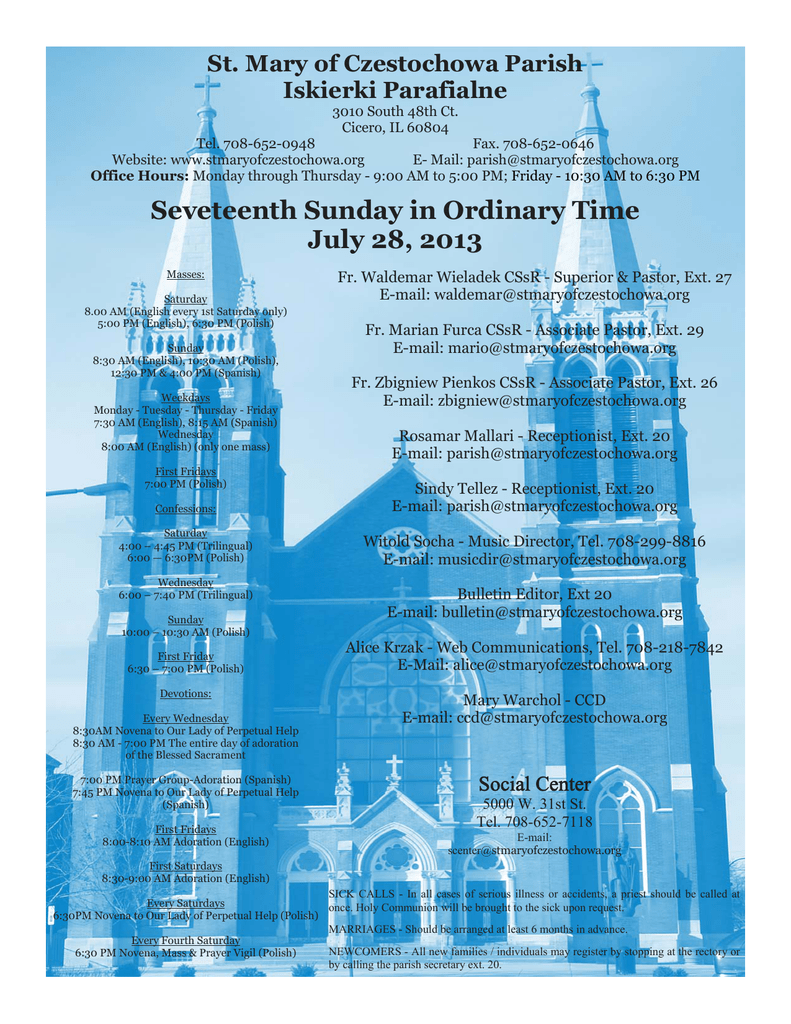 St. Mary of Czestochowa Parish Iskierki Parafialne 3010 South 48th Ct. Cicero, IL 60804 Tel. 708-652-0948 Fax. 708-652-0646 Website: www.stmaryofczestochowa.org E- Mail: [email protected] Office Hours: Monday through Thursday - 9:00 AM to 5:00 PM; Friday - 10:30 AM to 6:30 PM Seveteenth Sunday in Ordinary Time July 28, 2013 Masses: Saturday 8.00 AM (English every 1st Saturday only) 5:00 PM (English), 6:30 PM (Polish) Sunday 8:30 AM (English), 10:30 AM (Polish), 12:30 PM & 4:00 PM (Spanish) Weekdays Monday - Tuesday - Thursday - Friday 7:30 AM (English), 8:15 AM (Spanish) Wednesday 8:00 AM (English) (only one mass) First Fridays 7:00 PM (Polish) Fr. Waldemar Wieladek CSsR - Superior & Pastor, Ext. 27 E-mail: [email protected] Fr. Marian Furca CSsR - Associate Pastor, Ext. 29 E-mail: [email protected] Fr. Zbigniew Pienkos CSsR - Associate Pastor, Ext. 26 E-mail: [email protected] Rosamar Mallari - Receptionist, Ext. 20 E-mail: [email protected] Confessions: Sindy Tellez - Receptionist, Ext. 20 E-mail: [email protected] Saturday 4:00 – 4:45 PM (Trilingual) 6:00 — 6:30PM (Polish) Witold Socha - Music Director, Tel. 708-299-8816 E-mail: [email protected] Wednesday 6:00 – 7:40 PM (Trilingual) Sunday 10:00 – 10:30 AM (Polish) First Friday 6:30 – 7:00 PM (Polish) Devotions: Every Wednesday 8:30AM Novena to Our Lady of Perpetual Help 8:30 AM - 7:00 PM The entire day of adoration of the Blessed Sacrament 7:00 PM Prayer Group-Adoration (Spanish) 7:45 PM Novena to Our Lady of Perpetual Help (Spanish) First Fridays 8:00-8:10 AM Adoration (English) Bulletin Editor, Ext 20 E-mail: [email protected] Alice Krzak - Web Communications, Tel. 708-218-7842 E-Mail: [email protected] Mary Warchol - CCD E-mail: [email protected] Social Center 5000 W. 31st St. Tel. 708-652-7118 E-mail: [email protected] First Saturdays 8:30-9:00 AM Adoration (English) SICK CALLS - In all cases of serious illness or accidents, a priest should be called at Every Saturdays once. Holy Communion will be brought to the sick upon request. 6:30PM Novena to Our Lady of Perpetual Help (Polish) MARRIAGES - Should be arranged at least 6 months in advance. Every Fourth Saturday NEWCOMERS - All new families / individuals may register by stopping at the rectory or 6:30 PM Novena, Mass & Prayer Vigil (Polish) by calling the parish secretary ext. 20. Sunday Iskierki Parafialne July 28, Seventeenth Sunday in Ordinary Time 8:30 For the health and blessings of Kerry †Mildred Lipinski †Frank Czarnecki (son) 10:30 O Boże bł. dla Charlie Ogrodny w pierwszą rocznicę urodzin O zdrowie dla Marcina O wyleczenie z nałogu alkoholowego i raka krtani Konrada Łukaszewicz O zdrowie dla Stanisława, Jana i Jozefa Osych Dziękczynna w 9-ą rocz. ślubu Agnieszki I Zenona oraz o Boże bł. Dla całej rodziny Dziękczynna z prośbą o dalsze potrzebne łaski dla Jana I Anny Tylka w 30-ą rocz. ślubu †Janina Bakowski †Zofia i Władysław oraz Barbara i Mirosława Osych †Aniela i Ludwik Tylka †Andrzej Gacek †Stanisława Wadach †Tadeusz Wadach (10-a rocz. śm., rodzina) 12:30 Presentación de 40 dias de Dominick Gabriel Szyszlak †Jose Juan Carlos Gamez (hijos y nietos) †Esther Chavez (familia Godinez-Rodriguez) 4:00 Por los Feligreses July 29, Monday, Saint Martha 7:30 †Zofia Surówka (córka Krystyna z rodziną) 8:15 W intacji Bogu wiadomej July 30, Tuesday, Saint Peter Chrysologus, Bishop and Doctor of the Church 7:30 †Holy Souls In the Book of Remembrance 8:15 †Jose Juan Carlos Gamez (hijos y nietos) August 03, First Saturday, Weekday in Ordinary Time 8:00 †Holy Souls in the Book of Remembrance 11:00 Wedding: Leszek Kułach & Dominika Fafrowicz 1:00 Quinceañera: Liliana Rocely DeLeon 3:00 Wedding: Isauro Meza & Fidelia Gama 5:00 For the health and blessings of Kerry (mother) †Frank Czarnecki (wife) 6:30 W intencjach próśb i podziękowań do M. B. Nieustającej Pomocy W intencji Teresy Rzeszutko z Kanady Lector Schedule Saturday, August 03 5:00 Sharon Wente, John Stenson Sunday, August 04 8:30 Michelle Cison-Carlson, Leonard Witucki 10:30 Alicja Krzak, Kasia Kowalska 12:30 Beatriz Ibarra, Roberto Pasillas, Linda Ramirez 4:00 Rene Aviña, Mary Rodriguez, Enrique Garcia Eucharistic Minister Saturday, August 03 5:00 Jean Yunker, Frances Balla Sunday, August 04 8:30 Christine Zaragoza, Ed Hennessy Myra Rodriguez 10:30 Polish Eucharistic Ministers 12:30 Marisol Ortiz, Olivia Ortiz, Javier Hernandez, Juana Salas 4:00 Humberto Tellez, Maria Clara Ibarra Martha Tamayo We welcome in Baptism: Brianna Diaz Jesus Mancilla Jr. Omar Mendoza Lopez July 31, Wednesday, Saint Ignatius of Loyola, Priest 8:00 †Jacqueline Knapp (friend) 8:30 Eucharistic Adoration until 7PM 7:00 Circulo de Oración 7:45 Novena a Nuestra Señora del Perpetuo Socorro WEDDING BANNS There is a promise of marriage between August 01, Thursday, Saint Alphonsus Liguori, Bishop and Doctor of the Church 7:30 †Louis Valosek (family) 8:15 Por los Redentoristas lll. Dominika Fafrowicz & Leszek Kułach lll. Fidelia Gama & Isauro Meza ll. Jasmin Gonzalez & Juan Valdez l. Sabina K. Wrobel & Rafal Chajdys August 02, First Friday, Saint Eusebius of Vercelli, Bishop; Saint Peter Julian Eymard, Priest 7:30 †Holy Souls in the Book of Remembrance 8:15 W intencji Bogu wiadomej 7PM †Edward Ptak (córka z rodziną) Eternal Rest……………….. †Mildred Lipinski May God Who called you, take you home! St. Mary of Czestochowa Sunday Collection July 21, 2013 Jul. 20 5:00PM $478.00 Jul. 21 St. Christopher Blessings of the Cars July 28, 2013 After every Mass on July 27 and 28, 2013 in honor of St. Christopher a blessing for the cars will be taking place. If you wish for your vehicle to be bless you will need to stand next to your car in our Church’s parking lot after the Mass. There are 4 weeks before the Feast of Our lady of Czestochowa and Parish Raffle. Each ticket sells for just $5.00 and the cost of the entire raffle book is $100. Prizes: 1st Prize……….$ 2,000 