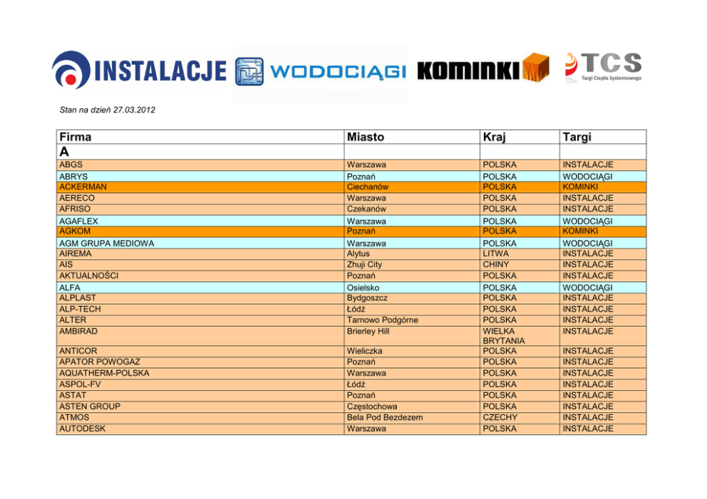Stan na dzień 27.03.2012 Firma Miasto Kraj Targi ABGS ABRYS ACKERMAN AERECO AFRISO AGAFLEX AGKOM AGM GRUPA MEDIOWA AIREMA AIS AKTUALNOŚCI ALFA ALPLAST ALP-TECH ALTER AMBIRAD Warszawa Poznań Ciechanów Warszawa Czekanów Warszawa Poznań Warszawa Alytus Zhuji City Poznań Osielsko Bydgoszcz Łódź Tarnowo Podgórne Brierley Hill INSTALACJE WODOCIĄGI KOMINKI INSTALACJE INSTALACJE WODOCIĄGI KOMINKI WODOCIĄGI INSTALACJE INSTALACJE INSTALACJE WODOCIĄGI INSTALACJE INSTALACJE INSTALACJE INSTALACJE ANTICOR APATOR POWOGAZ AQUATHERM-POLSKA ASPOL-FV ASTAT ASTEN GROUP ATMOS AUTODESK Wieliczka Poznań Warszawa Łódź Poznań Częstochowa Bela Pod Bezdezem Warszawa POLSKA POLSKA POLSKA POLSKA POLSKA POLSKA POLSKA POLSKA LITWA CHINY POLSKA POLSKA POLSKA POLSKA POLSKA WIELKA BRYTANIA POLSKA POLSKA POLSKA POLSKA POLSKA POLSKA CZECHY POLSKA A INSTALACJE INSTALACJE INSTALACJE INSTALACJE INSTALACJE INSTALACJE INSTALACJE INSTALACJE AVT-KORPORACJA AZ POKORNY Warszawa Tulesice POLSKA CZECHY INSTALACJE INSTALACJE Pyrzyce Pszczółki Szamotuły Strumień Warszawa Białogard Rzeszów Warszawa Psary Borgosatollo Pieszyce DzierŜoniów DzierŜoniów Lisburn Płochocin Bydgoszcz Warszawa POLSKA POLSKA POLSKA POLSKA POLSKA POLSKA POLSKA POLSKA POLSKA WŁOCHY POLSKA POLSKA POLSKA IRLANDIA POLSKA POLSKA POLSKA INSTALACJE INSTALACJE INSTALACJE KOMINKI INSTALACJE INSTALACJE INSTALACJE INSTALACJE WODOCIĄGI INSTALACJE INSTALACJE INSTALACJE INSTALACJE INSTALACJE INSTALACJE INSTALACJE INSTALACJE Wien Warszawa Świebodzice Tarnów Kraków Świdnica Rybnik OŜarów Mazowiecki AUSTRIA POLSKA POLSKA POLSKA POLSKA POLSKA POLSKA POLSKA INSTALACJE INSTALACJE INSTALACJE TCS KOMINKI WODOCIĄGI INSTALACJE INSTALACJE B BACKER OBR BARBOR BART BEF HOME BELIMO SIŁOWNIKI BERLINERLUFT.TECHNIK BH-RES BISAN BMETERS POLSKA BONOMINI BOXMET BROEN BROEN BROOKVENT BRUGG BUD-MEDIA BWT C CAIS CALDORIS POLSKA CAPRICORN CARBONUS CEBUD CEDOS CENTRUM INSTALACJI CENTRUM KLIMA CGH POLSKA CHERBROS CHT CIAT CIEPŁO, ŚWIATŁO I STYL CIEPŁO-TECH CIEPŁOWNICTWO POLSKIE CIMBERIO CINI CLIMA GOLD CLIMA-BUD COOL COVLAND CWK Bydgoszcz Aegaleo Athens Płońsk Konstantynów Łódzki Lublin Wrocław Warszawa Warszawa Czeladź Reda Sosnowiec Chotomów Pruszków Łódź POLSKA GRECJA POLSKA POLSKA POLSKA POLSKA POLSKA POLSKA POLSKA POLSKA POLSKA POLSKA POLSKA POLSKA INSTALACJE INSTALACJE INSTALACJE INSTALACJE KOMINKI INSTALACJE TCS INSTALACJE INSTALACJE INSTALACJE INSTALACJE INSTALACJE INSTALACJE INSTALACJE Poznań Grodzisk Mazowiecki Poznań Pustków Osiedle POLSKA Strawczyn Warszawa Gdynia Tarnów Otrębusy Benatky Nad Jizerou Wrocław POLSKA POLSKA POLSKA POLSKA Wrocław POLSKA POLSKA POLSKA POLSKA POLSKA CZECHY POLSKA INSTALACJE INSTALACJE INSTALACJE KOMINKI INSTALACJE INSTALACJE INSTALACJE INSTALACJE KOMINKI INSTALACJE INSTALACJE INSTALACJE Poznań POLSKA INSTALACJE D DAGAT DANFOSS DANPO DARCO DE DIETRICH DEFRO DELABIE DESOTEC DORTECH II DREWART-ENERGY DRUZSTEVNI ZAVODY DRAZICE DZ RADA E EFAR EGAIN POLSKA EKO MASTER LAMENTA EKOENERGIA EKOKLIMAX-PROJEKT EKONAIR EKOTECH EKO-TECH-INWEST EKOVAL VALVE COMPANY ELEKTROMET ELZAS EMMETI ENBRA EPI 2 ESBE HYDRONIC SYSTEMS EURO-BALTIC-THERM EURO-MEDIA EUROS ENERGY EUROSTER EZINC METAL SAN. TIC. A.S. Józefów Buk Poraj Bydgoszcz Gorzów Wielkopolski Plewiska K/Poznania Unisław Ankara Głubczyce Osieczna Vigonovo di Fontanafredda (PN) Kraków Warszawa Poznań Starogard Gdański Warszawa Mościska Krobia Kayseri POLSKA POLSKA POLSKA POLSKA POLSKA POLSKA POLSKA TURCJA POLSKA POLSKA WŁOCHY POLSKA POLSKA POLSKA POLSKA POLSKA POLSKA POLSKA TURCJA INSTALACJE INSTALACJE INSTALACJE INSTALACJE INSTALACJE INSTALACJE INSTALACJE INSTALACJE INSTALACJE INSTALACJE INSTALACJE INSTALACJE INSTALACJE INSTALACJE INSTALACJE INSTALACJE INSTALACJE INSTALACJE INSTALACJE Białystok Rawicz Praha 9 Woelfersheim Pogwizdów Gdynia Gdynia Szczecin Warszawa POLSKA POLSKA CZECHY NIEMCY POLSKA POLSKA POLSKA POLSKA POLSKA INSTALACJE INSTALACJE INSTALACJE INSTALACJE INSTALACJE INSTALACJE INSTALACJE INSTALACJE INSTALACJE F FERROX FERRPOL FINTHERM PRAHA - KWH PIPE FIREDOS FLAMA-GAZ FLOWAIR FLOWAIR FLUID DESK FOLIMPEX PLUS FONDIS FRS GAZIMALAT FUSION POLSKA Trzebinia Ankara Michałowice POLSKA TURCJA POLSKA KOMINKI INSTALACJE WODOCIĄGI Głubczyce Warszawa Marki Kraków Poznań Poznań Dąbrowa Górnicza Chybie Ningbo Wolsztyn Kiev Olsztyn Korzybie Łódź Przeźmierowo Przeźmierowo Warszawa Fontenay POLSKA POLSKA POLSKA POLSKA POLSKA POLSKA POLSKA POLSKA CHINY POLSKA UKRAINA POLSKA POLSKA POLSKA POLSKA POLSKA POLSKA FRANCJA INSTALACJE INSTALACJE INSTALACJE INSTALACJE INSTALACJE KOMINKI INSTALACJE KOMINKI INSTALACJE INSTALACJE INSTALACJE INSTALACJE INSTALACJE WODOCIĄGI INSTALACJE INSTALACJE INSTALACJE INSTALACJE Rumburk Istanbul Gorzów Wlkp. Kraków Zborowskie Skarszewy CZECHY TURCJA POLSKA POLSKA POLSKA POLSKA KOMINKI INSTALACJE KOMINKI INSTALACJE INSTALACJE INSTALACJE G GALMET GAZEX GEBO GEOSYSTEM GLEN DIMPLEX GLEN DIMPLEX GLOBAL-TECH GODKOWIE GOLDEN SANITARYWARE GORGIEL GORINNYA GOSHE GRAS GRUNBECK GRUNDFOS POMPY GRUNDFOS POMPY GRUPA E-BUDOWNICTWO.PL GUILBERT EXPRESS H HAAS + SOHN HACI AYVAZ HAJDUK HEAT-POL HEF HEIZTECHNIK HEL-WITA HERZ HEWALEX HIRSCH POROZELL HONEYWELL HONEYWELL HOSSEVEN ISI VE YALITIM HOXTER HUMMEL HUSTY HYDRO-VACUUM Białe Błota Wieliczka Czechowice-Dziedzice Wrocław Warszawa Warszawa Bursa Brno Denzlingen Kraków Wąbrzeźno POLSKA POLSKA POLSKA POLSKA POLSKA POLSKA TURCJA CZECHY NIEMCY POLSKA POLSKA INSTALACJE INSTALACJE INSTALACJE INSTALACJE INSTALACJE INSTALACJE INSTALACJE KOMINKI INSTALACJE INSTALACJE KOMINKI Poznań Mosina Białystok Olkusz Radlin Kórnik Warszawa Warszawa Łódź Istanbul Piła Kraków Praha 6 Poznań POLSKA POLSKA POLSKA POLSKA POLSKA POLSKA POLSKA POLSKA POLSKA TURCJA POLSKA POLSKA CZECHY POLSKA INSTALACJE INSTALACJE INSTALACJE INSTALACJE INSTALACJE INSTALACJE INSTALACJE INSTALACJE INSTALACJE INSTALACJE INSTALACJE TCS INSTALACJE INSTALACJE Dębica Warszawa POLSKA POLSKA KOMINKI INSTALACJE I IBP IN