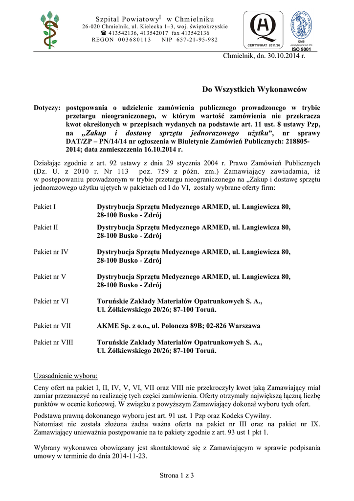 Szpital Powiatowy A w Chmielniku 26-020 Chmielnik, ul. Kielecka 1–3, woj. świętokrzyskie 413542136, 413542017 fax 413542136 R EG O N 0 0 3 6 8 0 1 1 3 N IP 6 5 7 -2 1 -9 5 -9 8 2 Chmielnik, dn. 30.10.2014 r. Do Wszystkich Wykonawców Dotyczy: postępowania o udzielenie zamówienia publicznego prowadzonego w trybie przetargu nieograniczonego, w którym wartość zamówienia nie przekracza kwot określonych w przepisach wydanych na podstawie art. 11 ust. 8 ustawy Pzp, na „Zakup i dostawę sprzętu jednorazowego użytku”, nr sprawy DAT/ZP – PN/14/14 nr ogłoszenia w Biuletynie Zamówień Publicznych: 2188052014; data zamieszczenia 16.10.2014 r. Działając zgodnie z art. 92 ustawy z dnia 29 stycznia 2004 r. Prawo Zamówień Publicznych (Dz. U. z 2010 r. Nr 113 poz. 759 z późn. zm.) Zamawiający zawiadamia, iż w postępowaniu prowadzonym w trybie przetargu nieograniczonego na „Zakup i dostawę sprzętu jednorazowego użytku ujętych w pakietach od I do VI, zostały wybrane oferty firm: Pakiet I Dystrybucja Sprzętu Medycznego ARMED, ul. Langiewicza 80, 28-100 Busko - Zdrój Pakiet II Dystrybucja Sprzętu Medycznego ARMED, ul. Langiewicza 80, 28-100 Busko - Zdrój Pakiet nr IV Dystrybucja Sprzętu Medycznego ARMED, ul. Langiewicza 80, 28-100 Busko - Zdrój Pakiet nr V Dystrybucja Sprzętu Medycznego ARMED, ul. Langiewicza 80, 28-100 Busko - Zdrój Pakiet nr VI Toruńskie Zakłady Materiałów Opatrunkowych S. A., Ul. Żółkiewskiego 20/26; 87-100 Toruń. Pakiet nr VII AKME Sp. z o.o., ul. Poloneza 89B; 02-826 Warszawa Pakiet nr VIII Toruńskie Zakłady Materiałów Opatrunkowych S. A., Ul. Żółkiewskiego 20/26; 87-100 Toruń. Uzasadnienie wyboru: Ceny ofert na pakiet I, II, IV, V, VI, VII oraz VIII nie przekroczyły kwot jaką Zamawiający miał zamiar przeznaczyć na realizację tych części zamówienia. Oferty otrzymały największą łączną liczbę punktów w ocenie końcowej. W związku z powyższym Zamawiający dokonał wyboru tych ofert. Podstawą prawną dokonanego wyboru jest art. 91 ust. 1 Pzp oraz Kodeks Cywilny. Natomiast nie została złożona żadna ważna oferta na pakiet nr III oraz na pakiet nr IX. Zamawiający unieważnia postępowanie na te pakiety zgodnie z art. 93 ust 1 pkt 1. Wybrany wykonawca obowiązany jest skontaktować się z Zamawiającym w sprawie podpisania umowy w terminie do dnia 2014-11-23. Strona 1 z 3 Jednocześnie, zgodnie z art. 92 ust. 1 ustawy Prawo Zamówień Publicznych Zamawiający informuję, iż wpłynęło 6 ofert z firm: Zamawiający podaje wyniki oceny ofert: Pakiet nr I Oferta nr 6 Nazwa wykonawcy: Dystrybucja Sprzętu Medycznego ARMED Adres Wykonawcy: ul. Langiewicza 80; 28-100 Busko-Zdrój Liczba pkt. w kryterium cena: 100,00 Pakiet II. Oferta nr 5 Nazwa wykonawcy: Górnośląska Centrala Zaopatrzenia Medycznego ZARYS Sp. z o.o Adres Wykonawcy: ul. Pod Borem 18; 41-808 Zabrze. Liczba pkt. w kryterium cena: 96,00 Oferta nr 6 Nazwa wykonawcy: Dystrybucja Sprzętu Medycznego ARMED Adres Wykonawcy: ul. Langiewicza 80; 28-100 Busko-Zdrój Liczba pkt. w kryterium cena: 100,00 Pakiet nr IV Oferta nr 6 Nazwa wykonawcy: Dystrybucja Sprzętu Medycznego ARMED Adres Wykonawcy: ul. Langiewicza 80; 28-100 Busko-Zdrój Liczba pkt. w kryterium cena: 100,00 Pakiet nr V Oferta nr 6 Nazwa wykonawcy: Dystrybucja Sprzętu Medycznego ARMED Adres Wykonawcy: ul. Langiewicza 80; 28-100 Busko-Zdrój Liczba pkt. w kryterium cena: 100,00 Pakiet VI Oferta nr 2 Nazwa wykonawcy: Toruńskie Zakłady Materiałów Opatrunkowych S.A. Adres Wykonawcy: ul. Żłókiewskiego 20/26; 87-100 Toruń Liczba pkt. w kryterium cena: 100,00 Oferta nr 4 Nazwa wykonawcy: Informer Med. Sp. z o.o. Adres Wykonawcy: ul. Winogrady 118; 61-626 Poznań Liczba pkt. w kryterium cena: 89,00 Pakiet nr VII Oferta nr 3 Nazwa wykonawcy: AKME Sp. z o.o., Adres Wykonawcy: ul. Poloneza 89B; 02-826 Warszawa Liczba pkt. w kryterium cena: 100,00 Strona 2 z 3 Pakiet VIII Oferta nr 2 Nazwa wykonawcy: Toruńskie Zakłady Materiałów Opatrunkowych S.A. Adres Wykonawcy: ul. Żłókiewskiego 20/26; 87-100 Toruń Liczba pkt. w kryterium cena: 100,00 Działając na podstawie art. 24 ust. 2 pkt. 4 Prawa zamówień publicznych Zamawiający informuje, że w prowadzonym postępowaniu zostali wykluczeni następujący wykonawcy: Oferta nr 1 Nazwa Wykonawcy: eMtiM Marek Mazurkiewicz. Adres: ul. A. Struga 85/5; 41-800 Zabrze. Zgodnie z art. 24 ust 4 Zamawiający informuje, że ofertę Wykonawcy wykluczonego uznaje się za wykluczoną. Strona 3 z 3