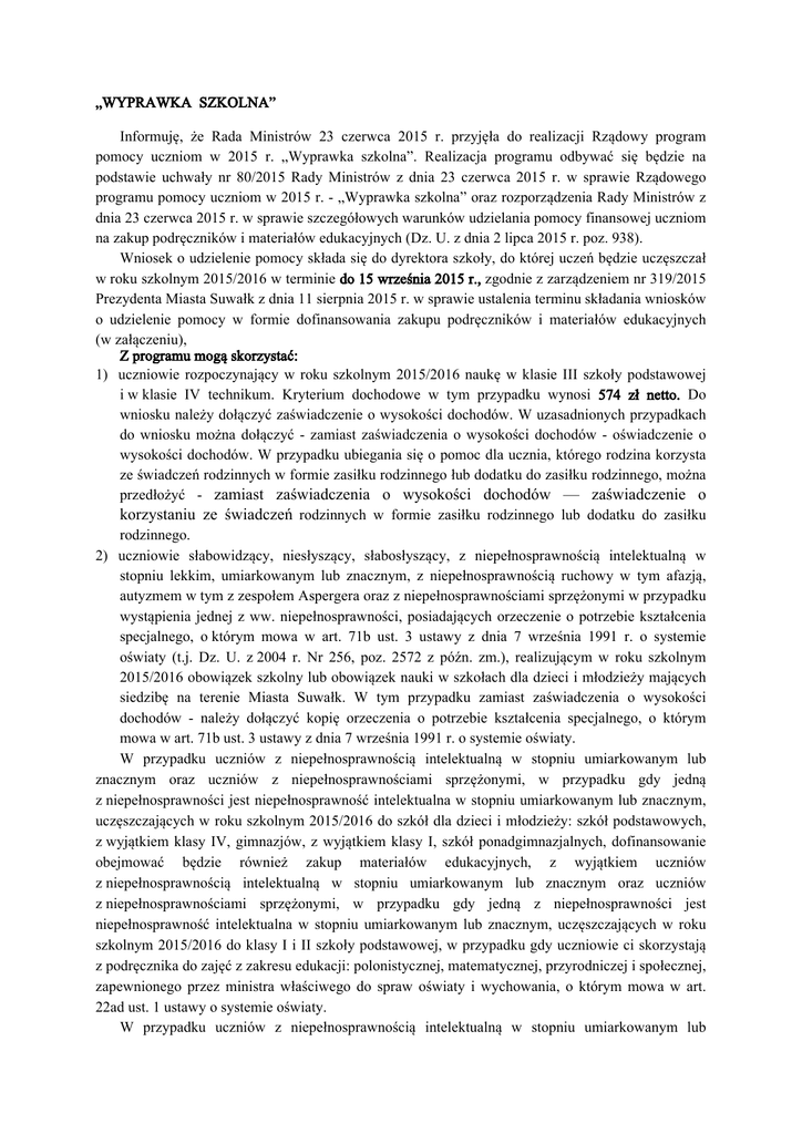 „WYPRAWKA SZKOLNA” Informuję, że Rada Ministrów 23 czerwca 2015 r. przyjęła do realizacji Rządowy program pomocy uczniom w 2015 r. „Wyprawka szkolna”. Realizacja programu odbywać się będzie na podstawie uchwały nr 80/2015 Rady Ministrów z dnia 23 czerwca 2015 r. w sprawie Rządowego programu pomocy uczniom w 2015 r. „Wyprawka szkolna” oraz rozporządzenia Rady Ministrów z dnia 23 czerwca 2015 r. w sprawie szczegółowych warunków udzielania pomocy finansowej uczniom na zakup podręczników i materiałów edukacyjnych (Dz. U. z dnia 2 lipca 2015 r. poz. 938). Wniosek o udzielenie pomocy składa się do dyrektora szkoły, do której uczeń będzie uczęszczał w roku szkolnym 2015/2016 w terminie do 15 września 2015 r., zgodnie z zarządzeniem nr 319/2015 Prezydenta Miasta Suwałk z dnia 11 sierpnia 2015 r. w sprawie ustalenia terminu składania wniosków o udzielenie pomocy w formie dofinansowania zakupu podręczników i materiałów edukacyjnych (w załączeniu), Z programu mogą skorzystać: 1) uczniowie rozpoczynający w roku szkolnym 2015/2016 naukę w klasie III szkoły podstawowej i w klasie IV technikum. Kryterium dochodowe w tym przypadku wynosi 574 zł netto. Do wniosku należy dołączyć zaświadczenie o wysokości dochodów. W uzasadnionych przypadkach do wniosku można dołączyć zamiast zaświadczenia o wysokości dochodów oświadczenie o wysokości dochodów. W przypadku ubiegania się o pomoc dla ucznia, którego rodzina korzysta ze świadczeń rodzinnych w formie zasiłku rodzinnego łub dodatku do zasiłku rodzinnego, można przedłożyć zamiast zaświadczenia o wysokości dochodów — zaświadczenie o korzystaniu ze świadczeń rodzinnych w formie zasiłku rodzinnego lub dodatku do zasiłku rodzinnego. 2) uczniowie słabowidzący, niesłyszący, słabosłyszący, z niepełnosprawnością intelektualną w stopniu lekkim, umiarkowanym lub znacznym, z niepełnosprawnością ruchowy w tym afazją, autyzmem w tym z zespołem Aspergera oraz z niepełnosprawnościami sprzężonymi w przypadku wystąpienia jednej z ww. niepełnosprawności, posiadających orzeczenie o potrzebie kształcenia specjalnego, o którym mowa w art. 71b ust. 3 ustawy z dnia 7 września 1991 r. o systemie oświaty (t.j. Dz. U. z 2004 r. Nr 256, poz. 2572 z późn. zm.), realizującym w roku szkolnym 2015/2016 obowiązek szkolny lub obowiązek nauki w szkołach dla dzieci i młodzieży mających siedzibę na terenie Miasta Suwałk. W tym przypadku zamiast zaświadczenia o wysokości dochodów należy dołączyć kopię orzeczenia o potrzebie kształcenia specjalnego, o którym mowa w art. 71b ust. 3 ustawy z dnia 7 września 1991 r. o systemie oświaty. W przypadku uczniów z niepełnosprawnością intelektualną w stopniu umiarkowanym lub znacznym oraz uczniów z niepełnosprawnościami sprzężonymi, w przypadku gdy jedną z niepełnosprawności jest niepełnosprawność intelektualna w stopniu umiarkowanym lub znacznym, uczęszczających w roku szkolnym 2015/2016 do szkół dla dzieci i młodzieży: szkół podstawowych, z wyjątkiem klasy IV, gimnazjów, z wyjątkiem klasy I, szkół ponadgimnazjalnych, dofinansowanie obejmować będzie również zakup materiałów edukacyjnych, z wyjątkiem uczniów z niepełnosprawnością intelektualną w stopniu umiarkowanym lub znacznym oraz uczniów z niepełnosprawnościami sprzężonymi, w przypadku gdy jedną z niepełnosprawności jest niepełnosprawność intelektualna w stopniu umiarkowanym lub znacznym, uczęszczających w roku szkolnym 2015/2016 do klasy I i II szkoły podstawowej, w przypadku gdy uczniowie ci skorzystają z podręcznika do zajęć z zakresu edukacji: polonistycznej, matematycznej, przyrodniczej i społecznej, zapewnionego przez ministra właściwego do spraw oświaty i wychowania, o którym mowa w art. 22ad ust. 1 ustawy o systemie oświaty. W przypadku uczniów z niepełnosprawnością intelektualną w stopniu umiarkowanym lub znacznym oraz uczniów z niepełnosprawnościami sprzężonymi, w przypadku gdy jedną z niepełnosprawności jest niepełnosprawność intelektualna w stopniu umiarkowanym lub znacznym, uczęszczających w roku szkolnym 2015/2016 do szkół dla dzieci i młodzieży: szkół podstawowych, z wyjątkiem klasy IV, gimnazjów, z wyjątkiem klasy I, lub szkół ponadgimnazjalnych dofinansowanie obejmuje również zakup materiałów edukacyjnych o których mowa w art. 3 pkt 24 ustawy z dnia 7 września 1991 r. o systemie oświaty. Nie stosuje się tego przepisu do uczniów z niepełnosprawnością intelektualną w stopniu umiarkowanym lub znacznym oraz uczniów z niepełnosprawnościami sprzężonymi, w przypadku gdy jedną z niepełnosprawności jest niepełnosprawność intelektualna w stopniu umiarkowanym lub znacznym, uczęszczających w roku szkolnym 2015/2016 do klasy I i II szkoły podstawowej, w przypadku gdy uczniowie ci korzystają z podręcznika do zajęć z zakresu edukacji: polonistycznej, matematycznej, przyrodniczej i społecznej, zapewnionego przez ministra właściwego do spraw oświaty i wychowania. 3) W przypadkach określonych w art. 7 ustawy z dnia 12 marca 2004 r. o pomocy społecznej (Dz. U. z 2013 r. poz. 182, ze zm.) pomoc może być udzielona uczniom uczęszczającym w roku szkolnym 2015/2016 do klas III szkoły podstawowej i w klas IV technikum, w których dochód na osobę w rodzinie przekracza kryterium dochodowe. W tym przypadku zamiast zaświadczenia o wysokości dochodów należy dołączyć uzasadnienie. Dyrektor szkoły zwraca rodzicom uczniów (prawnym opiekunom, rodzicom zastępczym, osobom prowadzącym rodzinny dom dziecka) albo pełnoletnim uczniom koszt zakupu podręczników do kształcenia ogólnego, w tym podręczników do kształcenia specjalnego, lub podręczników do kształcenia w zawodach, a w przypadku uczniów z upośledzeniem umysłowym w stopniu umiarkowanym lub znacznym oraz uczniów z niepełnosprawnościami sprzężonymi, w przypadku gd