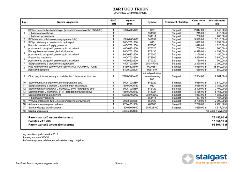 BAR FOOD TRUCK WYCENA WYPOSAŻENIA Ilość [szt] Wymiar [mm] Stół ze zlewem dwukomorowym (jedna komora umywalka 330x300) + bateria umywalkowa + bateria z prysznicem Stół chłodniczy 3-drzwiowy (agregat na dole) Stół przyścienny z drzwiami skrzydłowymi Kuchnia nastawna 2 płyty grzewcze podstawa do urządzeń grzewczych z drzwiami Płyta grillowa nastawna gładka/ryflowana podstawa do urządzeń grzewczych z drzwiami Frytownica nastawna podstawa do urządzeń grzewczych z drzwiami Stół przyścienny z drzwiami skrzydłowymi Piec konwekcyjno-parowy ChefTop 5xGN 2/3 COMPACT ONE podstawa pod piec 1 1 1 1 1 1 1 1 1 1 1 1 1 1 1200x700x880 9 Okap przyścienny skośny z oswietleniem i łapaczami tłuszczu 1 2700x800x450 10 11 12 13 14 Stół chłodniczy 2-drzwiowy 240 l (agregat na dole) Stół przyścienny z blokiem 2 szuflad drzwi skrzydłowe Stół chłodniczy sałatkowy 2-drzwiowy, 240 l (agregat na dole) Stół mroźniczy 2-drzwiowy, 314 l (agregat z prawej strony) Szafa porządkowa ze zlewem + bateria z prysznicem Witryna chłodnicza 120 l, z elektronicznym sterownikiem Automatyczny ekspres do kawy Szafka wisząca drzwi suwane Szafka ubraniowa 1 1 1 1 1 1 1 1 3 2 900x700x880 1500x700x880 900x700x880 1360x700x860 500x500x2000 L.p. 1 2 3 4 5 6 7 8 15 16 17 18 Nazwa urządzenia 1365x700x880 800x700x880 400x700x250 400x620x600 800x700x250 800x620x600 400x700x250 400x620x600 450x700x850 535x662x649 540x600x625 702x568x686 275x465x360 1600x300x600 400x500x1800 Razem wartość wyposażenia netto Podatek VAT 23% Razem wartość wyposażenia brutto Wartość netto [zł] Producent / katalog .089 651100 651111 842039 .015 970500 970320 973130 970340 972500 970320 980147045 9000561 9051110 na indywidualne zamówienie wg 208 842029 .032 842129 841027 981465050 651111 852120 486900 981723160 Stalgast Stalgast Stalgast Stalgast Stalgast Stalgast Stalgast Stalgast Stalgast Stalgast Stalgast Stalgast Stalgast Stalgast 2 847,00 zł 215,00 zł 788,00 zł 3 599,00 zł 1 692,00 zł 1 620,00 zł 760,00 zł 4 599,00 zł 1 150,00 zł 3 850,00 zł 760,00 zł 2 390,00 zł 18 650,00 zł 650,00 zł 2 847,00 zł 215,00 zł 788,00 zł 5 510,00 zł 1 692,00 zł 1 620,00 zł 760,00 zł 4 599,00 zł 1 150,00 zł 3 850,00 zł 760,00 zł 2 390,00 zł 18 650,00 zł 650,00 zł Stalgast 2 964,00 zł 2 964,00 zł Stalgast Stalgast Stalgast Stalgast Stalgast Stalgast Stalgast Stalgast Stalgast 3 630,00 zł 3 630,00 zł 3 088,00 zł 3 088,00 zł 2 499,00 zł 2 499,00 zł 5 165,00 zł 5 165,00 zł 1 983,00 zł 1 983,00 zł 437,00 zł 437,00 zł 2 999,00 zł 2 799,00 zł 2 290,00 zł 2 290,00 zł 4 917,00 zł 1 639,00 zł nie ujęte w wycenie 75 453,00 zł 17 354,19 zł 92 807,19 zł wg cennika z października 2016 r. katalog wydanie XXXVI końcowa wycena zależna jest od ostatecznego projektu Bar Food Truck - wycena wyposażenia Cena netto [zł] Symbol Strona 1 z 1