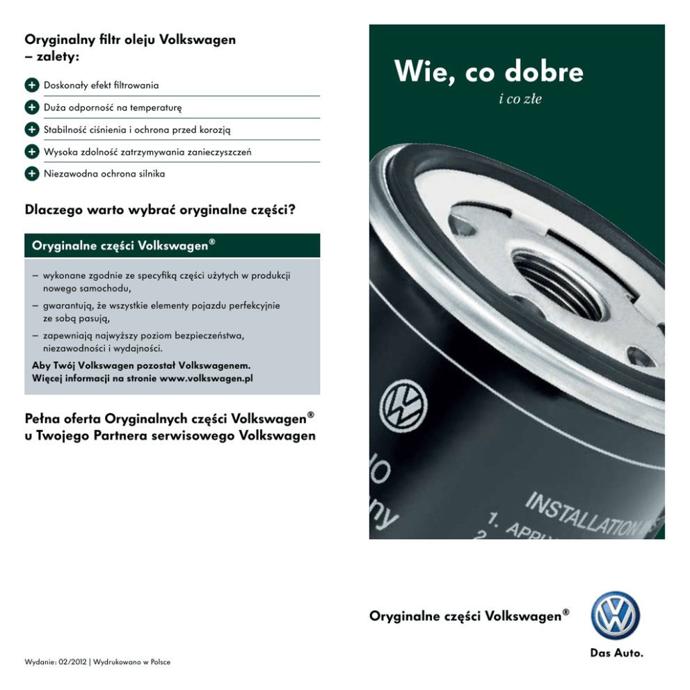 Oryginalny filtr oleju Volkswagen – zalety: + Doskonały efekt filtrowania + Duża odporność na temperaturę Wie, co dobre i co złe + Stabilność ciśnienia i ochrona przed korozją + Wysoka zdolność zatrzymywania zanieczyszczeń + Niezawodna ochrona silnika Dlaczego warto wybrać oryginalne części? Oryginalne części Volkswagen® −− wykonane zgodnie ze specyfiką części użytych w produkcji nowego samochodu, −− gwarantują, że wszystkie elementy pojazdu perfekcyjnie ze sobą pasują, −− zapewniają najwyższy poziom bezpieczeństwa, niezawodności i wydajności. Aby Twój Volkswagen pozostał Volkswagenem. Więcej informacji na stronie www.volkswagen.pl Pełna oferta Oryginalnych części Volkswagen® u Twojego Partnera serwisowego Volkswagen Oryginalne części Volkswagen® Wydanie: 02/2012 | Wydrukowano w Polsce Czy wiesz, że… Oryginalny filtr oleju Volkswagen... →→ Filtr oleju usuwa pozostałości procesu spalania, sadzę …… niezawodnie odfiltrowuje wszystkie zanieczyszczenia i cząstki metalu z obiegu oleju silnika. Zanieczyszczony olej z obiegu oleju i gwarantuje przepływ oleju w każdych może przyczyniać się do zmniejszenia mocy silnika warunkach eksploatacyjnych, przyczyniając się w ten sposób i zwiększenia zużycia paliwa, a nawet do awarii silnika. do minimalnego zużycia silnika. →→ Nawet najmniejsze zanieczyszczenia w oleju tworzą coś …… dzięki swojej stabilnej konstrukcji jest wytrzymały także w rodzaju szlamu, który może spowodować uszkodzenie przy dużej lepkości oleju, czyli np. przy rozruchu na zimno powierzchni elementów silnika. Zanieczyszczony olej może lub w niskich temperaturach. również spowodować uszkodzenie łożysk. →→ Ze względu na to, że olej krąży w silniku w sposób ciągły, w wyniku słabej filtracji mogą powstawać grudki. Wtedy też zużycie silnika jest szybsze. →→ Gdy filtr jest już zapchany, szybko wzrasta w nim ciśnienie i może on „eksplodować”. →→ Najbardziej popularna konstrukcja filtru oleju przypomina puszkę, która w razie potrzeby jest wymieniana w całości. Niektóre silniki posiadają jednak wbudowane obudowy filtra. W tym wypadku wymienione zostają tylko niektóre części. →→ Filtr oleju powinien być wymieniany razem z olejem. W innym przypadku świeży olej może zbierać już nagromadzone zanieczyszczenia. …… dzięki odpornej na ciśnienie i zabezpieczonej przed korozją obudowie wytrzymuje ciśnienie do 20 bar. …… nie pozwala na przeciekanie. Zbudowany jest z wysokiej jakości materiałów uszczelniających i doskonale pasuje do złącza. …… jego jednostka filtracyjna doskonale pasuje do nowoczesnych wysoko wydajnych silników. …… gwarantuje wysoką zdolność do zatrzymywania zanieczyszczeń pomimo bardzo niskiego oporu przepływu. …… charakteryzuje się wysoką odpornością na temperaturę i na szkodliwe komponenty oleju. …… zapewnia wysoką wydajność i trwałość silnika. To sprawia, że jego zakup jest zdecydowanie opłacalny.