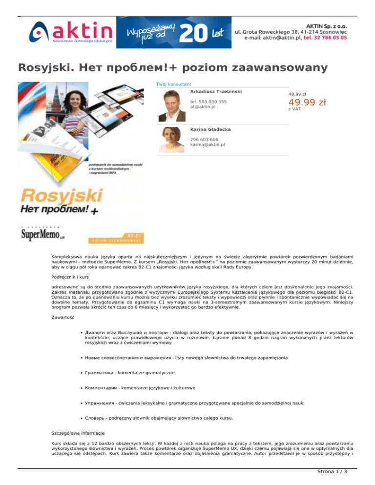 Rosyjski. Нет проблем!+ poziom zaawansowany Twój konsultant Arkadiusz Trzebiński tel. 503 030 555 [email protected] NOWOŚĆ W OFERCIE 49.99 zł 49.99 zł z VAT Karina Gładecka 796 603 606 [email protected] Kompleksowa nauka języka oparta na najskuteczniejszym i jedynym na świecie algorytmie powtórek potwierdzonym badaniami naukowymi – metodzie SuperMemo. Z kursem „Rosyjski. Нет проблем!+” na poziomie zaawansowanym wystarczy 20 minut dziennie, aby w ciągu pół roku opanować zakres B2-C1 znajomości języka według skali Rady Europy. Podręcznik i kurs adresowane są do średnio zaawansowanych użytkowników języka rosyjskiego, dla których celem jest doskonalenie jego znajomości. Zakres materiału przygotowano zgodnie z wytycznymi Europejskiego Systemu Kształcenia Językowego dla poziomu biegłości B2-C1. Oznacza to, że po opanowaniu kursu można bez wysiłku zrozumieć teksty i wypowiedzi oraz płynnie i spontanicznie wypowiadać się na dowolne tematy. Przygotowanie do egzaminu C1 wymaga nauki na 3-semestralnym zaawansowanym kursie językowym. Niniejszy program pozwala skrócić ten czas do 6 miesięcy i wykorzystać go bardzo efektywnie. Zawartość Диалоги oraz Выслушай и повтори - dialogi oraz teksty do powtarzania, pokazujące znaczenie wyrazów i wyrażeń w kontekście, uczące prawidłowego użycia w rozmowie. Łącznie ponad 8 godzin nagrań wykonanych przez lektorów rosyjskich wraz z ćwiczeniami wymowy Новые словосочетания и выражения - listy nowego słownictwa do trwałego zapamiętania Грамматика - komentarze gramatyczne Комментарии - komentarze językowe i kulturowe Упражнения - ćwiczenia leksykalne i gramatyczne przygotowane specjalnie do samodzielnej nauki Словарь - podręczny słownik obejmujący słownictwo całego kursu. Szczegółowe informacje Kurs składa się z 12 bardzo obszernych lekcji. W każdej z nich nauka polega na pracy z tekstem, jego zrozumieniu oraz powtarzaniu wykorzystanego słownictwa i wyrażeń. Proces powtórek organizuje SuperMemo UX, dzięki czemu pojawiają się one w optymalnych dla uczącego się odstępach. Kurs zawiera także komentarze oraz objaśnienia gramatyczne. Autor przedstawił je w sposób przystępny i Strona 1 / 3 zrozumiały oraz uzupełnił o serię zadań utrwalających zdobytą wiedzę i pomagających opanować gramatykę szybko i naturalnie. na przedstawiony materiał gramatyczny składają się między innymi: użycie słowa ,,procent'' w połączeniu z liczebnikami, wyrażenia ułamkowe, konstrukcje czynne i bierne, imiesłów czynny czasu przeszłego, imiesłowy przysłówkowe, imiesłów przymiotnikowy bierny czasu teraźniejszego, tryb rozkazujący wybranych czasowników. wśród zagadnień leksykalnych znajdują się: oferty pracy i życiorys, przedstawienie stylu neutralnego i potocznego, podstawowe słownictwo dotyczące ekonomii, policji, wymiaru sprawiedliwości i polityki, moda, zakupy, czas wolny i hobby, prasa, telewizja, elementy kultury i historii rosyjskiej. ponad 1 000 słów i wyrażeń przeznaczonych do nauki, ponad 2 000 ćwiczeń gramatycznych i leksykalnych w formie przygotowanej specjalnie dla kursów językowych, czytanki i dialogi w języku rosyjskim, na końcu książki oraz w programie multimedialnym zamieszczony został podręczny słowniczek, złożony z wyrazów i zwrotów użytych w kursie, zintegrowany z programem, zaawansowany analizator wymowy, pozwalający użytkownikom w domowym zaciszu doskonalić wymowę, a przez to ośmielić do mówienia w języku obcym, tematykę kursu oraz zagadnienia gramatyczne przygotowano na podstawie wytycznych Europejskiego Systemu Kształcenia Językowego. Materiał tego kursu skutecznie przygotowuje do egzaminu telc na poziomie C1. Wymagania techniczne: procesor 400 MHz, 256 MB RAM, CD-ROM, karta dźwiękowa, mikrofon, Windows XP, Windows Vista lub Windows 7 Internet Explorer 7 lub nowszy Strona 2 / 3 Strona 3 / 3 Powered by TCPDF (www.tcpdf.org)