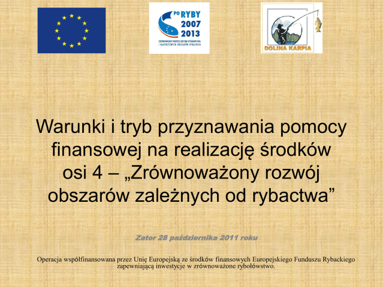 Warunki i tryb przyznawania pomocy finansowej na realizację środków osi 4 – „Zrównoważony rozwój obszarów zależnych od rybactwa” Zator 28 października 2011 roku Operacja współfinansowana przez Unię Europejską ze środków finansowych Europejskiego Funduszu Rybackiego zapewniającą inwestycje w zrównoważone rybołówstwo. Środki Osi 4: 1. Rozwój obszarów zależnych od rybactwa Rodzaje operacji: - Wzmocnienie konkurencyjności i utrzymanie atrakcyjności obszarów zależnych od rybactwa; - Restrukturyzacja i reorientacja działalności gospodarczej oraz dywersyfikacja zatrudnienia osób mających pracę związaną z sektorem rybactwa, w drodze tworzenia dodatkowych miejsc pracy poza tym sektorem; - Podnoszenie wartości produktów rybactwa, rozwoju usług na rzecz społeczności zamieszkującej obszary zależne od rybactwa Środki Osi 4: - - Ochrona środowiska i dziedzictwa przyrodniczego na obszarach zależnych od rybactwa w celu utrzymania jego atrakcyjności oraz przywracanie potencjału produkcyjnego sektora rybactwa, w przypadku jego zniszczenia w wyniku klęski żywiołowej Funkcjonowanie lokalnej grupy rybackiej oraz nabywanie umiejętności i aktywizacji lokalnych społeczności Środki Osi 4: 2. Wsparcie na rzecz współpracy międzyregionalnej i międzynarodowej Rodzaje operacji: Promowanie współpracy międzyregionalnej lub międzynarodowej między LGR Zasady przyznawania pomocy Pomoc jest przyznawana na realizację operacji: - Zgodną z LSROR (ocena Komitetu); - Wybraną przez Lokalną Grupę Rybacką (§ 1, pkt 1, lit a-d) - Realizowaną na obszarze gmin objętych LSROR – wyjątek promowanie współpracy; - Która spełnia inne warunki określone w rozporządzeniu Wzmocnienie konkurencyjności i utrzymanie atrakcyjności obszarów zależnych od rybactwa Zakres pomocy: 1. Adaptacja i wyposażenie miejsc, w których będą świadczone usługi dostępu do sieci Internet; 2. Poprawa funkcjonowania transportu publicznego przez budowę, przebudowę, remont lub odbudowę obiektów małej architektury, służących wykonywaniu działalności związanej z tym transportem, np. przystanki, ogrodzenie, śmietniki; 3. Rewitalizacja miejscowości przez realizację zintegrowanego projektu polegającego na remoncie chodników, parkingów, placów, ścieżek rowerowych, terenów zielonych, parków, budynków i obiektów publ. pełniących funkcje społeczno-kulturalne, sportowe, rekreacyjne lub ich wyposażenie Wzmocnienie konkurencyjności i utrzymanie atrakcyjności obszarów zależnych od rybactwa 4. remont, odbudowa lub przebudowa obiektów wpisanych do rejestru zabytków lub objętych wojewódzką ewidencją zabytków – brak wyposażenia; 5. organizowanie kół zainteresowań dla dzieci i młodzieży; 6. budowa, remont, przebudowa małej infrastruktury turystycznej – przystanie, kąpieliska, punkty widokowe, miejsca wypoczynkowe i biwakowe, trasy turystyczne, łowiska dla wędkarzy, punkty informacji turystycznej wraz ze ścieżkami i drogami dojazdowymi do miejsc objętych inwestycją – brak wyposażenia Wzmocnienie konkurencyjności i utrzymanie atrakcyjności obszarów zależnych od rybactwa 7. Dostosowanie obiektów turystycznych i rekreacyjno-sportowych do potrzeb osób niepełnosprawnych; 8. Tworzenie muzeów, izb regionalnych, izb pamięci lub skansenów; 9. Promocja obszaru objętego LSROR Wzmocnienie konkurencyjności i utrzymanie atrakcyjności obszarów zależnych od rybactwa Wysokość pomocy: Max 85 % kosztów kwalifikowalnych Max 2 000 000 zł na jednego beneficjenta w okresie realizacji Programu; Max 1 000 000 zł na jedną operację Restrukturyzacja i reorientacja działalności gospodarczej oraz dywersyfikacja zatrudnienia osób mających pracę związaną z sektorem rybactwa, w drodze tworzenia dodatkowych miejsc pracy poza tym sektorem Zakres pomocy: 1. budowa, przebudowa lub rozbiórka obiektów, w których ma być lub jest prowadzona działalność gospodarcza; 2. Zagospodarowanie terenu, na którym ma być lub jest prowadzona działalność gospodarcza; 3. Wyposażenie obiektów w których ma być lub jest prowadzona działalność gospodarcza w zakresie niezbędnym do jej prowadzenia; 4. Remont i adaptacja statku rybackiego do prowadzenia działalności gospodarczej; 5. Udział w kursach, szkoleniach, studiach, stażach…. mających na celu zmianę kwalifikacji zawodowych – tylko udział a nie organizowanie Restrukturyzacja i reorientacja działalności gospodarczej oraz dywersyfikacja zatrudnienia osób mających pracę związaną z sektorem rybactwa, w drodze tworzenia dodatkowych miejsc pracy poza tym sektorem Pomoc jest przyznawana wnioskodawcy jeżeli: I. prowadzi działalność na obszarze gmin objętych LSROR (lub zamierza prowadzić): 1) Jako uprawniony do rybactwa; 2) Jako podmiot, któremu wydano zezwolenie na prowadzenie chowu lub hodowli ryb w polskich obszarach morskich; 3) W zakresie: przetwórstwa, obrotu produktami rybołówstwa lub akwakultury lub unieszkodliwiania odpadów wytwarzanych lub powstałych w sektorze rybactwa lub związanym z obsługą sektora rybactwa, w szczególności produkcje, konserwację lub naprawę sprzętu służącego do prowadzenia działalności połowowej Restrukturyzacja i reorientacja działalności gospodarczej oraz dywersyfikacja zatrudnienia osób mających pracę związaną z sektorem rybactwa, w drodze tworzenia dodatkowych miejsc pracy poza tym sektorem II. Jest armatorem statku rybackiego III. Uzyskał pomoc z tytułu trwałego wycofania statku rybackiego w ramach SPO IV. Będąc osobą fizyczną utracił miejsce pracy w wyniku trwałego zaprzestania działalności połowowej Wysokość pomocy: Max 60 % kosztów kwalifikowalnych Max 600 000 zł na jednego beneficjenta w okresie realizacji Programu; Max 300 000 zł na jedną operację Podnoszenie wartości produktów rybactwa, rozwoju usług na rzecz społeczności zamieszkującej obszary zależne od rybactwa Zakres pomocy: 1. 