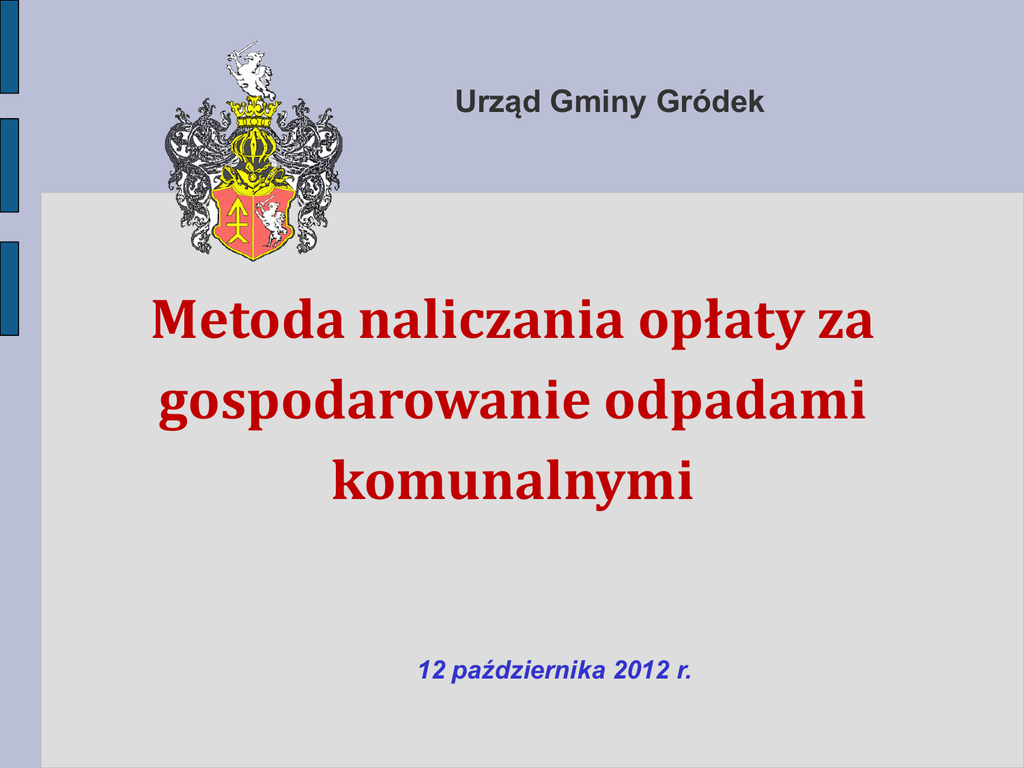 Urząd Gminy Gródek Metoda naliczania opłaty za gospodarowanie odpadami komunalnymi 12 października 2012 r. Ustawa z dnia 13 września 1996 r. o utrzymaniu czystości i porządku w gminach (Dz. U. z 2012 r. poz. 391) Ustawa z dnia 1 lipca 2011 r. o zmianie ustawy o utrzymaniu czystości i porządku w gminach oraz o zmianie niektórych innych ustaw (Dz. U. z 2011 r. Nr 152, poz. 897) Główne tezy zmian Gmina obejmuje wszystkich właścicieli nieruchomości na swoim terenie systemem gospodarowania odpadami komunalnymi, w tym jest obowiązana do zorganizowania odbierania odpadów od właścicieli nieruchomości, na której zamieszkują mieszkańcy. Główne tezy zmian Właściciele zamieszkiwanych nieruchomości nie będą podpisywać indywidualnych umów na odbieranie odpadów komunalnych z podmiotami prowadzącymi działalność w tym zakresie - obowiązek zorganizowania odbierania odpadów z tych nieruchomości przechodzi na gminę. Główne tezy zmian Wprowadzenie opłaty za gospodarowanie odpadami komunalnymi. Rada gminy będzie określała stawki opłaty za gospodarowanie odpadami komunalnymi, termin, częstotliwość i sposób uiszczania, także szczegółowy sposób świadczenia usług na rzecz właścicieli nieruchomości w zakresie odbierania i zagospodarowania odpadów komunalnych. Główne tezy zmian Opłata za gospodarowanie odpadami komunalnymi, jest przeznaczona na pokrycie przez gminę kosztów funkcjonowania systemu gospodarowania odpadami komunalnymi, z uwzględnieniem kosztów odbierania, transportu, zbierania, odzysku i unieszkodliwiania odpadów komunalnych; tworzenia i utrzymania punktów selektywnego zbierania odpadów komunalnych; obsługi administracyjnej tego systemu. OPŁATA ZA GOSPODAROWANIE ODPADAMI KOMUNALNYMI Opłata za gospodarowanie odpadami komunalnymi Obowiązek ponoszenia opłaty za gospodarowanie odpadami komunalnymi na rzecz gminy ciąży na właścicielach nieruchomości, na których: zamieszkują mieszkańcy; nie zamieszkują mieszkańcy - jeżeli rada gminy postanowiła, w drodze uchwały stanowiącej akt prawa miejscowego, o odbieraniu od nich odpadów komunalnych Opłata za gospodarowanie odpadami komunalnymi Obowiązek ponoszenia opłaty za gospodarowanie odpadami komunalnymi powstaje: 1) w przypadku zamieszkiwanych nieruchomości – za każdy miesiąc, w którym na danej nieruchomości zamieszkuje mieszkaniec; 2) w przypadku nieruchomości , na których jest prowadzona działalność – za każdy miesiąc, w którym na danej nieruchomości powstały odpady komunalne. Podstawa naliczania opłaty dla mieszkańców : liczba mieszkańców zamieszkujących daną nieruchomość, albo ilość zużytej wody z danej nieruchomości, albo powierzchnia lokalu mieszkalnego X stawka opłaty uchwalona przez radę gminy Możliwość uchwalenia jednej stawki opłaty (tzw. ryczałt) za gospodarowanie odpadami komunalnymi od gospodarstwa domowego Wybór podstawy naliczania opłaty należy do rady gminy. RG może wybrać tylko jedną metodę naliczania opłaty od mieszkańców Nie można łączyć metod! Dane stanowiące podstawę naliczania opłat będą wynikać ze złożonych przez właścicieli nieruchomości deklaracji o wysokości opłaty za gospodarowanie odpadami komunalnymi Analiza możliwych metod naliczania opłat za gospodarowanie odpadami komunalnymi Metoda od mieszkańca – Definicja Brak definicji mieszkańca w ustawie o utrzymaniu czystości i porządku w gminach zamieszkały – „mieszkający gdzieś stale, osiadły gdzieś” miejsce zamieszkania – miejscowość, w której osoba przybywa z zamiarem stałego pobytu – art. 25 Kodeksu cywilnego pobyt stały – zamieszkanie w określonej miejscowości pod oznaczonym adresem z zamiarem stałego przebywania – ustawa o ewidencji ludności Zameldowany ≠ Zamieszkały Metoda od mieszkańca – Zalety metoda zapewnia rzeczywiste wyliczenie opłaty, zgodność z zasadą „zanieczyszczający płaci”; najwyższa akceptowalność społeczna – opłata dotyczy każdego mieszkańca w równym stopniu; niezależna od uwarunkowań lokalnych, poziomu zwodociągowania, możliwa do wprowadzenia w każdej gminie; statystycznie przekłada się na ilość wytwarzanych odpadów do 1/01/2014r. możemy bazować na rejestrach mieszkańców – ewidencja meldunkowa (baza PESEL) Metoda od mieszkańca – Wady nieszczelność systemu – ilość mieszkańców możliwa do określenia wyłącznie na podstawie deklaracji o wysokości opłaty, trudność w ustaleniu liczby osób przebywającej w danej nieruchomości (np. wynajmujący stancje, nie zameldowani) i jej weryfikacja, konieczność weryfikacji dodatkowych dokumentów potwierdzających prawdziwość informacji zawartych w deklaracji, czasochłonność na etapie analizowania deklaracji zmienna liczba mieszkańców zamieszkujących daną nieruchomość (migracje, urodzenia, zgony, małżeństwa) – konsekwencją ponowne deklaracje korygujące, zaniżona liczba osób (bez meldunków, wynajmujących stancje) spowoduje zawyżenie stawki opłaty, rezygnacja z obowiązku meldunkowego (2014 r.) – możliwe będzie tylko przybliżone określenie liczby mieszkańców, ustawa nie precyzuje definicji mieszkańca zamieszkującego daną nieruchomość oraz definicji zamieszkanie, brak efektywnych instrumentów prawnych do weryfikacji danych zawartych w deklaracjach pozwalających gminie na sprawdzenie jakie jest miejsce zamieszkania danej osoby bądź ilu mieszkańców zamieszkuje daną nieruchomość, dodatkowe ewidencje i kontrole celem weryfikacji deklaracji (wzrost zatrudnionych pracowników) - wyższe niż przy innych metodach koszty funkcjonowania systemu nie odzwierciedla wielkości konsumpcji – ilości wytwarzanych odpadów, niesprawiedliwa w przypadku dużych gospodarstw domowych np. rodzin wielodzietnych Metoda od powierzchni lokalu mieszkalnego – Definicja Brak definicji powierzchni lokalu mieszkalnego w ustawie o utrzymaniu czystości i porządku w g