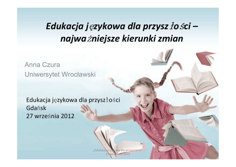 Edukacja językowa dla przyszłości – najważniejsze kierunki zmian Anna Czura Uniwersytet Wrocławski Edukacja językowa dla przyszłości Gdańsk 27 września 2012 „Edukacja językowa dla przyszłości” 27 września 2012 Przyszł Przyszłość? ść? WCZORAJ – DZIŚ DZIŚ – JUTRO „Edukacja językowa dla przyszłości” 27 września 2012 WCZORAJ Dwudziestolecie międzywojenne - kursy 7-letnie - 8 godzin języka w tygodniu!!! - metoda bezpośrednia - nacisk na komunikację „Edukacja językowa dla przyszłości” 27 września 2012 WCZORAJ Okres po II wojnie światowej – – – – „Wyzysk … robotników angielskich w pierwszej połowie XIX wieku.” „Awans społeczny robotnika” „Wypowiedzi Marksa i Engelsa o ruchu robotniczym w Anglii”. „Robotnicy na wczasach” – „Kobiety na ważnych stanowiskach w społeczeństwie” (Prejbisz 1969 w Komorowska 2007) Metoda gramatyczno-tłumaczeniowa Metoda audiolingwalna Powolne otwieranie się na zagranicę Nowe materiały dydaktyczne „Edukacja językowa dla przyszłości” 27 września 2012 WCZORAJ Po roku 1989 - Wprowadzenie języków obcych - Otwarcie granic - Potrzeba znajomości języków zachodnioeuropejskich - Moda na język angielski - Nowe podstawy programowe, programy nauczania, pomoce dydaktyczne…. - Reforma edukacji 1999 „Edukacja językowa dla przyszłości” 27 września 2012 WCZORAJ – DZIŚ DZIŚ – JUTRO 2001 / 2003 „Edukacja językowa dla przyszłości” 27 września 2012 Dlaczego ESOKJ? • • • • • • • • • • • • Przedstawia nowy model kompetencji komunikacyjnej Definiuje poziomy kompetencji komunikacyjnej Ujednolica nauczanie, uczenie się i ocenianie w Europie Ujednolica terminologię związaną z nauczaniem językowym Wprowadza wspólne przesłanki dotyczące tworzenia nowych podstaw programowych, programów nauczania i podręczników Promuje nowe tendencje w nauczaniu językowym (kompetencje uczenia się, trening strategiczny) Podkreśla znaczenie komunikacji (‘action-oriented’ approach) Definiuje elementy nauczania (sytuacje, sprawności) które powinny być rozwijane w klasie Podkreśla znaczenie refleksji w nauczaniu języka Indywidualizacja nauczania Nauka języka jako proces trwający całe życie NIE NARZUCA IDEALNYCH ROZWIĄZAŃ „Edukacja językowa dla przyszłości” 27 września 2012 DZIŚ DZIŚ I JUTRO Metoda - według której metody uczymy? Europa - europejska polityka językowa ESOKJ, ELP, mobilność … „Edukacja językowa dla przyszłości” 27 września 2012 XX i XXI wiek XX wiek: Rozwój wielu metod i podejść do nauczania języków obcych. XXI wiek: ? „Edukacja językowa dla przyszłości” 27 września 2012 Podejście komunikacyjne? Dąż ążenie do kompetencji zbliż żonej do natywnej. ąż J1+2 Cel: komunikacja z rodzimymi uż żytkownikami Komunikacja w ję ęzyku obcym Kultura krajów docelowych kompetencja interkulturowa Unikanie ję ęzyka ojczystego na zaję ęciach Rozsą ądne (!) uż życie J1 moż że pomóc Funkcje i sytuacje ję ęzykowe są ą podstawą ą nauczania Wszystkie aspekty ję ęzyka i sprawnoś ści ję ęzykowe Pł łynność ść ję ęzykowa jest najważ żniejsza! Pł łynność ść i poprawność ść są ą waż żne „Edukacja językowa dla przyszłości” 27 września 2012 Więc co zostało? - Rola komunikacji Materiały autentyczne Funkcje i sytuacje Typy ćwiczeń Interakcja …. WSZYSTKO Z UMIAREM! „Edukacja językowa dla przyszłości” 27 września 2012 Co mamy w zamian? • • • • Podejście zadaniowe (Task-based learning) Dogma Nauczanie wspomagane komputerowo (CALL) Zintegrowane kształcenie przedmiotowojęzykowe (CLIL) • Eklektyzm / era postmetodyczna „Edukacja językowa dla przyszłości” 27 września 2012 Co mamy w zamian? Podejście zadaniowe (Task-based learning) - Nauczanie przez działanie - Odwrócenie PPP „Edukacja językowa dla przyszłości” 27 września 2012 Co mamy w zamian? Dogma Scott Thornbury DOGME 95 „Edukacja językowa dla przyszłości” 27 września 2012 Co mamy w zamian? • Zintegrowane kształcenie przedmiotowojęzykowe (CLIL) „Edukacja językowa dla przyszłości” 27 września 2012 Co mamy w zamian? • Nauczanie wspomagane komputerowo (CALL) cyfrowi imigranci cyfrowi tubylcy „Edukacja językowa dla przyszłości” 27 września 2012 ERA POSTMETODYCZNA 1. 2. 3. 4. Autonomia ucznia Trening strategiczny Indywidualizacja procesu nauczania Aktywowanie ucznia (umiejętność wyciągania wniosków, personalizacja) 5. Promowanie współdziałania 6. Podejście interkulturowe „Edukacja językowa dla przyszłości” 27 września 2012 ERA POSTMETODYCZNA 1. Autonomia ucznia 2. Trening strategiczny 3. Promowanie współdziałania Nauka samodzielności: Planowanie swojej nauki Korzystanie z różnych materiałów Dobór odpowiednich ćwiczeń i technik uczenia się Wyznaczanie celów nauki Umiejętność samooceny własnej pracy Zmiana stosunku ucznia do nauczyciela Umiejętność współpracy z innymi „Edukacja językowa dla przyszłości” 27 września 2012 ERA POSTMETODYCZNA Indywidualizacja procesu nauczania Aktywowanie ucznia (umiejętność wyciągania wniosków, personalizacja) „Edukacja językowa dla przyszłości” 27 września 2012 KOMPETENCJA INTERKULTUROWA „Edukacja językowa dla przyszłości” 27 września 2012 EUROPA UNIA EUROPEJSKA (EUROPEAN UNION) RADA EUROPY (COUNCIL OF EUROPE) „Oda do radości” „Edukacja językowa dla przyszłości” 27 września 2012 Unia Europejska czy Rada Europy? 1. Która organizacja jest związkiem polityczno-gospodarczym? UE 2. Która organizacja ma więcej języków oficjalnych? UE (23); RE (2) 3. Która organizacja jest większa pod względem liczby państw członkowskich? RE (47); UE (27) „Edukacja językowa dla przyszłości” 27 września 2012 Unia Europejska i Rada Europy Promowanie różnorodności językowej (poprzez nauczanie języków obcych, języków regionalnych, j