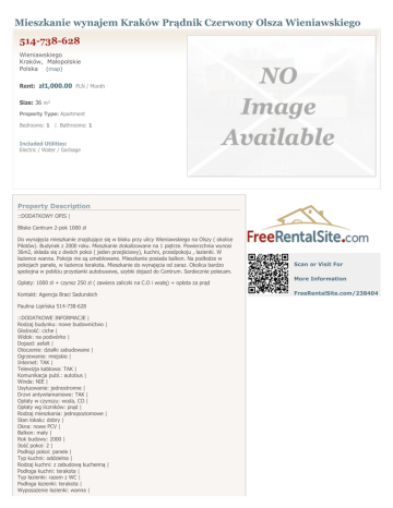 Mieszkanie wynajem Kraków Prądnik Czerwony Olsza Wieniawskiego 514-738-628 Wieniawskiego Kraków, Małopolskie Polska (map) Rent: zł1,000.00 PLN / Month Size: 36 m² Property Type: Apartment Bedrooms: 1 | Bathrooms: 1 Included Utilities: Electric / Water / Garbage Property Description ::DODATKOWY OPIS | Blisko Centrum 2-pok 1000 zł Do wynajęcia mieszkanie znajdujące się w bloku przy ulicy Wieniawskiego na Olszy ( okolice Pilotów). Budynek z 2000 roku. Mieszkanie zlokalizowane na 1 piętrze. Powierzchnia wynosi 36m2, składa się z dwóch pokoi ( jeden przejściowy), kuchni, przedpokoju , łazienki. W łazience wanna. Pokoje nie są umeblowane. Mieszkanie posiada balkon. Na podłodze w pokojach panele, w łazience terakota. Mieszkanie do wynajęcia od zaraz. Okolica bardzo spokojna w pobliżu przystanki autobusowe, szybki dojazd do Centrum. Serdecznie polecam. Opłaty: 1000 zł + czynsz 250 zł ( zawiera zaliczki na C.O i wodę) + opłata za prąd Kontakt: Agencja Braci Sadurskich Paulina Lipińska 514-738-628 ::DODATKOWE INFORMACJE | Rodzaj budynku: nowe budownictwo | Głośność: ciche | Widok: na podwórko | Dojazd: asfalt | Otoczenie: działki zabudowane | Ogrzewanie: miejskie | Internet: TAK | Telewizja kablowa: TAK | Komunikacja publ.: autobus | Winda: NIE | Usytuowanie: jednostronne | Drzwi antywłamaniowe: TAK | Opłaty w czynszu: woda, CO | Opłaty wg liczników: prąd | Rodzaj mieszkania: jednopoziomowe | Stan lokalu: dobry | Okna: nowe PCV | Balkon: mały | Rok budowy: 2000 | Ilość pokoi: 2 | Podłogi pokoi: panele | Typ kuchni: oddzielna | Rodzaj kuchni: z zabudową kuchenną | Podłoga kuchni: terakota | Typ łazienki: razem z WC | Podłoga łazienki: terakota | Wyposażenie łazienki: wanna | Scan or Visit For More Information FreeRentalSite.com/238404 Kaucja zabezp. [zł]: 2500,00 | ::LINK DO STRONY | http://sadurscy.pl/oferta.aspx?id=32078 ::KONTAKT DO AGENTA | Paulina Lipińska | 514-738-628 | 514-738-628 | [email protected] ::DANE BIURA | Bracia Sadurscy Lubomirskiego | Lubomirskiego 39/1 | 31-509 Kraków | 12 429-11-00 | sadurscy.pl Pośrednik odpowiedzialny zawodowo za wykonanie umowy pośrednictwa: Radosław Kucharz (licencja nr: 11849) -------------------------::GRATIS | Nasza prowizja zawiera: koszt przedwstępnej notarialnej umowy sprzedaży nieruchomości z rynku wtórnego, projekt kuchni - przygotowany przez www.4funstudio.pl gratis, promocyjne ceny architekta wnętrz i łazienek! Security: break-prooven doors Year Built: 2000 Floors: 3