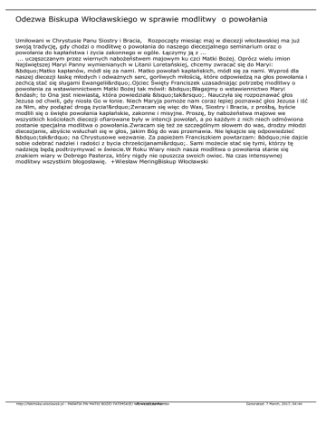 Odezwa Biskupa Włocławskiego w sprawie modlitwy o powołania Umiłowani w Chrystusie Panu Siostry i Bracia, Rozpoczęty miesiąc maj w diecezji włocławskiej ma już swoją tradycję, gdy chodzi o modlitwę o powołania do naszego diecezjalnego seminarium oraz o powołania do kapłaństwa i życia zakonnego w ogóle. Łączymy ją z ... ... uczęszczanym przez wiernych nabożeństwem majowym ku czci Matki Bożej. Oprócz wielu imion Najświętszej Maryi Panny wymienianych w Litanii Loretańskiej, chcemy zwracać się do Maryi: „Matko kapłanów, módl się za nami. Matko powołań kapłańskich, módl się za nami. Wyproś dla naszej diecezji łaskę młodych i odważnych serc, gorliwych miłością, które odpowiedzą na głos powołania i zechcą stać się sługami Ewangelii”.Ojciec Święty Franciszek uzasadniając potrzebę modlitwy o powołania za wstawiennictwem Matki Bożej tak mówił: „Błagajmy o wstawiennictwo Maryi – to Ona jest niewiastą, która powiedziała ‘tak’. Nauczyła się rozpoznawać głos Jezusa od chwili, gdy niosła Go w łonie. Niech Maryja pomoże nam coraz lepiej poznawać głos Jezusa i iść za Nim, aby podążać drogą życia!”Zwracam się więc do Was, Siostry i Bracia, z prośbą, byście modlili się o święte powołania kapłańskie, zakonne i misyjne. Proszę, by nabożeństwa majowe we wszystkich kościołach diecezji ofiarowane były w intencji powołań, a po każdym z nich niech odmówiona zostanie specjalna modlitwa o powołania.Zwracam się też ze szczególnym słowem do was, drodzy młodzi diecezjanie, abyście wsłuchali się w głos, jakim Bóg do was przemawia. Nie lękajcie się odpowiedzieć „tak” na Chrystusowe wezwanie. Za papieżem Franciszkiem powtarzam: „nie dajcie sobie odebrać nadziei i radości z bycia chrześcijanami”. Sami możecie stać się tymi, którzy tę nadzieję będą podtrzymywać w świecie.W Roku Wiary niech nasza modlitwa o powołania stanie się znakiem wiary w Dobrego Pasterza, który nigdy nie opuszcza swoich owiec. Na czas intensywnej modlitwy wszystkim błogosławię. +Wiesław MeringBiskup Włocławski http://fatimska.wloclawek.pl - PARAFIA PW MATKI BOŻEJ FATIMSKIEJ WE Powered WŁOCŁAWKU by Mambo Generated: 7 March, 2017, 04:44