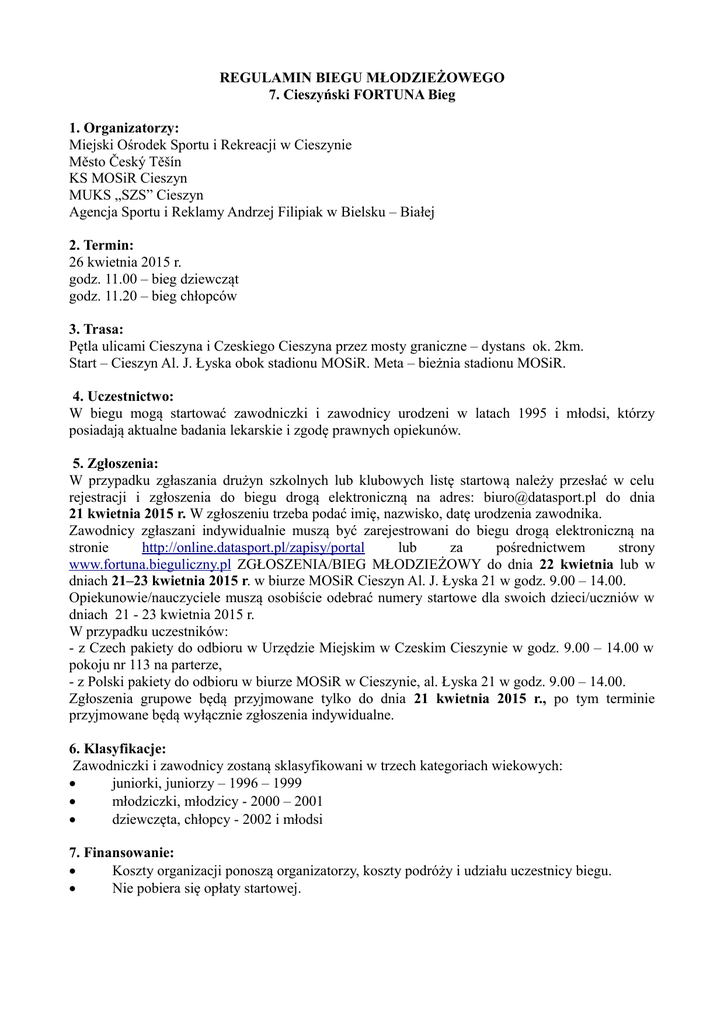 REGULAMIN BIEGU MŁODZIEŻOWEGO 7. Cieszyński FORTUNA