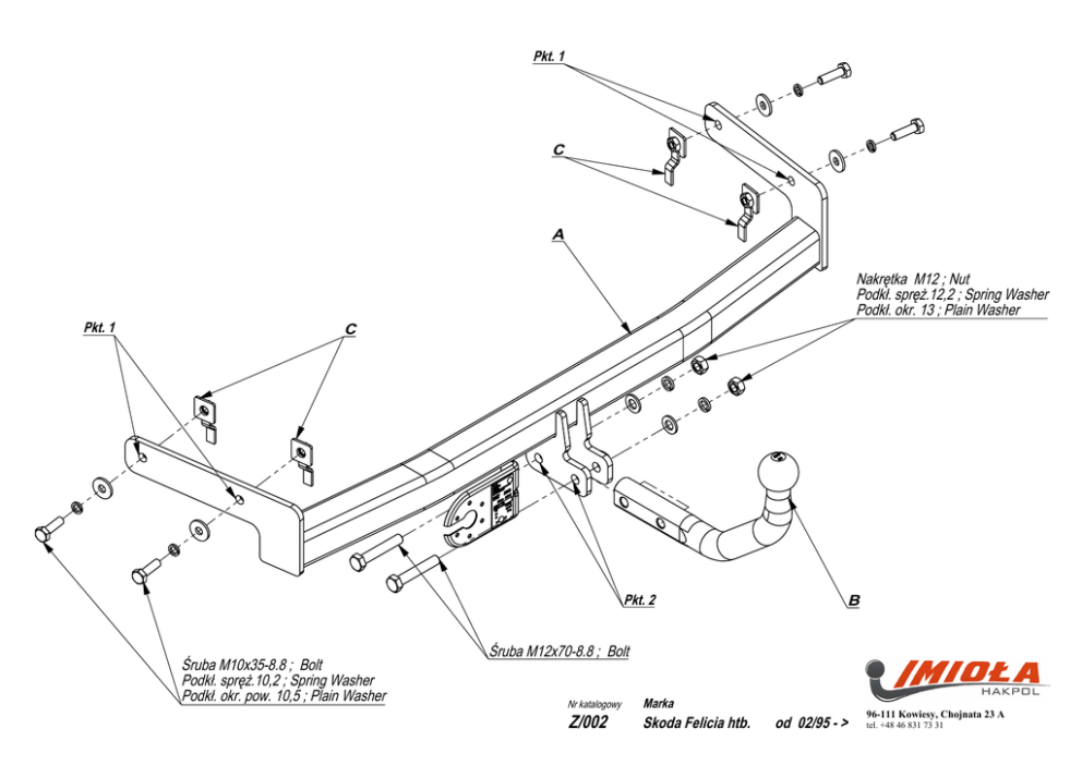Pkt. 1 C A Pkt. 1 Nakrętka M12 ; Nut Podkł. spręż.12,2 ; Spring Washer Podkł. okr. 13 ; Plain Washer C Pkt. 2 Śruba M10x35-8.8 ; Bolt Podkł. spręż.10,2 ; Spring Washer Podkł. okr. pow. 10,5 ; Plain Washer B Śruba M12x70-8.8 ; Bolt Nr katalogowy Z/002 Marka Skoda Felicia htb. od 02/95 - > 96-111 Kowiesy, Chojnata 23 A tel. +48 46 831 73 31 ZESTAW ŚRUBOWY: FASTENING MEANS: Gniazdo 7-biegunowe 12V z ruchomymi bolcami Symbol SWW 1135-812 Oznaczenie zacisku 31 L R 54 58L 58R + Zacisk do łączenia przewodów do masy pojazdu do świateł kierunku jazdy lewych do świateł kierunku jazdy prawych do świateł hamowania do świateł pozycyjnych lewych do świateł pozycyjnych prawych tylne światła przeciwmgłowe Moment skręcający dla śrub i nakrętek (8.8) Torgue settings for nuts and bolts (8.8) M8 25 Nm M12 M10 55 Nm M14 M16 195 Nm Kolory Biały , white śółty , yellow zielony, green czerwony, red czarny, black brązowy, brown niebieski , blue -M12x70 8.8 -M10x35 8.8 SKODA FELICJA htb. 02/95 – NO CAT.Z/002 -M12 INSTRUKCJA MONTAśU: FITTING INSTRUCTION: • • • • 2szt -M10 4szt -M12 2szt -M10 -M12 4szt 2szt 85 Nm 135 Nm • • 2szt 4szt PrzyłoŜyć zaczep do podłuŜnic tak, aby otwory zaczepu (pkt 1) pokryły się z technologicznymi otworami w podłuŜnicach. Od dołu podłuŜnic wsunąć płaskowniki z nakrętkami C i przykręcić zaczep śrubami M10x35 8.8. Dokręcić wszystkie śruby z momentem wg tabeli. Przykręcić kulę i blachę gniazda elektrycznego śrubami M12x70 8.8. Podłączyć instalację elektryczną. • • • • Put the tow bar to the metal clamps in this way, so the holes in the tow bar (point 1) agree with the technological holes in the metal clamps. Insert the plates with nuts C of the bottom of the metal clamps and screw the tow bar with bolts M10x35 8.8. Tighten all the bolts according to the torque setting- see the table. Fix the ball and electric plate with bolts M12x70 8.8. Connect the electric wires. WARUNKI EKSPLOATACJI. Zakład Produkcyjno Handlowo Usługowy 96-111 Kowiesy, Chojnata 23A tel. (0-46) 831 73 31, fax 831 74 29 www.hakpol.pl POLAND Zaczep posiada tabliczkę znamionową obowiązującą uŜytkownika w zakresie prawidłowego i bezpiecznego obciąŜenia. R = 1000 kg D= 5,90 kN ⇓ Zaczep kulowy do samochodu: S = 50 kg SKODA FELICJA htb. 02/95 - Nr katalogowy Z/002 KARTA GWARANCYJNA Warunki gwarancyjne i postępowanie reklamacyjne 1. 2. 3. 4. 5. Producent zobowiązuje się do wymiany wadliwego wyrobu w okresie 12 miesięcy od daty zakupu lub 24 miesięcy od daty produkcji, w terminie 14-dniowym. Wymianę wadliwego wyrobu dokonuje się w miejscu zakupu lub bezpośrednio u producenta. Nie podlega reklamacji gwarancyjnej zaczep kulowy, którego uszkodzenie nastąpiło: a) wskutek wypadku, b) wskutek nieprzestrzegania zasad prawidłowej obsługi, eksploatacji, konserwacji podanych w instrukcji. Karta gwarancyjna bez daty sprzedaŜy , pieczęci sklepu lub warsztatu montującego, nie moŜe słuŜyć jako podstawa do reklamacji. W skutek nie prawidłowego zamontowania zaczepu. W czasie całej eksploatacji naleŜy poszczególne elementy zaczepu utrzymywać w naleŜytym stanie technicznym (właściwie dokręcone elementy złączone, całość konstrukcji zabezpieczona przed działaniem korozji). Przyczepa musi być połączona z samochodem dodatkowym złączem o odpowiedniej wytrzymałości (łańcuch, linka z zapięciem). UWAGA Uszkodzenia mechaniczne zaczepu kulowego np. w wyniku najechania, zaczepienia przeszkodę, wykluczają dalszą eksploatację zaczepu. Uszkodzony zaczep kulowy nie moŜe być naprawiany. Sprawdzić śruby mocujące zaczep kulowy po około 1000 km przebiegu eksploatacji. Nacisk pionowy na kulę zaczepu nie moŜe przekroczyć 50 kg. Po zamontowaniu zaczepu kulowego naleŜy dokonać przeglądu na stacji diagnostycznej! data sprzedaŜy............................ nr rej poj .................................... Data produkcji........-.................. m-c rok. Przeznaczenie Zaczep kulowy zamontowany do samochodu przeznaczony jest do holowania przyczep towarowych i turystycznych. Warunki zamontowania Zaczep moŜe być zamontowany i eksploatowany w samochodzie, który posiada właściwy stan techniczny elementów podwozia, poprzez które następuje podłączenie zaczepu. Elementy te nie mogą być uszkodzone mechanicznie ani poprzez działanie korozji. ............................ pieczęć sprzedawcy. Hak jest produkowany zgodnie z wytycznymi regulaminu EKG/ONZ: Nr certyfikatu zgodności: 10/09 10/09