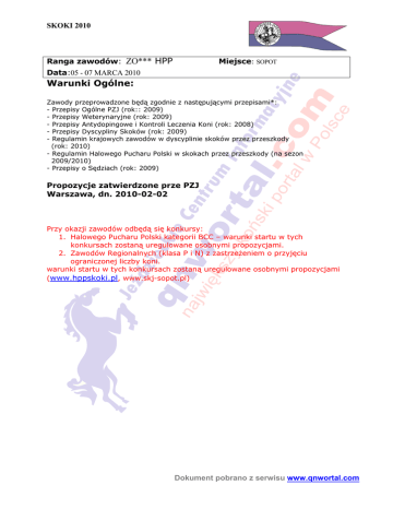 SKOKI 2010 Ranga zawodów: ZO*** HPP Miejsce: SOPOT Data:05 - 07 MARCA 2010 Warunki Ogólne: Zawody przeprowadzone będą zgodnie z następującymi przepisami*: - Przepisy Ogólne PZJ (rok:: 2009) - Przepisy Weterynaryjne (rok: 2009) - Przepisy Antydopingowe i Kontroli Leczenia Koni (rok: 2008) - Przepisy Dyscypliny Skoków (rok: 2009) - Regulamin krajowych zawodów w dyscyplinie skoków przez przeszkody (rok: 2010) - Regulamin Halowego Pucharu Polski w skokach przez przeszkody (na sezon 2009/2010) - Przepisy o Sędziach (rok: 2009) Propozycje zatwierdzone prze PZJ Warszawa, dn. 2010-02-02 Przy okazji zawodów odbędą się konkursy: 1. Halowego Pucharu Polski kategorii BCC – warunki startu w tych konkursach zostaną uregulowane osobnymi propozycjami. 2. Zawodów Regionalnych (klasa P i N) z zastrzeżeniem o przyjęciu ograniczonej liczby koni. warunki startu w tych konkursach zostaną uregulowane osobnymi propozycjami (www.hppskoki.pl, www.skj-sopot.pl) Dokument pobrano z serwisu www.qnwortal.com SKOKI 2010 I. INFORMACJE OGÓLNE 1.Zawody: 1.1Zawody Ogólnopolskie: Ranga zawodów: 1* 2* 3* ZO-B CSN ZO KiMK+J Zawody halowe: T N Kategoria: Seniorzy Młodzi Jeźdźcy Kuce i Małe Konie 1.2 Mistrzostwa Polski: Kategoria: Seniorzy Kuce T Młodzi Jeźdźcy 1.3 Puchar Polski: T N Halowy T N Kategoria: Młodzi Jeźdźcy Seniorzy Kuce i Małe Konie Kuce Juniorzy Juniorzy Młodsi N Juniorzy Juniorzy Młodsi Juniorzy Juniorzy Młodsi Data : 05-07 marca 2010 Miejsce: HIPODROM SOPOT Uczestnicy: JEŹDŹCY I KONIE ZAREJESTROWANI W PZJ 2.Organizator (kompletny adres) Nazwa: Adres: Kod pocztowy: Telefon: Email : Internet: SOPOCKI KLUB JEŹDZIECKI UL. POLNA 1 81-745 SOPOT + 48 58 551 66 82 Fax : fax. + 48 58 551 66 82 [email protected] WWW.SKJ-SOPOT.PL 3.Komitet Organizacyjny Przewodniczący: Dyrektor Zawodów: Biuro Zawodów: Rzecznik Prasowy: Dyrektor Techniczny: Szef Stajni: PIOTR PASZKOWSKI LECH KARDASIŃSKI MAŁGORZATA ODYNIEC JUSTYNA KOTOWSKA KRZYSZTOF RAFALAK BARBARA FILIPEK 4.Dane kontaktowe na miejscu zawodów: Adres: UL. POLNA 1 Dokument pobrano z serwisu www.qnwortal.com SKOKI 2010 Tel.: + 48 58 551 66 82 Telefon kom.: II. OSOBY OFICJALNE (zgodnie z Przepisami o Sędziach wyd. 5, art.14 p.3) 1. Komisja Sędziowska: Przewodniczący: Sędzia PZJ: Sędzia Stylu: Członkowie: DARIUSZ ORZOŁ WOJCIECH FRANKOWSKI AGATA JARZYCKA-STEFAŃSKA KRZYSZTOF PRZYJEMSKI 2.Delegat Techniczny: Asystent Delegata Technicznego 3.Gospodarz Toru: ARKADIUSZ WECKWERT Asystent Gospodarza Toru KRZYSZTOF RAFALAK 4.Komisarze: STANISŁAW ISKIERKO 5.Delegat weterynaryjny PZJ: 6.Lekarz weterynarii zawodów: GRZEGORZ CHAJĘCKI 7.Komisja Odwoławcza III WARUNKI TECHNICZNE Otwarcie stajni Zebranie techniczne/ sprawdzanie dokumentów/zapisy do konkursów Przegląd Weterynaryjny data 04.03.2010 godzina 10.00 04.03.2010 17:00 - 20:00 - - Plac konkursowy/hala: •podłoże: TROCINY •wymiary:70x35 Rozprężalnia: •podłoże: TROCINY •wymiary:15X20 IV. WARUNKI UCZESTNICTWA 1.Uczestnictwo Zgodnie z Art. 18 p. 1-5 i Art. 29 p.1-2 Przepisów Ogólnych PZJ oraz Art. 1 p. 2 Regulaminu Dyscypliny Skoków:2009 Dokument pobrano z serwisu www.qnwortal.com SKOKI 2010 2. Zgłoszenia: Termin zgłoszeń ostatecznych:26.02.2010 Zgłoszenia prosimy wysyłać na adres: Fax : + 48 58 51 66 82 Email: [email protected] Zgłoszenia wyłącznie na drukach PZJ 3. Warunki finansowe: Boksy o wymiarach 3x3m - opłata za boks:300 PLN Wpisowe:100 PLN Opłat za boksy należy dokonać na konto HIPODROM SOPOT UL. POLNA 1, 81-745 SOPOT Numer konta : Kredyt Bank S.A. 57 1500 1706 1217 0004 8355 0000 (BEZ ZWROTU ZA ZAMÓWIONE A NIEWYKORZYSTANE BOKSY) wraz ze zgłoszeniem ostatecznym. Potwierdzenie wpłaty należy przesłać faxem. Opłaty za wpisowe należy dokonać na konto bankowe SKJ SOPOT UL. POLNA 1, 81-745 SOPOT. BANK: PeKaO S.A. I O/Gdańsk KONTO: 77 1240 1242 1111 0000 1588 1395 Uwaga!!! Pary, za które nie zostaną uiszczone opłaty nie zostaną dopuszczone do startu. Kluby, których zawodnicy zostali zgłoszeni do startu i nie zgłosili rezygnacji w terminie zgłoszenia ostatecznego zostaną obciążone wszystkimi opłatami dotyczącymi ich zawodników. To samo dotyczy zgłoszonych zawodników niezrzeszonych, którzy niedopełnią tego obowiązku. Startowe:1% puli nagród Opłata za program badań antydopingowych 15 zł od konia Pasza i siano własne: T N / na koszt KO: T N Organizatorzy zapewniają pierwszą ściółkę (słoma). W przypadku konieczności pościelenia koniowi trocinami bezpyłowymi, prosimy o zaznaczenie tego w zgłoszeniu, organizator zapewnia możliwość zakupu trocin w cenie 50,00 zł za balot. Na miejscu istnieje możliwość zakupu siana: 10,00 zł kostka, oraz słomy 5,00 zł kostka. Podłączenie samochodu do prądu:150 PLN - NALEŻY ZAZNACZYĆ W ZGŁOSZENIU CHĘĆ KORZYSTANIA Z ELEKTRYCZNOŚCI. 5.Zakwaterowanie i wyżywienie: na koszt własny: T N na koszt KO: T N Hotele (adres, telefon, fax, adres mailowy, odległość od miejsca rozgrywania Zawodów, koszt zakwaterowania, itp.) Dokument pobrano z serwisu www.qnwortal.com SKOKI 2010 1. LALALA ARTHOTEL (hotel, pub, restauracja, wine-bar) dwójka BB: 240,00 pln - 600m od hipodromu ul. Rzemieślnicza 42, 81-855 Sopot +48 792 840 293 [email protected], www.lalala.lu 2. DWÓR PRAWDZICA dwójka BB: 200,00 pln - ok 1km od hipodromu ul. Piastowska 198, 80-341 Gdańsk 0048 58 553 50 15 [email protected], www.prawdzic.com.pl 3. HOTEL OLIWSKI jedynka BB: 260,00 pln dwójka BB: 260,00 pln - aok 1 km od hipodromu ul. Piastowska 1 80-332 Gdańsk 0048 58 761 66 10 [email protected], www.hoteloliwski.pl 4. HOTEL BURSZTYN jedynka BB: 140,00 pln dwójka BB: 210,00 pln studio 2+2 BB: 280,00 pln - ok 800m od hipodromu ul. Emilii Plater 12/19 81-777 Sopot 00 48 58 551 40 68 [email protected] 5. WILLA MAREA jedynka BB: 220,00 pln dwójka BB: 240,00 pln -ok 800m od hipodromu Dokument pobrano z serwisu www.qnwortal.com SKOKI 2010 ul. Parkowsa 40, 81-725 Sopot 0048 58 555 84 80 [email protected], w