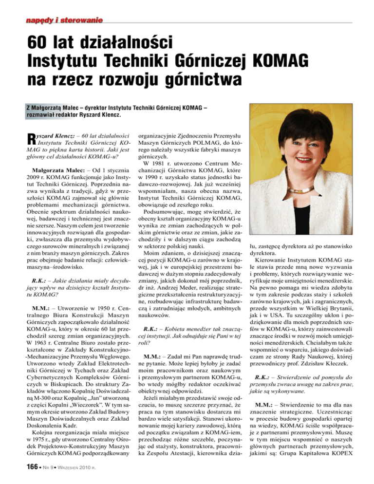 60 lat działalności Instytutu Techniki Górniczej KOMAG na rzecz rozwoju górnictwa Z Małgorzatą Malec – dyrektor Instytutu Techniki Górniczej KOMAG – rozmawiał redaktor Ryszard Klencz. R yszard Klencz: – 60 lat działalności Instytutu Techniki Górniczej KOMAG to piękna karta historii. Jaki jest główny cel działalności KOMAG-u? Małgorzata Malec: – Od 1 stycznia 2009 r. KOMAG funkcjonuje jako Instytut Techniki Górniczej. Poprzednia nazwa wynikała z tradycji, gdyż w przeszłości KOMAG zajmował się głównie problemami mechanizacji górnictwa. Obecnie spektrum działalności naukowej, badawczej i technicznej jest znacznie szersze. Naszym celem jest tworzenie innowacyjnych rozwiązań dla gospodarki, zwłaszcza dla przemysłu wydobywczego surowców mineralnych i związanej z nim branży maszyn górniczych. Zakres prac obejmuje badanie relacji: człowiek– maszyna–środowisko. R.K.: – Jakie działania miały decydujący wpływ na dzisiejszy kształt Instytutu KOMAG? M.M.: – Utworzenie w 1950 r. Centralnego Biura Konstrukcji Maszyn Górniczych zapoczątkowało działalność KOMAG-u, który w okresie 60 lat przechodził szereg zmian organizacyjnych. W 1963 r. Centralne Biuro zostało przekształcone w Zakłady Konstrukcyjno-Mechanizacyjne Przemysłu Węglowego. Utworzono wtedy Zakład Elektrotechniki Górniczej w Tychach oraz Zakład Cybernetycznych Kompleksów Górniczych w Biskupicach. Do struktury Zakładów włączono Kopalnię Doświadczalną M-300 oraz Kopalnię „Jan” utworzoną z części Kopalni „Wieczorek”. W tym samym okresie utworzono Zakład Budowy Maszyn Doświadczalnych oraz Zakład Doskonalenia Kadr. Kolejna reorganizacja miała miejsce w 1975 r., gdy utworzono Centralny Ośrodek Projektowo-Konstrukcyjny Maszyn Górniczych KOMAG podporządkowany 166 l Nr 9 l Wrzesień 2010 r. organizacyjnie Zjednoczeniu Przemysłu Maszyn Górniczych POLMAG, do którego należały wszystkie fabryki maszyn górniczych. W 1981 r. utworzono Centrum Mechanizacji Górnictwa KOMAG, które w 1990 r. uzyskało status jednostki badawczo-rozwojowej. Jak już wcześniej wspomniałam, nasza obecna nazwa, Instytut Techniki Górniczej KOMAG, obowiązuje od zeszłego roku. Podsumowując, mogę stwierdzić, że obecny kształt organizacyjny KOMAG-u wynika ze zmian zachodzących w polskim górnictwie oraz ze zmian, jakie zachodziły i w dalszym ciągu zachodzą w sektorze polskiej nauki. Moim zdaniem, o dzisiejszej znaczącej pozycji KOMAG-u zarówno w krajowej, jak i w europejskiej przestrzeni badawczej w dużym stopniu zadecydowały zmiany, jakich dokonał mój poprzednik, dr inż. Andrzej Meder, realizując strategiczne przekształcenia restrukturyzacyjne, rozbudowując infrastrukturę badawczą i zatrudniając młodych, ambitnych naukowców. R.K.: – Kobieta menedżer tak znaczącej instytucji. Jak odnajduje się Pani w tej roli? M.M.: – Zadał mi Pan naprawdę trudne pytanie. Może lepiej byłoby je zadać moim pracownikom oraz naukowym i przemysłowym partnerom KOMAG-u, bo wtedy mógłby redaktor oczekiwać obiektywnej odpowiedzi. Jeżeli miałabym przedstawić swoje odczucia, to muszę szczerze przyznać, że praca na tym stanowisku dostarcza mi bardzo wiele satysfakcji. Stanowi ukoronowanie mojej kariery zawodowej, którą od początku związałam z KOMAG-iem, przechodząc różne szczeble, poczynając od stażysty, konstruktora, pracownika Zespołu Atestacji, kierownika dzia- łu, zastępcę dyrektora aż po stanowisko dyrektora. Kierowanie Instytutem KOMAG stale stawia przede mną nowe wyzwania i problemy, których rozwiązywanie weryfikuje moje umiejętności menedżerskie. Na pewno pomaga mi wiedza zdobyta w tym zakresie podczas staży i szkoleń zarówno krajowych, jak i zagranicznych, przede wszystkim w Wielkiej Brytanii, jak i w USA. Tu szczególny ukłon i podziękowanie dla moich poprzednich szefów w KOMAG-u, którzy zainwestowali znaczące środki w rozwój moich umiejętności menedżerskich. Chciałabym także wspomnieć o wsparciu, jakiego doświadczam ze strony Rady Naukowej, której przewodniczy prof. Zdzisław Kłeczek. R.K.: – Stwierdzenie od pomysłu do przemysłu zwraca uwagę na zakres prac, jakie są wykonywane. M.M.: – Stwierdzenie to ma dla nas znaczenie strategiczne. Uczestnicząc w procesie budowy gospodarki opartej na wiedzy, KOMAG ściśle współpracuje z partnerami przemysłowymi. Muszę w tym miejscu wspomnieć o naszych głównych partnerach przemysłowych, jakimi są: Grupa Kapitałowa KOPEX SA, Kompania Węglowa SA, Katowicki Holding Węglowy SA, Jastrzębska Spółka Węglowa SA, Południowy Koncern Węglowy SA, kopalnie surowców mineralnych oraz liczna grupa małych i średnich przedsiębiorstw. Nasze prace naukowe, badawcze i techniczne dotyczą całego cyklu życia wyrobu. Opracowujemy koncepcję, realizujemy badania modelowe, projektujemy, uczestniczymy w procesie wdrażania wyrobu, unowocześniamy go podczas eksploatacji, aż wreszcie opracowujemy jego utylizację. Naszym partnerom przemysłowym oferujemy kompleksowe usługi po konkurencyjnych cenach. Każdego roku przeprowadzamy badania stopnia zadowolenia klientów, co zmusza nas do ciągłego doskonalenia działań na rzecz partnerów. Cieszy nas fakt, że sukcesy odnoszone w zakresie transferu technologii są dostrzegane przez grono ekspertów przyznające nam liczne nagrody i wyróżnienia. Mam tu na myśli złote medale przyznawane na Międzynarodowych Targach Poznańskich za transfer wyników badań naukowych do praktyki gospodarczej czy też wyróżnienia przyznawane przez Polską Agencję Rozwoju Przedsiębiorczości. R.K.: – Co gwarantuje wysoki poziom realizowanych projektów? M.M.: – Wysoki poziom naszych projektów gwarantuje zintegrowany system zarządzania, który umożliwił ujednolicenie procedur i uproszczenie procesów. Instytut Techniki Górniczej KOMAG posiada certyfikat systemu jakości w zakresie prac naukowych, prac badawczo-rozwojowych, 