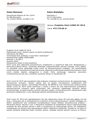 Salon Bemowo Salon Białołęka Powstańców Śląskich 87 lok. U10 B 01-466 Warszawa Tel. (22)427-89-95, (22)398-73-32 Kabrioletu 4 03-117 Warszawa Tel. (22)490-31-43, (22)243-36-05 Nazwa: Projektor Sim2 LUMIS HC 3D-D Cena: 475 270,00 zł Projektor Sim2 LUMIS HC 3D-D Podstawowe cechy: System oparty na dwóch projektorach Filtrowanie 3D Infitec Technologia DLP, podwójny 3-chip HD2+ DarkChip4™ Rozdzielczość 1080p (1920x1080) Kontrast > 35 000:1 Dynamic Black Dedykowany stojak na dwa projektory Sim2 Lumis jest najbardziej poszukiwanym projektorem w segmencie High End. Niespotykana u konkurencji jakość obrazu - dynamika, ekspresja, trójwymiarowość, jasność, kontrast, czerń i głębia. Te wszystkie cechy odróżniają model Lumis od konkurencyjnych urządzeń. Tak wyrafinowana konstrukcja jest niemożliwa do stworzenia przez większość producentów projektorów kinowych. Seria Lumis została właśnie wzbogacona o model, który zachowując najwyższe parametry charakterystyczne dla serii, umożliwia uzyskanie obrazu w standardzie 3D. Sim2 Lumis HC 3D-D jest prawdziwie high-endowym systemem przeznaczonym do najwyższej klasy pomieszczeń kinowych. System oparty jest na dwóch trzyczipowych projektorach DLP wykorzystujących optykę z technologią filtrowania 3D INFITEC® oraz mechaniczną selekcją filtrów 2D/3D. Lumis HC 3D-D został stworzony z myślą o kinach 3D oraz high-endowych prywatnych pomieszczeniach kinowych gdzie priorytetem jest uzyskanie najlepszego wrażenia obrazu przestrzennego. W skład systemu wchodzi specjalny stojak z mikrometrycznymi nastawnikami kąta pochylenia projektorów, w celu idealnego zgrania wyświetlanego obrazu. Sim2 Lumis HC 3D-D jest zaprojektowany tak aby odtworzony obraz 3D miał taką głębię, był tak żywy i intensywny jak w profesjonalnych cyfrowych kinach trójwymiarowych. System działający na dwóch projektorach jest rezultatem kompleksowych badań efektów stereofonicznej projekcji i filtrowania obrazu. Wynika z nich, iż filtrowanie niezbędne do wyświetlenia obrazu trójwymiarowego prowadzi do strat jasności obrazu o 60% w porównaniu do tradycyjnego obrazu 2D. Najlepszym rozwiązaniem tej sytuacji było wprowadzenie dwóch oddzielnych jednostek. Pozwala to nie tylko na bardzo dokładną kalibrację dwóch kanałów obrazu, podwaja również jasność traconą na filtrach. strona 1 / 3 Odpowiedni poziom jasności systemu projekcyjnego jest kluczowy dla uzyskania jakości obrazu zgodnego z najwyższymi standardami na dużych ekranach i wymaga bardzo wydajnych urządzeń. Firma Sim2 w swoich urządzeniach obsługujących standard 3D postawiła na najwyższej klasy system generowania obrazu trójwymiarowego INFITEC. Rozwiązanie rekomendowane jest przez Dolby w profesjonalnych kinach cyfrowych oraz wykorzystywane w przemyśle do różnego rodzaju symulatorów 3D. W systemie wyświetlania 2D system projekcyjny Lumis HC 3D-D jest w stanie wyświetlić obraz z jasnością 7000 ANSI Lumenów oraz współczynnikiem kontrastu przekraczającym 12.000:1. W skład systemu wchodzą: dwa specjalnie przygotowane projektory C3X Lumis z możliwością projekcji 2D/3D i filtracją Infitec wyposażony w nastawniki mikrometryczne stojak 2 pary okularów Infitec Premium 3D strona 2 / 3 strona 3 / 3 Powered by TCPDF (www.tcpdf.org)