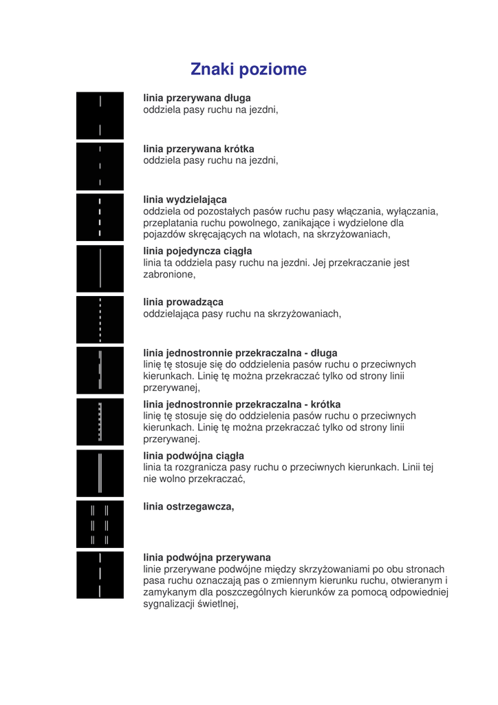Znaki poziome linia przerywana długa oddziela pasy ruchu na jezdni, linia przerywana krótka oddziela pasy ruchu na jezdni, linia wydzielaj ca oddziela od pozostałych pasów ruchu pasy wł czania, wył czania, przeplatania ruchu powolnego, zanikaj ce i wydzielone dla pojazdów skr caj cych na wlotach, na skrzy owaniach, linia pojedyncza ci gła linia ta oddziela pasy ruchu na jezdni. Jej przekraczanie jest zabronione, linia prowadz ca oddzielaj ca pasy ruchu na skrzy owaniach, linia jednostronnie przekraczalna - długa lini t stosuje si do oddzielenia pasów ruchu o przeciwnych kierunkach. Lini t mo na przekracza tylko od strony linii przerywanej, linia jednostronnie przekraczalna - krótka lini t stosuje si do oddzielenia pasów ruchu o przeciwnych kierunkach. Lini t mo na przekracza tylko od strony linii przerywanej. linia podwójna ci gła linia ta rozgranicza pasy ruchu o przeciwnych kierunkach. Linii tej nie wolno przekracza , linia ostrzegawcza, linia podwójna przerywana linie przerywane podwójne mi dzy skrzy owaniami po obu stronach pasa ruchu oznaczaj pas o zmiennym kierunku ruchu, otwieranym i zamykanym dla poszczególnych kierunków za pomoc odpowiedniej sygnalizacji wietlnej, linia kraw dziowa przerywana linia ta umieszczana jest przy kraw dzi jezdni. Oznacza ona, e nie wolno zatrzymywa si na jezdni wzdłu tej linii, ale wolno zatrzymywa si po przekroczeniu tej linii (np. na poboczu), linia kraw dziowa ci gła linia ta zabrania kieruj cemu zatrzymywania si zarówno na jezdni jak i na poboczu. Strzałki Znaki drogowe poziome w postaci strzałek mo emy podzieli na: • • strzałki kierunkowe, strzałki naprowadzaj ce. Strzałki kierunkowe umieszczane s na poszczególnych pasach ruchu na skrzy owaniach. Oznaczaj one, e przejazd przez skrzy owanie z pasa ruchu, na którym s umieszczone, jest dozwolony w kierunku wskazanym strzałk . Strzałki naprowadzaj ce oznaczaj , e pas ruchu, na którym s umieszczone, ko czy si lub w dalszej cz ci jest przeznaczony dla okre lonych pojazdów (np. autobusy). strzałka kierunkowa na wprost strzałka kierunkowa w lewo strzałka kierunkowa w prawo strzałka kierunkowa na wprost lub w lewo strzałka kierunkowa na wprost lub w prawo strzałka kierunkowa w lewo lub w prawo strzałka kierunkowa na wprost, w lewo lub w prawo strzałka naprowadzaj ca w lewo strzałka naprowadzaj ca w prawo przej cie dla pieszych oznacza miejsce na jezdni, które jest przeznaczone dla pieszych chc cych przej na drug stron jezdni, przejazd dla rowerzystów oznacza miejsce na jezdni, które jest przeznaczone dla rowerzystów chc cych przejecha na drug stron jezdni, linia bezwzgl dnego zatrzymania - stop linia ta wskazuje miejsce zatrzymania pojazdu przed skrzy owaniem. Stosuje si j razem ze znakiem drogowym pionowym Stop, linia warunkowego zatrzymania zło ona z prostok tów linia ta wskazuje miejsce zatrzymania pojazdu np. na skrzy owaniu z sygnalizacj wietln przed przej ciem dla pieszych wyposa onym w sygnalizacj wietln , linia warunkowego zatrzymania zło ona z trójk tów linia ta wskazuje miejsce zatrzymania pojazdu przed skrzy owaniem. Stosuje si j wraz ze znakiem drogowym pionowym Ust p pierwsze stwa przejazdu, trójk t podporz dkowania mo e on by stosowany dodatkowo do znaku pionowego Ust p pierwsze stwa przejazdu lub linia warunkowego zatrzymania, zło ona z trójk tów, je eli zastosowano znak drogowy pionowy Ust p pierwsze stwa przejazdu. napis STOP mo e by stosowany dodatkowo do znaku pionowego Stop lub linia bezwzgl dnego zatrzymania - stop, je li zastosowano znak drogowy pionowy Stop, linia przystankowa znak ten wskazuje długo odcinka drogi, na którym zabrania si zatrzymywania pojazdów nie b d cych pojazdami komunikacji publicznej, stanowisko postojowe znak ten wskazuje sposób parkowania pojazdów. Zakazuje on równie parkowania obok, linia wyznaczaj ca pas postoju znak ten wskazuje miejsce na jezdni, przeznaczone do parkowania pojazdów, koperta znak ten wskazuje miejsce przeznaczone do parkowania tylko niektórych pojazdów ustalonych przez terenowy oddział administracji. Postój innych pojazdów jest zabroniony, powierzchnia wył czona z ruchu o liniowaniu prostym linie te oznaczaj odcinek drogi wył czony z ruchu drogowego, powierzchnia wył czona z ruchu o liniowaniu łamanym linie te oznaczaj odcinek drogi wył czony z ruchu drogowego, bus oznacza, e pas jezdni, na którym jest on namalowany przeznaczony jest tylko dla komunikacji publicznej, rower znak ten oznacza, e droga lub pas jezdni jest przeznaczony tylko do ruchu rowerów jedno ladowych.