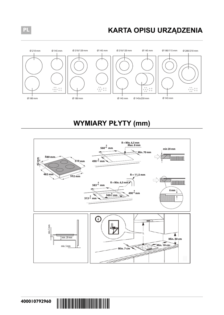 PL KARTA OPISU URZĄDZENIA Ø 210 mm Ø 145 mm Ø 210/120 mm Ø 145 mm Ø 180 mm Ø 180 mm Ø 145 mm Ø 210/120 mm Ø 145x250 mm Ø 145 mm Ø 180/115 mm Ø 145 mm WYMIARY PŁYTY (mm) 0 560+2 mm R = Min. 6,5 mm Max. 8 mm 42 mm Min. 70 mm 580 mm 510 mm 482 mm min 20 mm 0 490 +2 mm R = 11,5 mm 552 mm 0 583 +2 mm R = Min. 6,5 mm 0 0 mm 560+2 mm 490+2 mm 6 mm min. 5 mm 0 513 +2 min. 20 mm min. 5 mm 400010792960 Min. 40 cm Min. 7 cm Min. 10 cm Ø 280/210 mm C D E A B F A WŁ./WYŁ. D Blokada przycisków B Wybór strefy grzewczej i programatora czasowego F Aktywacja/dezaktywacja kilku stref (jeśli ta opcja jest dostępna) C-E H Zwiększenie i zmniejszenie ustawienia mocy grzania Przed pierwszą instalacją przez około 1 sekundę panel sterowania przeprowadza test działania, a następnie automatycznie włączana jest funkcja "Blokada przycisków". Aby dezaktywować tę funkcję, naciśnij i przytrzymaj przycisk "D". Zostanie wyemitowany sygnał dźwiękowy, a następnie zgaśnie odpowiednia dioda led. UWAGA: W przypadku resetowania należy powtórzyć procedurę opisaną powyżej. Aby włączyć płytę, naciśnij przycisk "A" i przytrzymaj przez około 2 sekundy. Na 4 strefach grzewczych zostanie wyświetlony symbol "0". Jeśli w ciągu 20 sekund żadna strefa grzewcza nie zostanie aktywowana, ze względów bezpieczeństwa płyta automatycznie wyłączy się. Naciśnij jeden z przycisków "B" odpowiadający strefie grzewczej, która ma być używana. Przy użyciu przycisku "E" lub "C" wybierz wymagane ustawienie mocy grzania. Ustawienie mocy grzania można wybrać w zakresie od 1 do 9. Aby anulować wszystkie ustawienia, naciśnij jednocześnie przyciski +/-. Naciśnięcie przycisku "+" po osiągnięciu poziomu 9 powoduje aktywację funkcji "Silne podgrzewanie" i pojawienie się litery "A" na wyświetlaczu. WAŻNE: sterowanie jest dezaktywowane po 10 sekundach od wyboru ustawienia mocy grzania. Aby zmienić ustawienie mocy grzania, ponownie naciśnij przycisk wyboru "B", a następnie zmień ustawienie przy użyciu przycisku "E" lub "C". KILKA STREF (jeśli ta opcja jest dostępna): Po wybraniu żądanej strefy i ustawieniu poziomu (jak to zostało opisane w poprzedniej części) naciśnij przycisk "F": zaświeci wskaźnik nad przyciskiem i zostanie aktywowana dodatkowa strefa. Kilka stref może być używane wyłącznie w następujących sytuacjach: 1) Strefa grzewcza umożliwia użycie kilku stref; 2) Został wybrany poziom mocy większy niż 0. Aby dezaktywować kilka stref, naciśnij przycisk "B" odpowiedni dla żądanej strefy, a następnie ponownie naciśnij przycisk "F". Aby ustawić funkcję programatora czasowego, wybierz żądaną strefę grzewczą i ustawienie mocy, a następnie ponownie naciśnij przycisk strefy grzewczej, co spowoduje zaświecenie kropki na wyświetlaczu strefy grzewczej sterowanej przez programator czasowy. Na 2 wyświetlaczach zacznie migać wskazanie "00". Przy użyciu przycisku "C" lub "E" ustaw czas w zakresie od 1 do 99. WAŻNE: po 10 sekundach na wyświetlaczu pojawi się ustawienie mocy grzania pozostałych stref grzewczych. Aby wyświetlić pozostały czas gotowania, naciśnij dwukrotnie przycisk strefy grzewczej sterowanej przez programator czasowy. Funkcję BLOKADA PRZYCISKÓW włącza się przez naciśnięcie i przytrzymanie przycisku "D" do momentu zaświecenia kropki nad przyciskiem funkcji. Funkcja "Blokada przycisków" blokuje wszystkie funkcje płyty z wyjątkiem przycisku WŁ./WYŁ. "A". Funkcja pozostaje aktywna nawet po wyłączeniu i włączeniu płyty. Funkcję można dezaktywować przez ponowne naciśnięcie przycisku "D" aż do momentu zgaśnięcia kropki nad przyciskiem funkcji. WSKAŹNIK WYSOKIEJ TEMPERATURY Po wyłączeniu strefy grzewczej wskaźnik wysokiej temperatury "H" świeci lub miga naprzemiennie z symbolem "0", aż temperatura płyty spadnie do bezpiecznego poziomu. WAŻNE: Zabezpieczenia płyty obejmują funkcję automatycznego wyłączania. Długotrwałe korzystanie z tego samego ustawienia mocy grzania powoduje automatyczne wyłączenie strefy grzewczej (na przykład po około 1 godzinie korzystania z maksymalnego ustawienia mocy grzania następuje wyłączenie strefy grzewczej). ZACHOWAJ OSTROŻNOŚĆ: Aby uniknąć trwałego uszkodzenia szklano-ceramicznej powierzchni płyty, nie używaj: - Naczyń, których dno nie jest idealnie płaskie. - Metalowych naczyń z emaliowanym dnem. Wady estetyczne (zarysowania, ślady na powierzchni itp.) należy zgłaszać bezpośrednio przed instalacją.